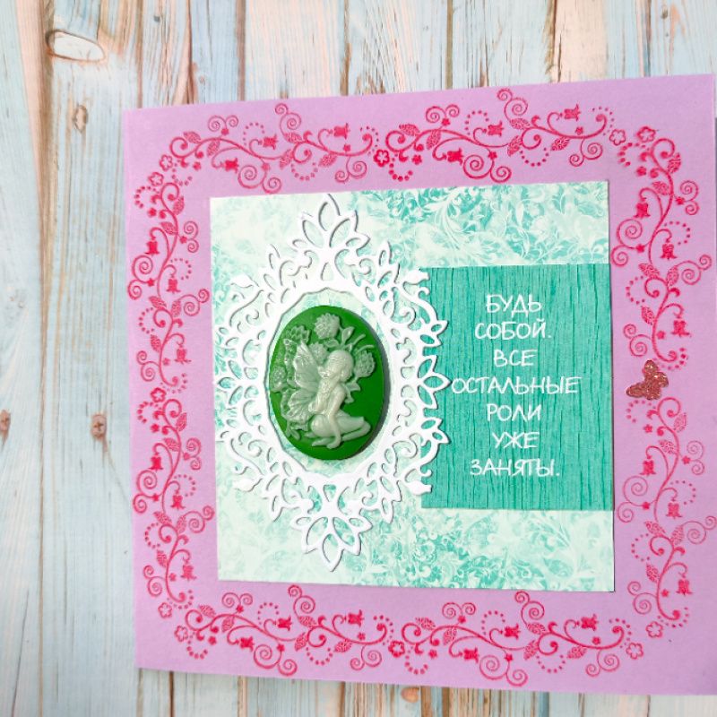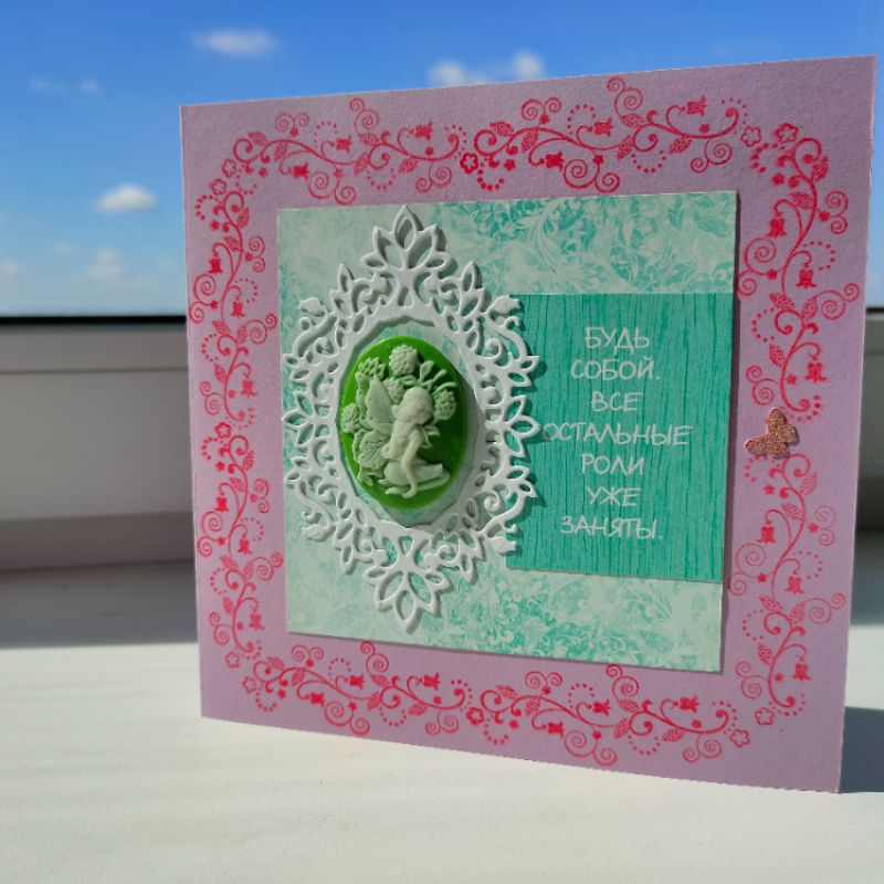 Листівка ручної роботи, прикрашена ажурною рамочкою, камеєю і мудрим напуттям