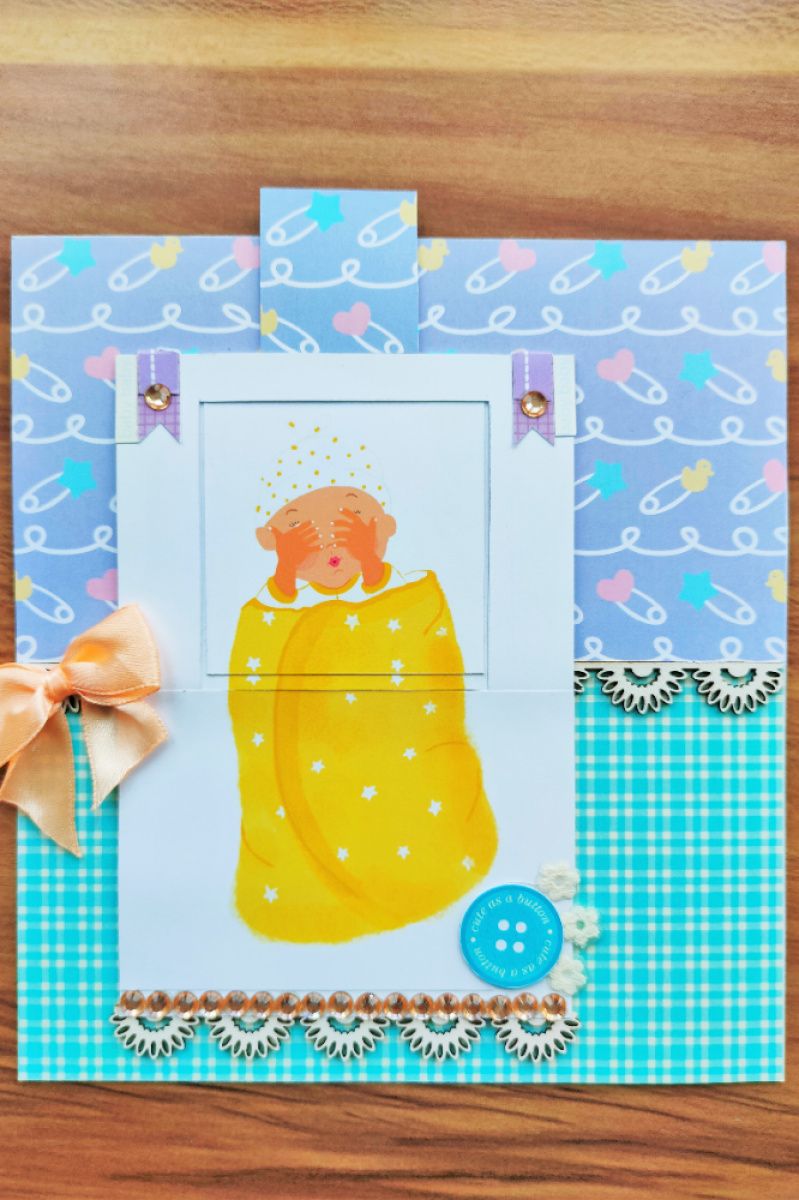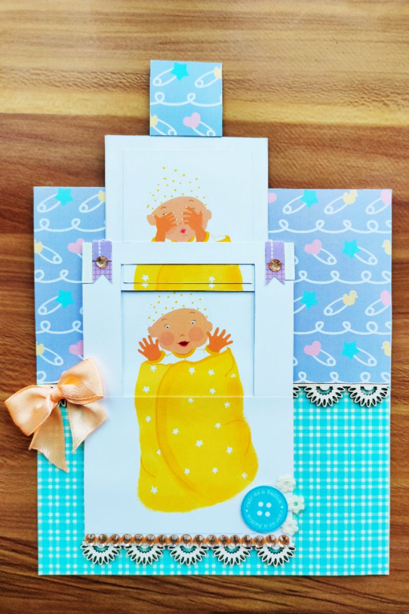 Листівка ручної роботи із секретом: висувним елементом, прикрашена мереживом-чіпбордом