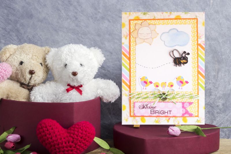 Листівка ручної роботи, виготовлена з дизайнерського картону і дизайнерського паперу, прикрашена гудзичком, бантиком і дерев'яною бджілкою.