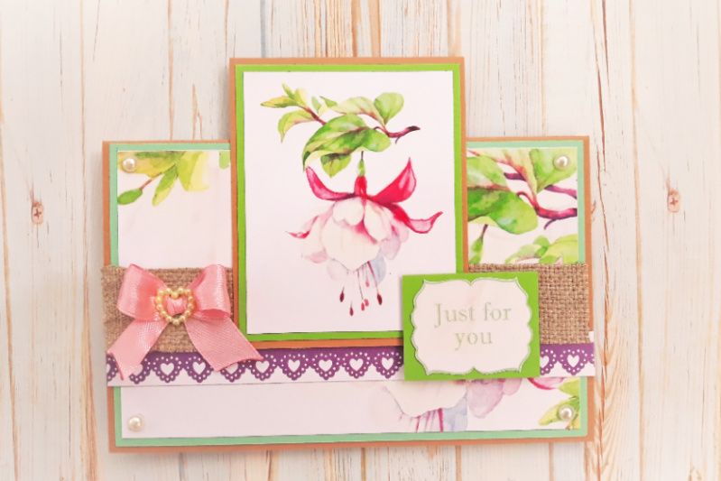 Листівка ручної роботи, прикрашена бантиком та бусинами