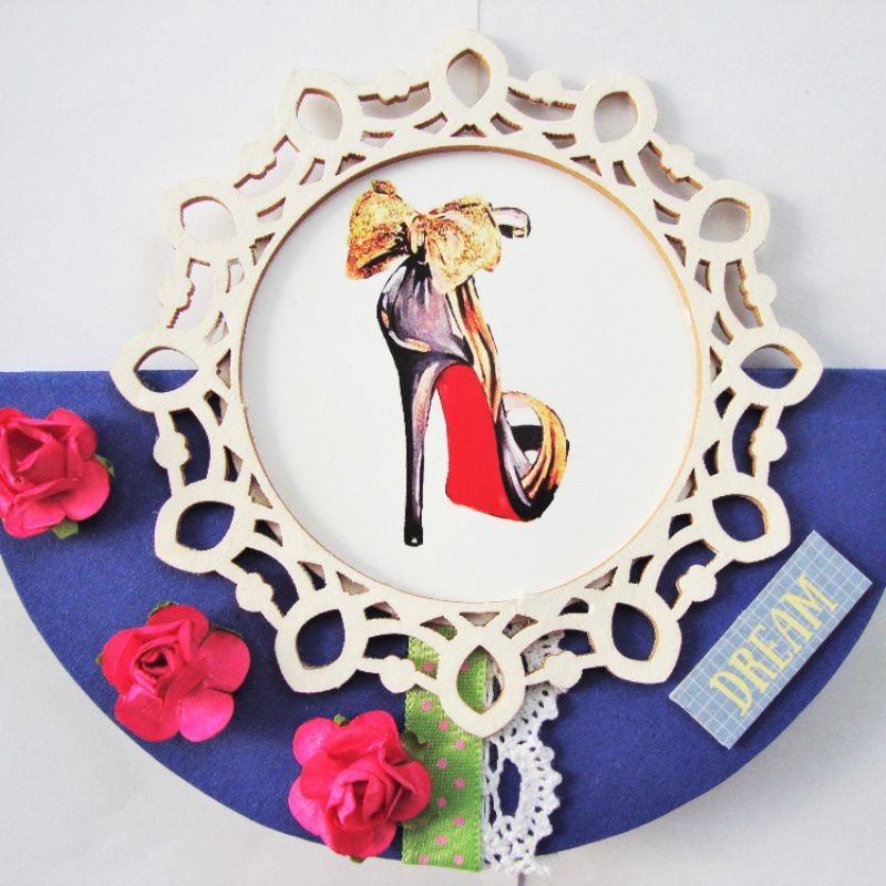 Листівка ручної роботи, виготовлена з дизайнерського картону, основа - коло зігнутий навпіл, прикрашена мереживом і дерев'яним чіпбордом