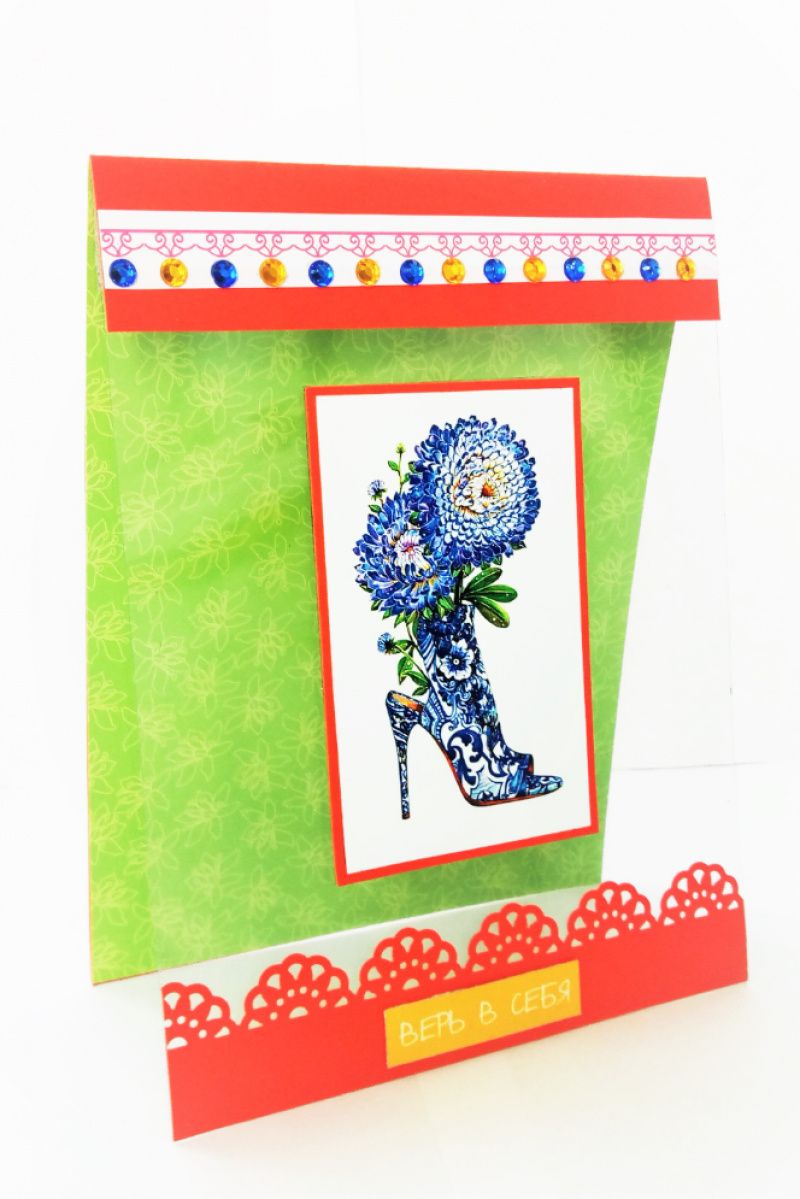 Листівка ручної роботи, виготовлена з дизайнерського картону і дизайнерського паперу, з використанням прозорого листа, прикрашена стразами
