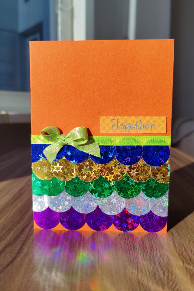 Листівка ручної роботи, прикрашена кружечками-голограмами