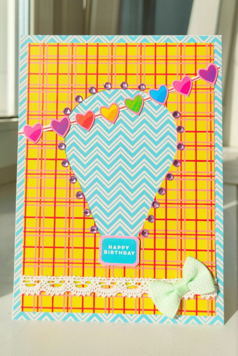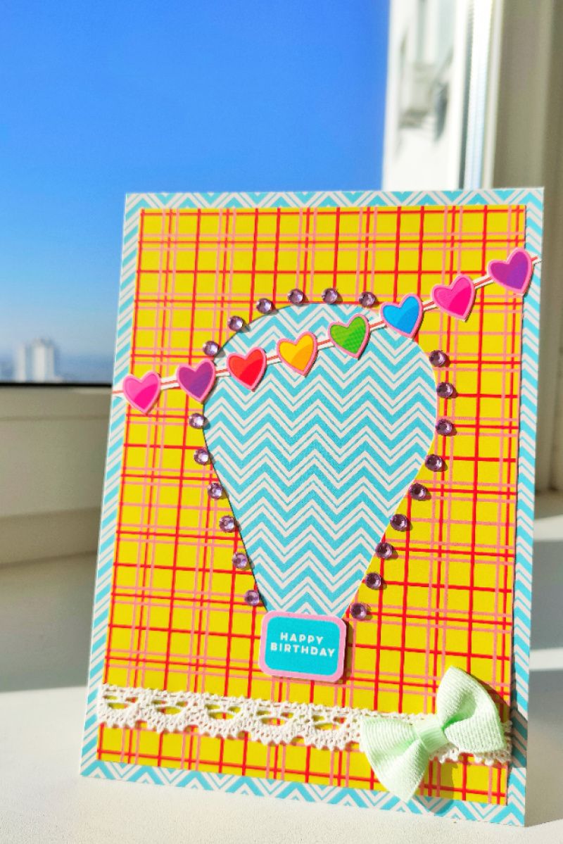 Листівка ручної роботи, виготовлена з дизайнерського картону і дизайнерського паперу, прикрашена стразами, мереживом і бантиком