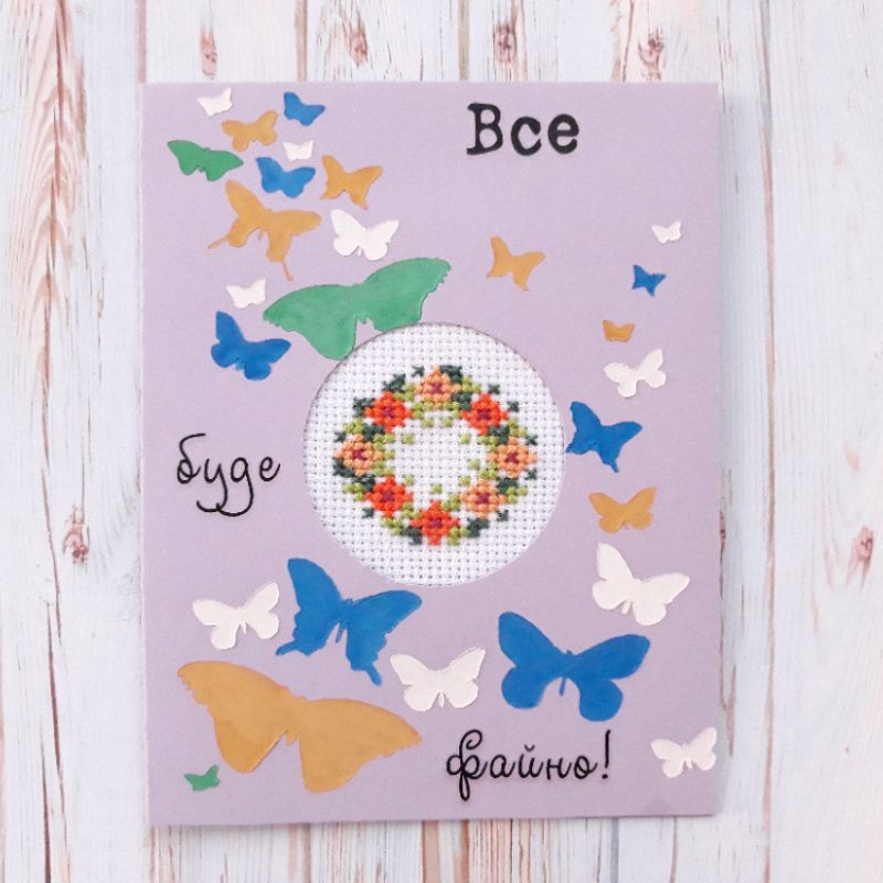Листівка ручної роботи: вишивка хрестиком вставлена в заготовку з дизайнерського картону (виготовлена вручну)