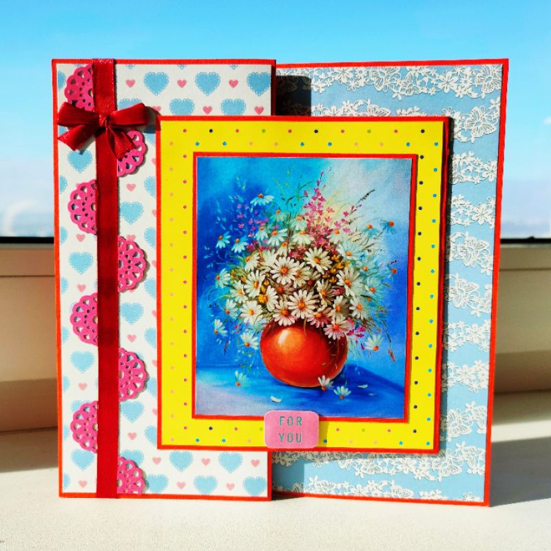 Листівка ручної роботи, виготовлена з дизайнерського картону та дизайнерського паперу, з глітер ефектом (серця переливаються)