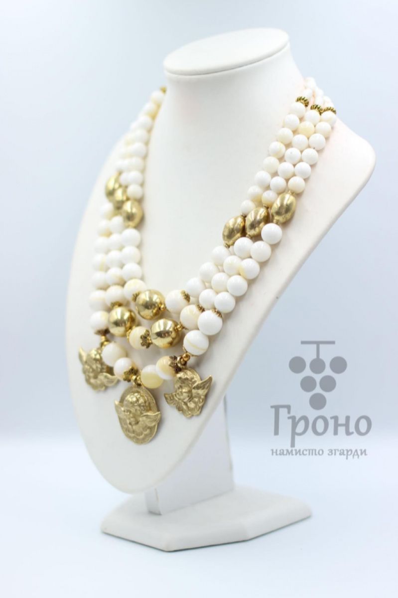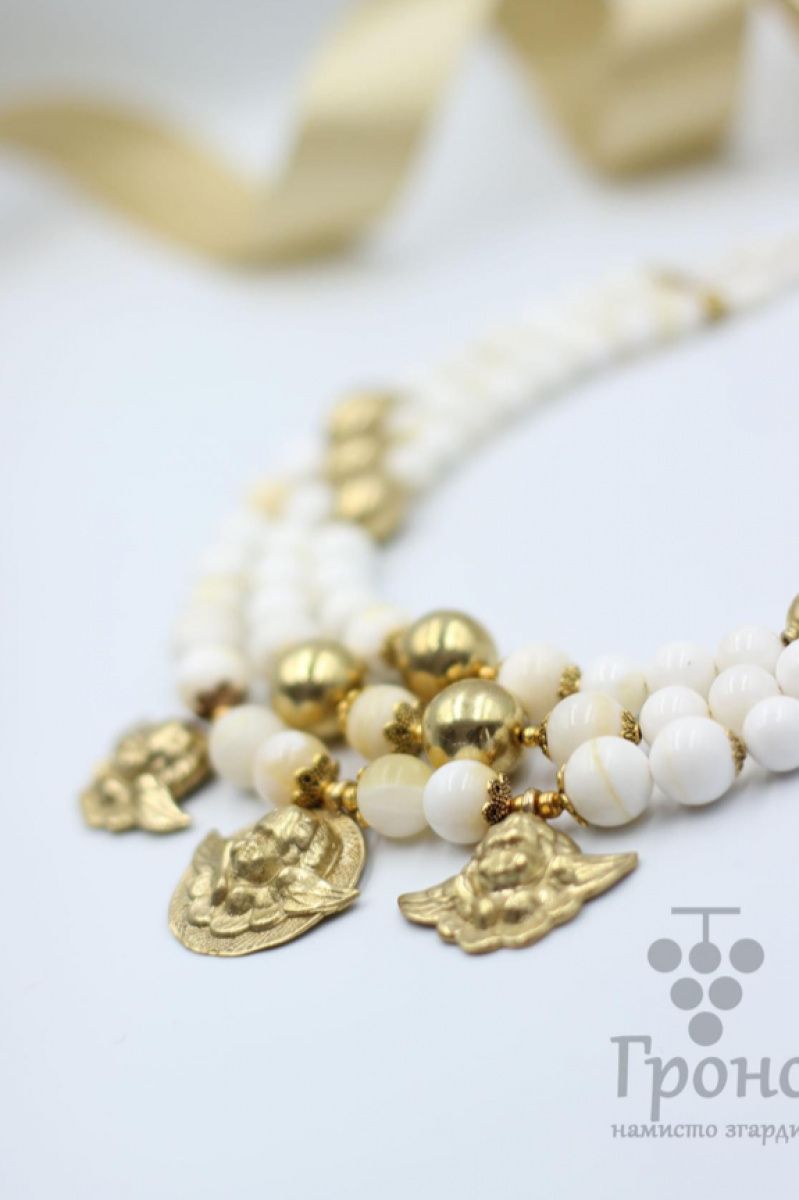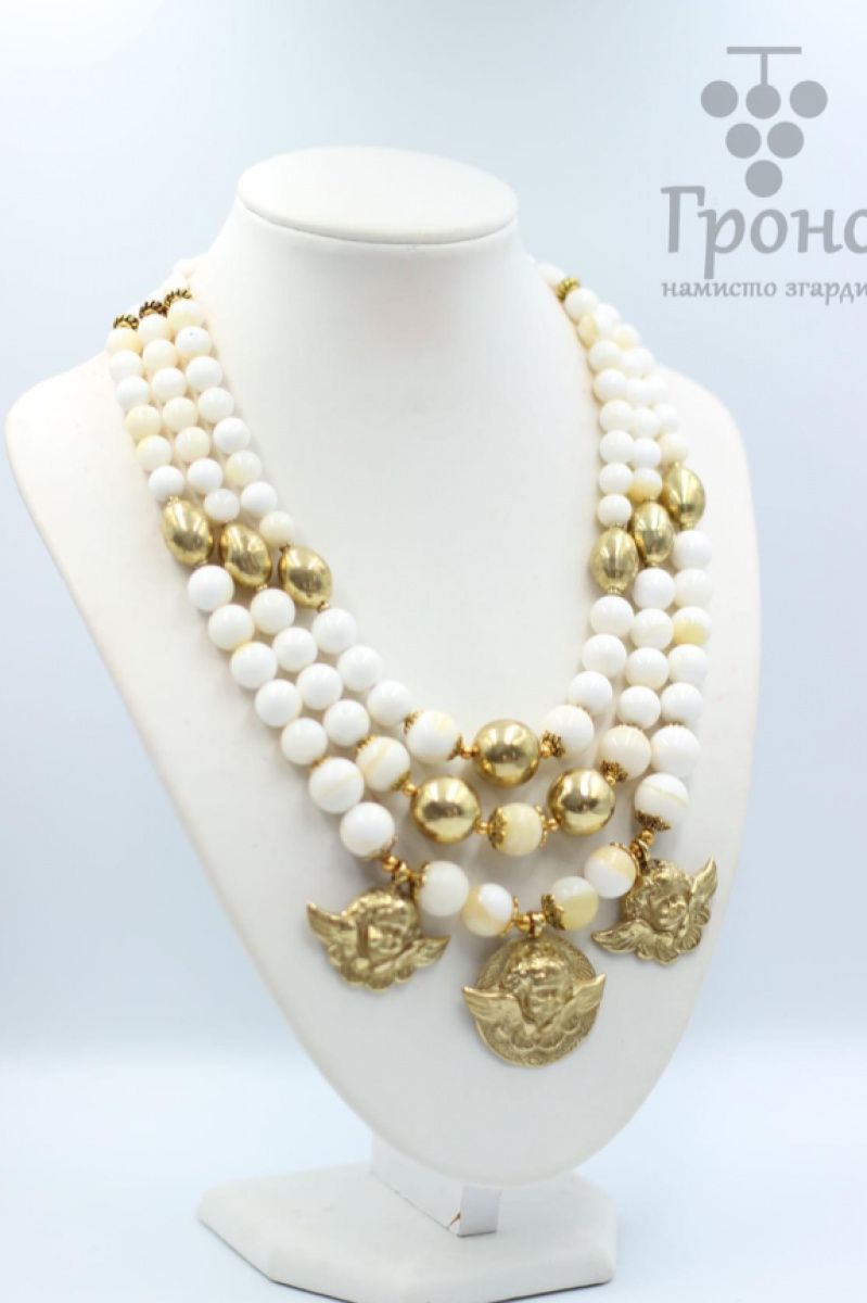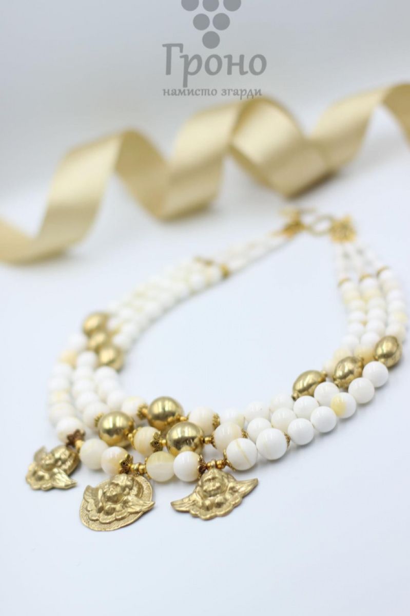 перламутр з карамельними вкрапленнями, латунні намистини ручної роботи, авторські підвіси латунь, фурнітура під античне золото. Довжина найкоротшої низки 42 см.