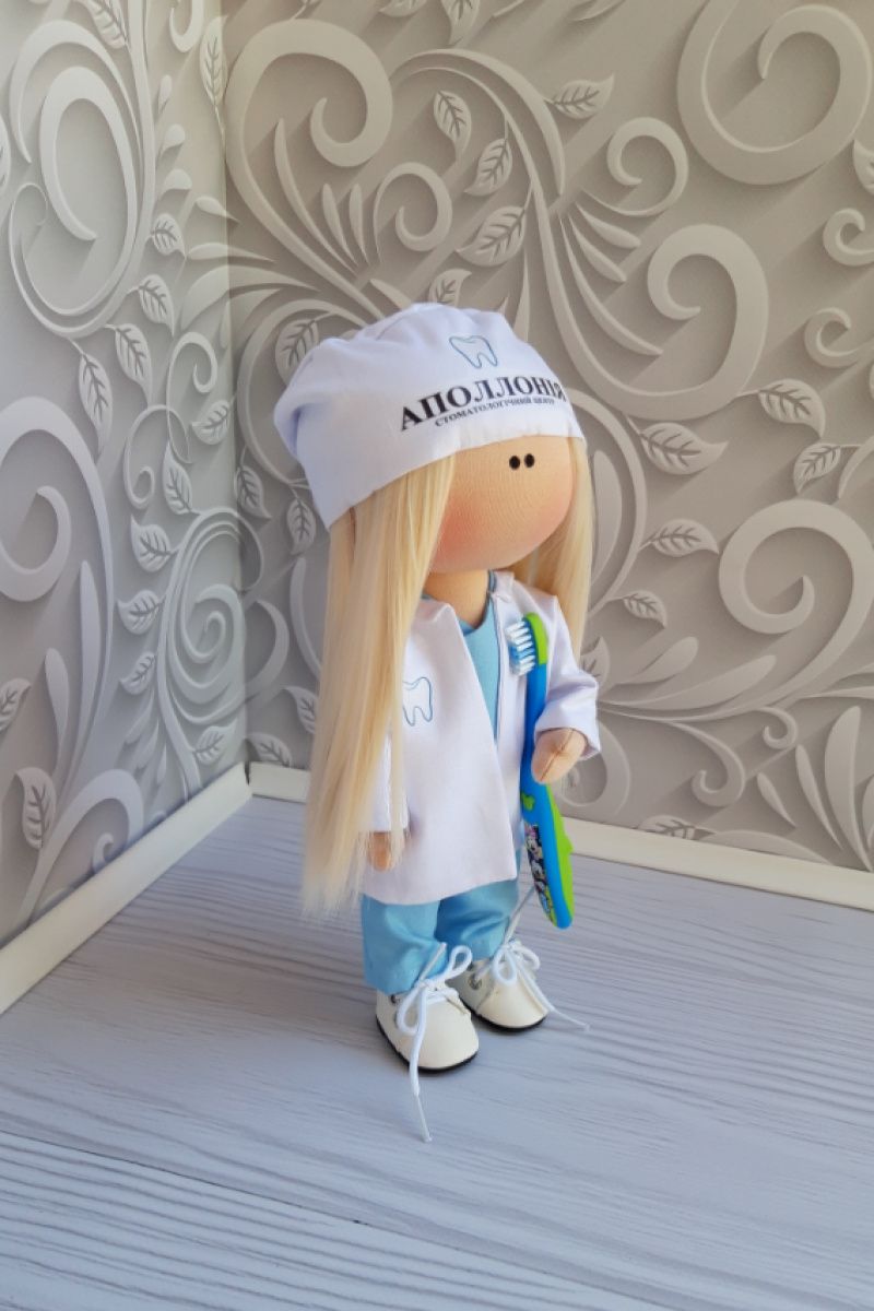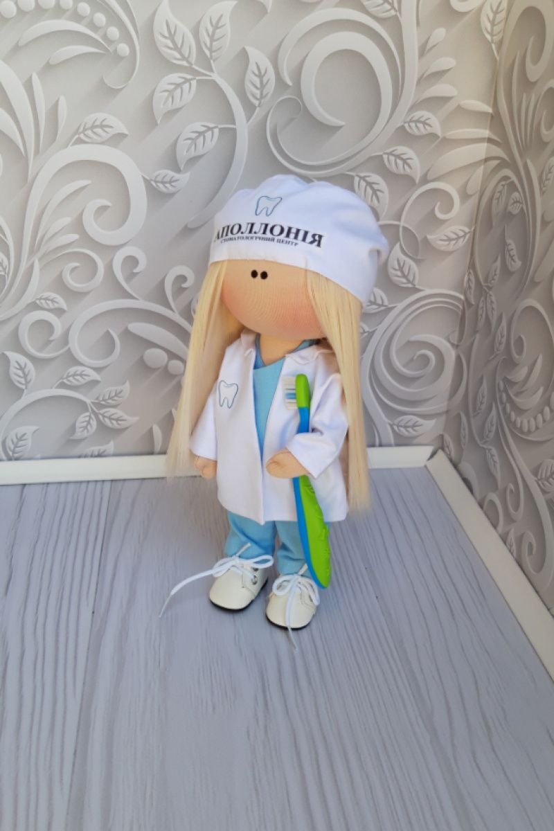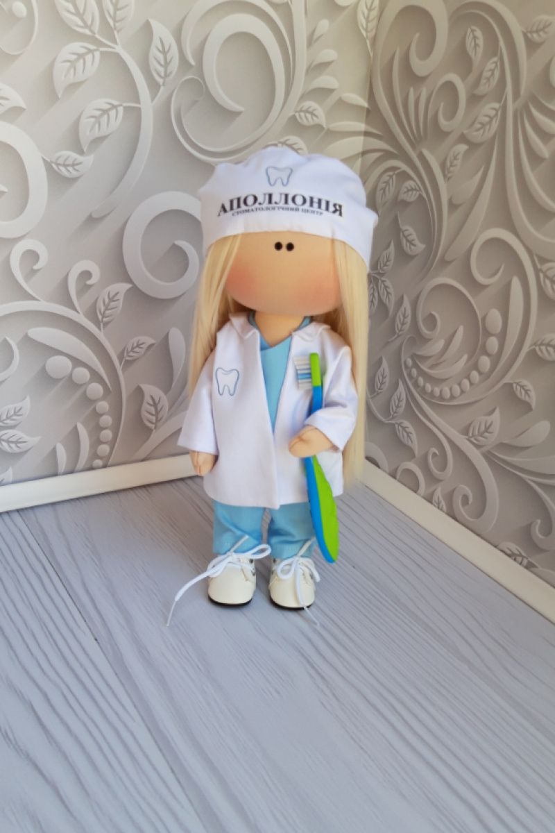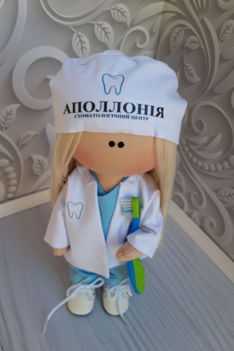 Тематична текстильна лялька - чудовий подарунок для знайомих чи друзів - лікарів (терапевтів, хірургів, стоматологів, медсестер і т.д.). Додатково укомплектовується фонендоскопом, термометром та іншим медичним реквізитом. Написи на халаті та шапочці - за бажанням замовника.