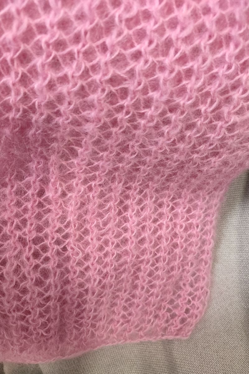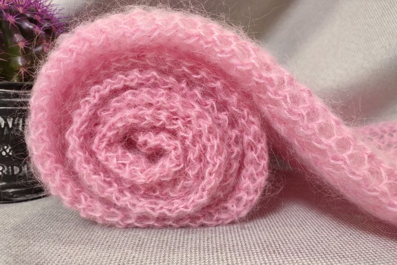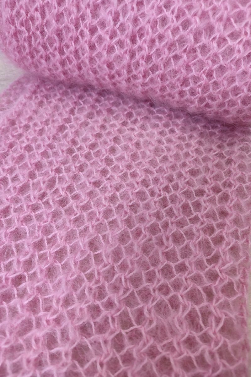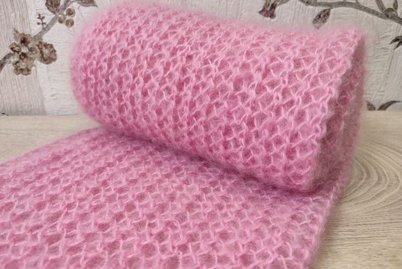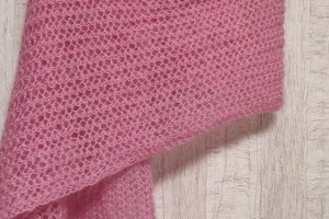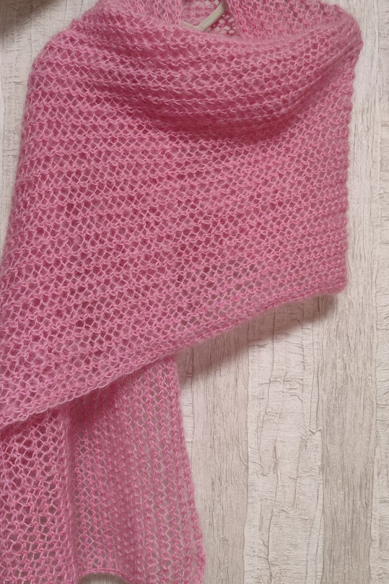 Палантин зв'язаний спицями гарною та ніжною вязкою. По при те,що вязка у дирочки не робить його холодним, так як вони заповнюються шерстю. Розміри палантину дозволяють вкутатись ним та утеплитись.