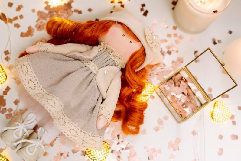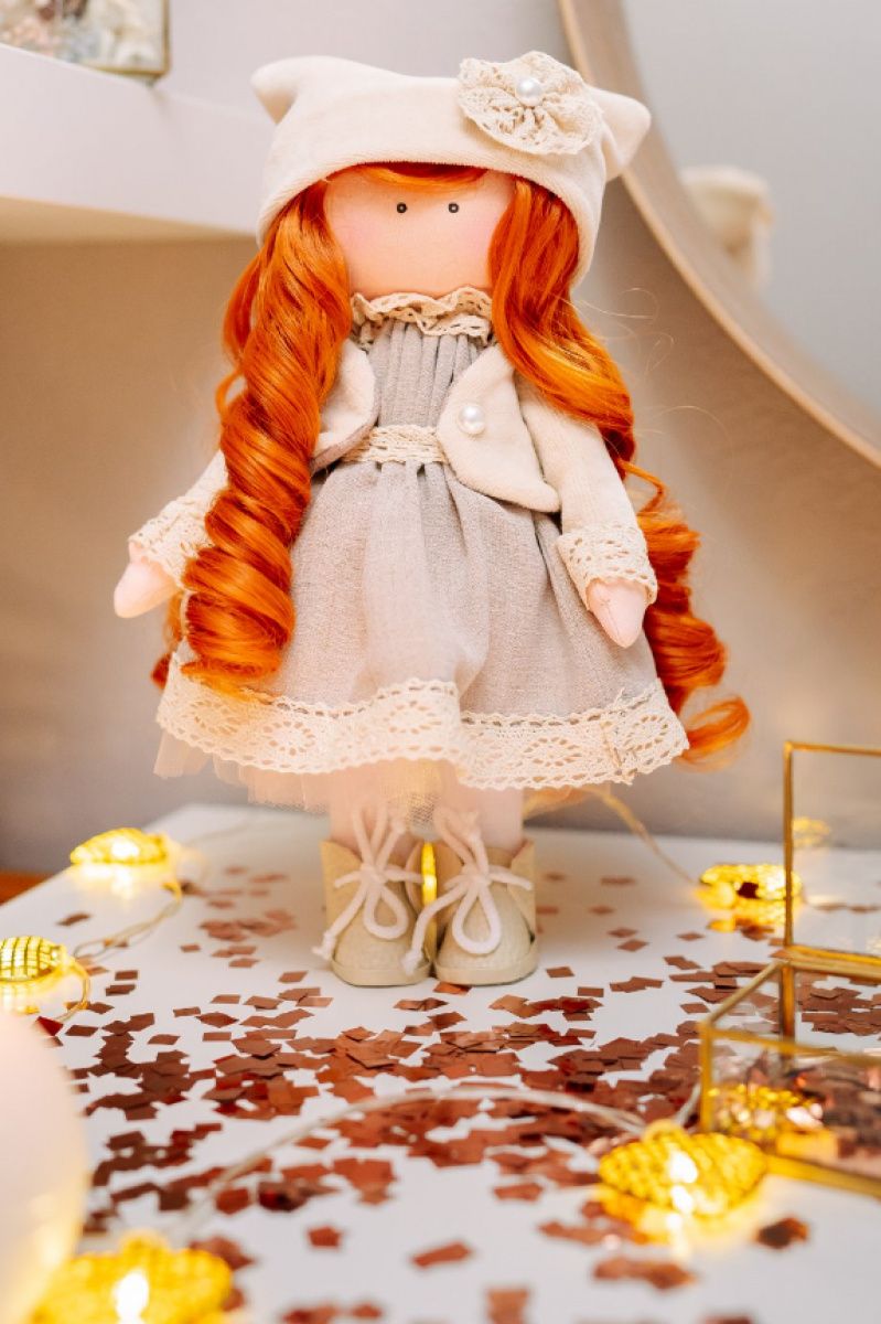Рудоволоса лялька Евеліна, виконана в бежевих відтінках