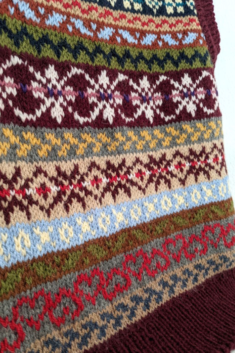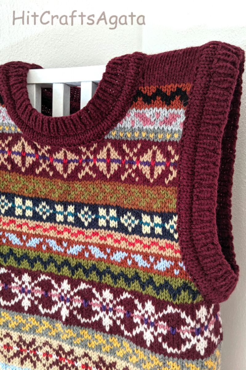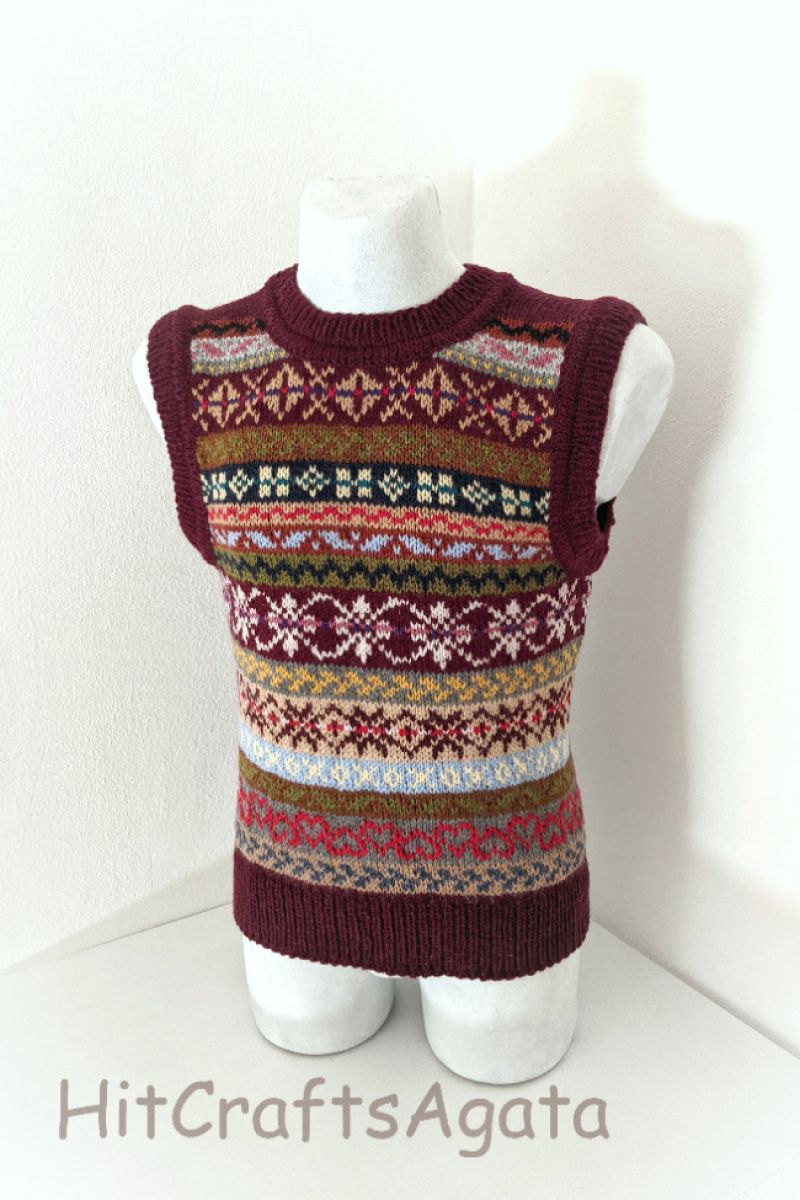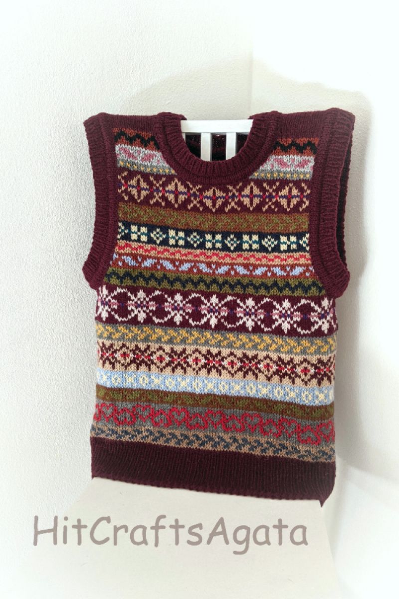 Жилет ручної роботи з орнаментом. Зв'язаний спицями, по колу, без швів у традиційній ісландській техніці fair isle. Подвійна обробка країв.