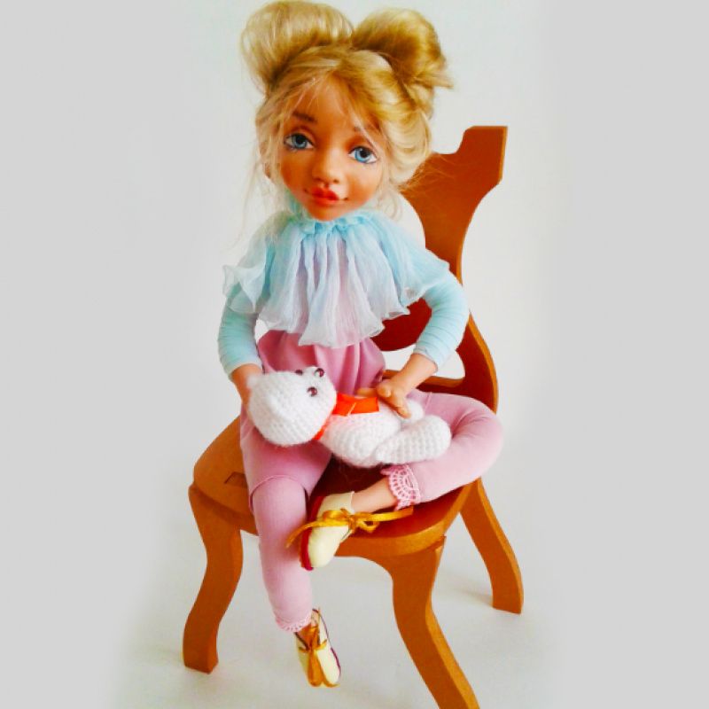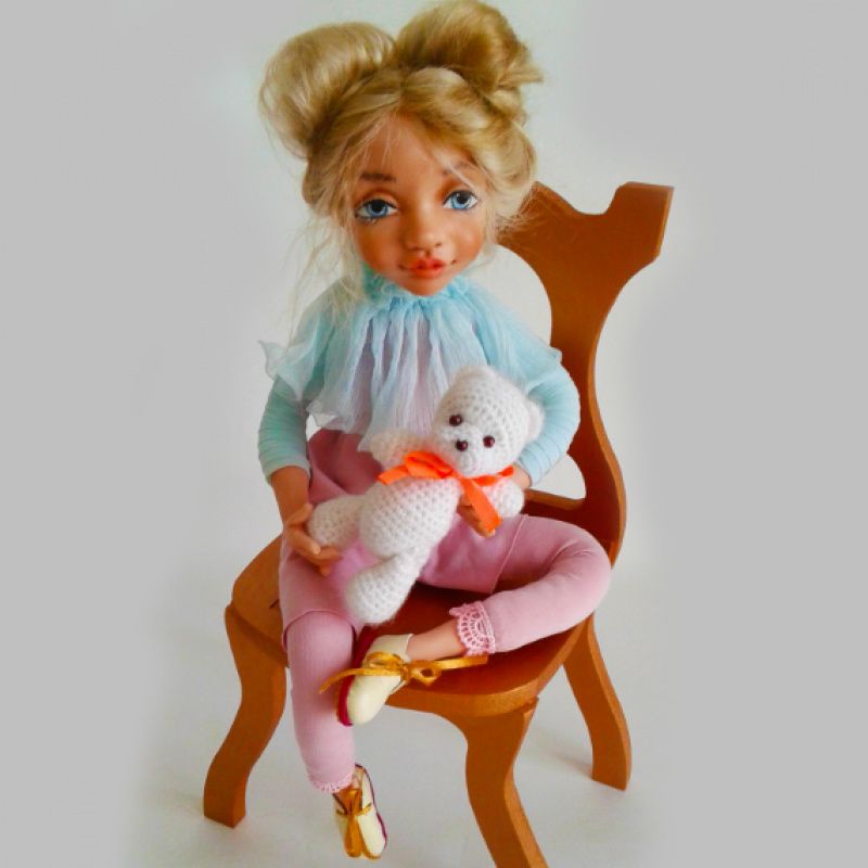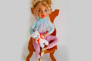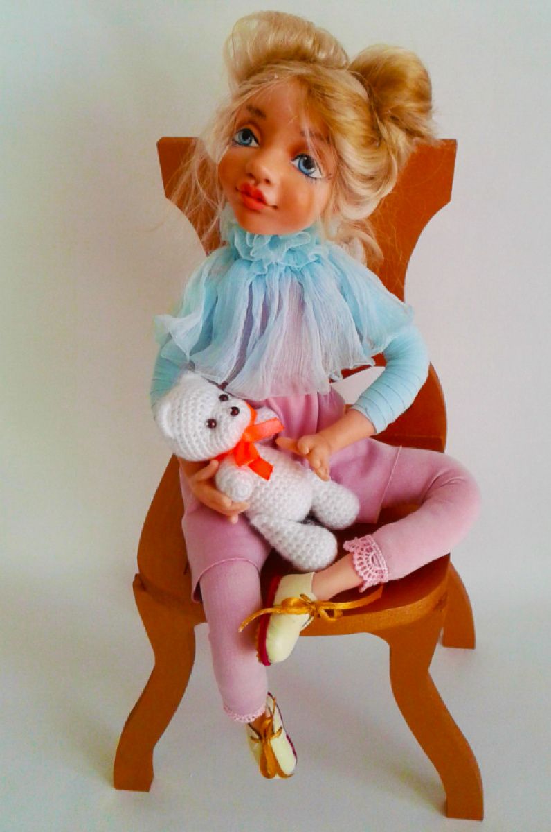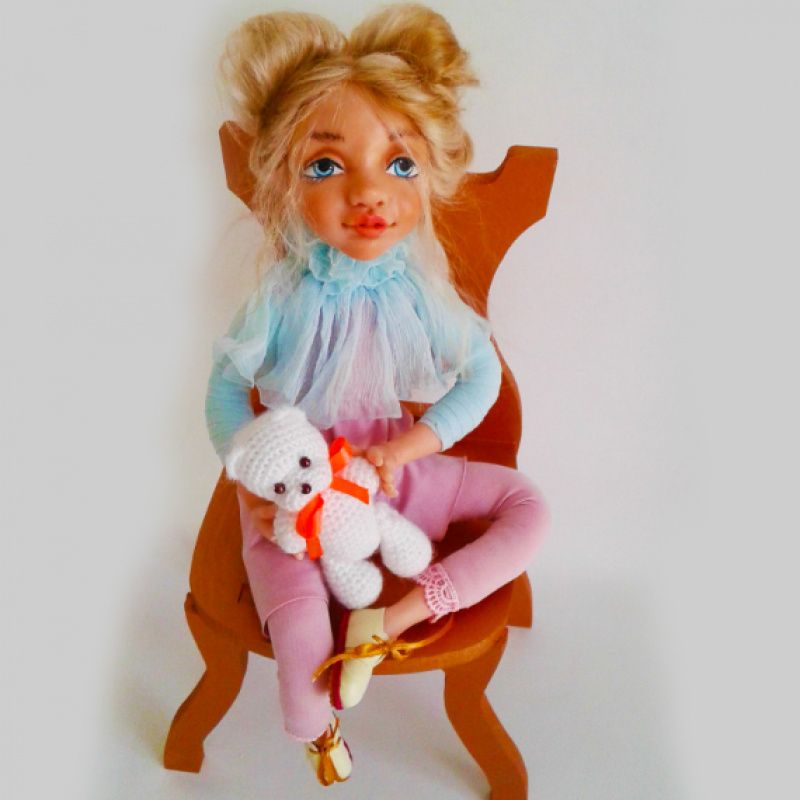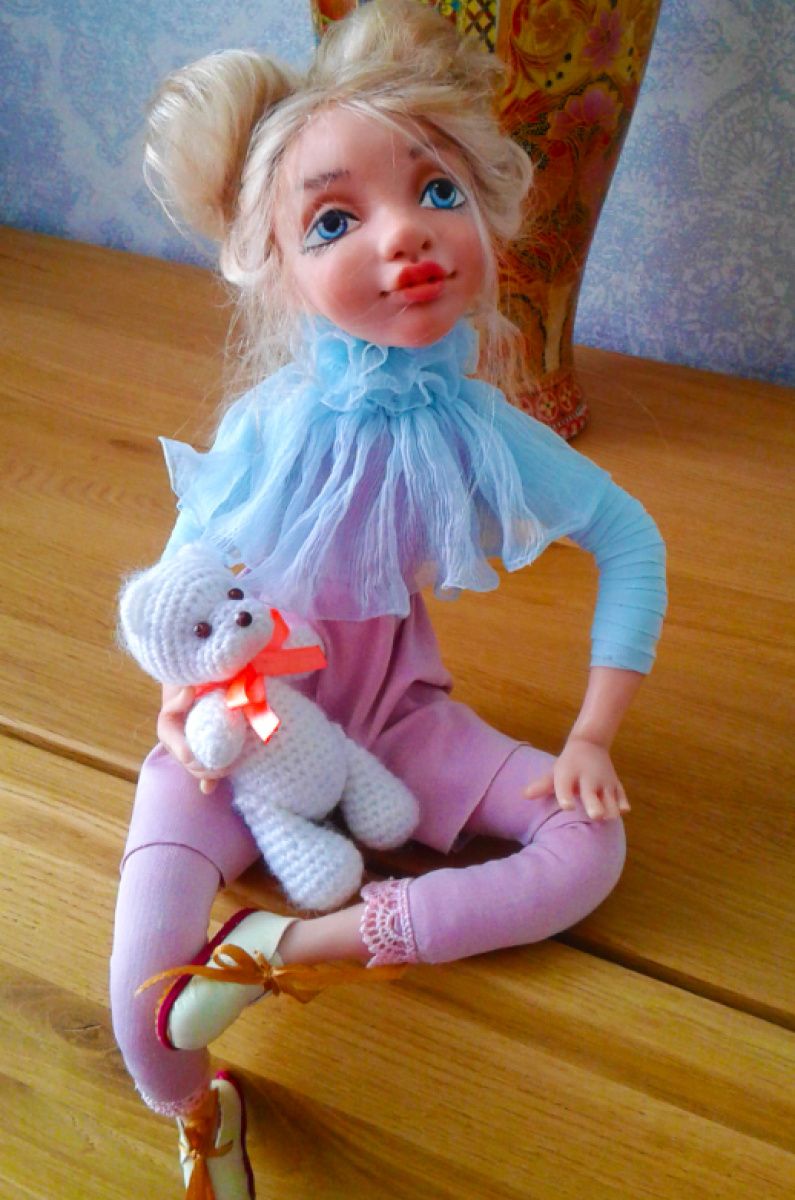 Сувенірна лялька - прикраса інтер'єру. Колекційна лялька виготовлена в змішаній техніці. Лялька ручної роботи. Лялька з полімерної глини для домашнього декору. Скульптурна лялька з ведмедиком. Лялька знаходиться в сидячому положенні. Лялька. Колекційна лялька. Ніжна дівчинка стане чудовою прикрасою інтер'єру. Лялька, що притягає погляд. Створена за принципом будуарній ляльки. Голова, руки і ноги виготовлені з професійної лялькової глини LivingDoll. Висота ляльки в положенні сидячи 30 см. Розписана лялька: пастель, акварель, акрил. Волосся з ангорського хутра.