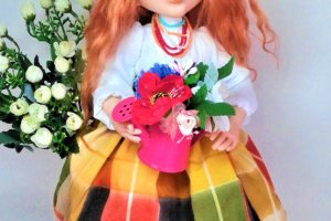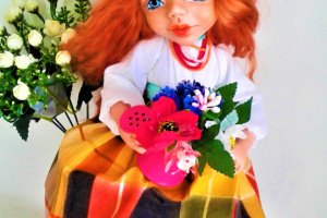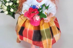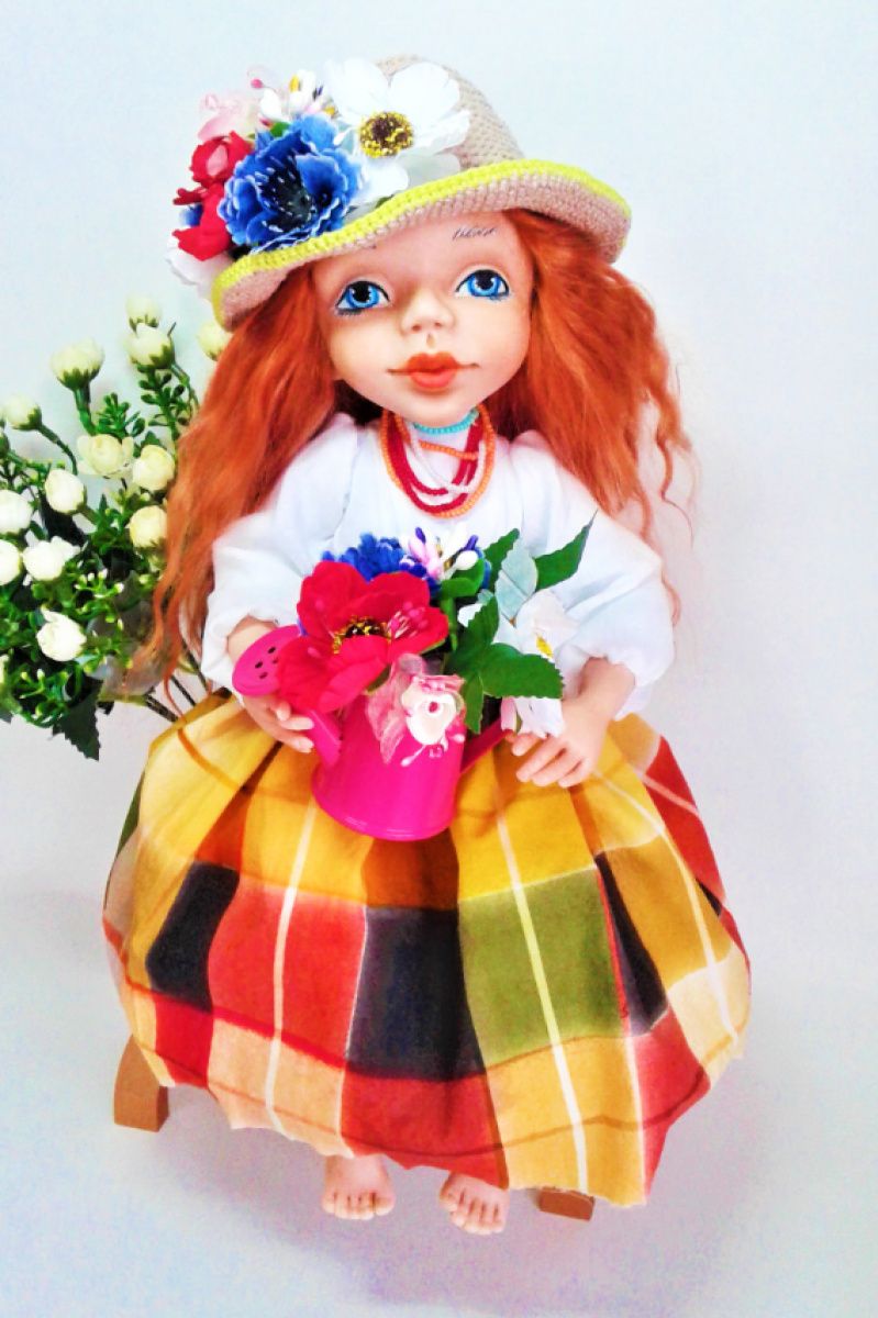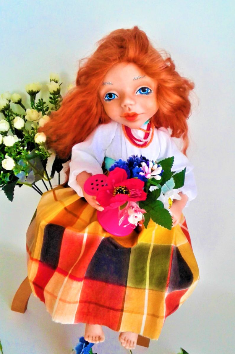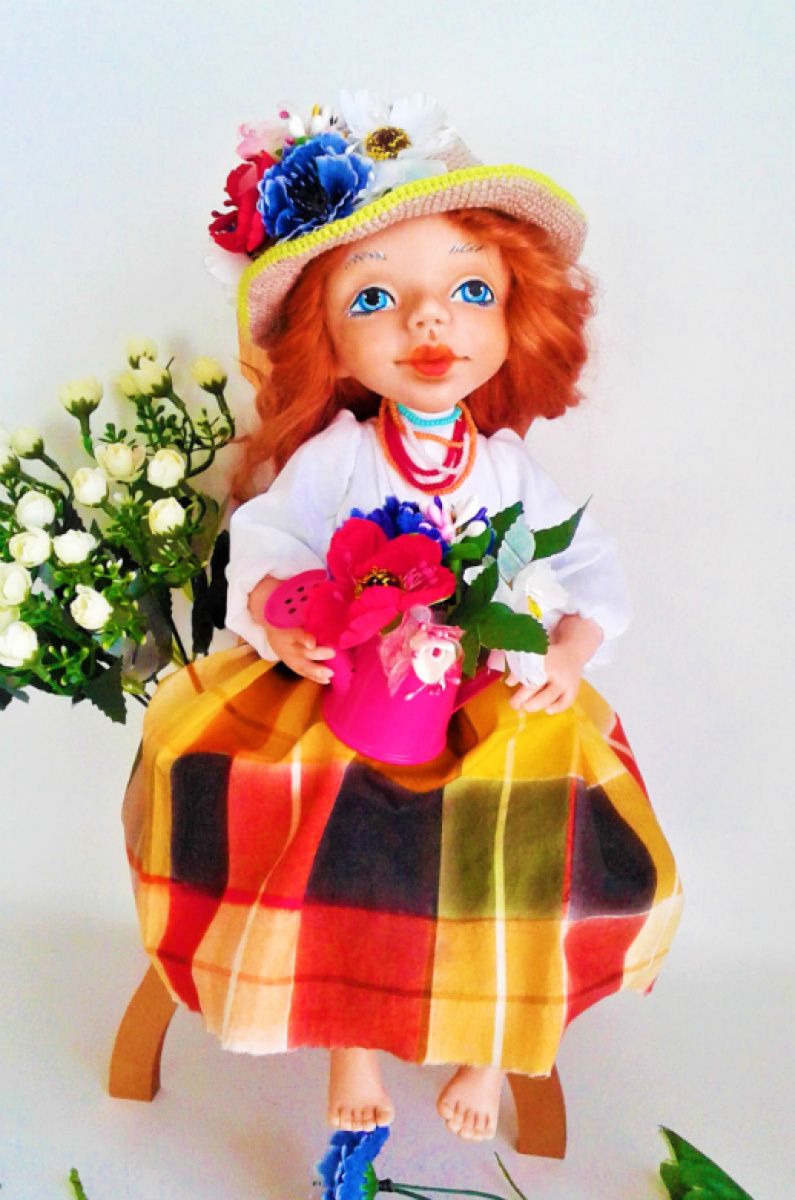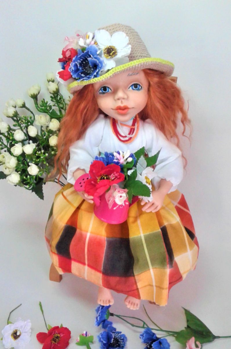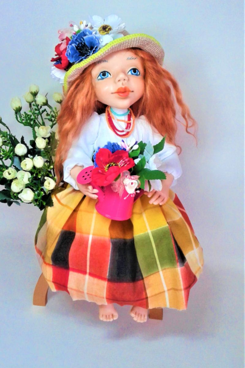 Сувенірна лялька - прикраса інтер'єру. Колекційна лялька виготовлена в змішаній техніці. Лялька ручної роботи. Лялька з полімерної глини для домашнього декору. Скульптурна лялька-квіткарка. Лялька знаходиться в сидячому положенні. Ніжна дівчинка стане чудовою прикрасою інтер'єру. Лялька, що притягає погляд. Створена за принципом будуарній ляльки. Голова, руки і ноги виготовлені з професійної лялькової глини LivingDoll. Висота ляльки в положенні сидячи 30 см. Розписана лялька: пастель, акварель, акрил. Волосся з ангорського хутра.