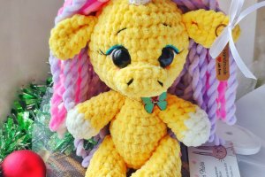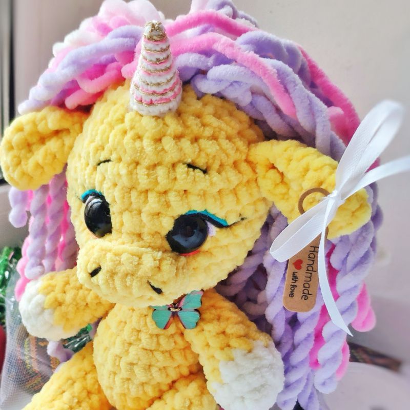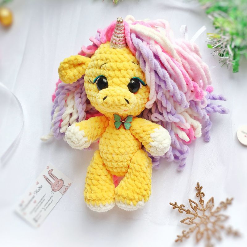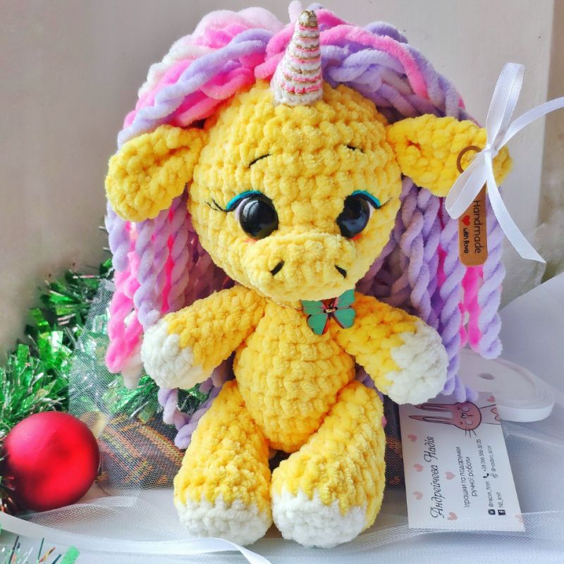 Єдиноріжка виконана з м'якої плюшевої пряжі.