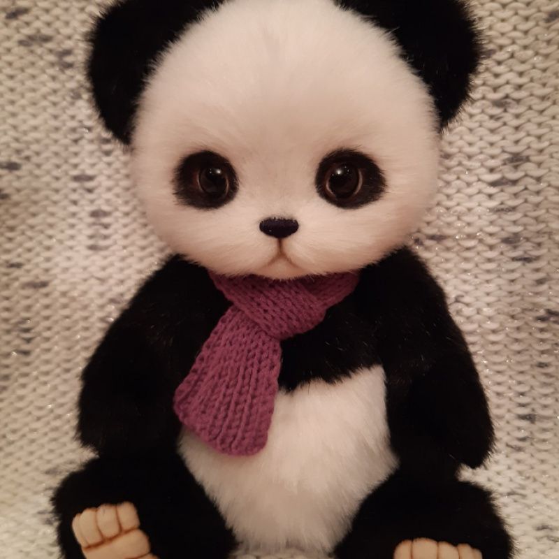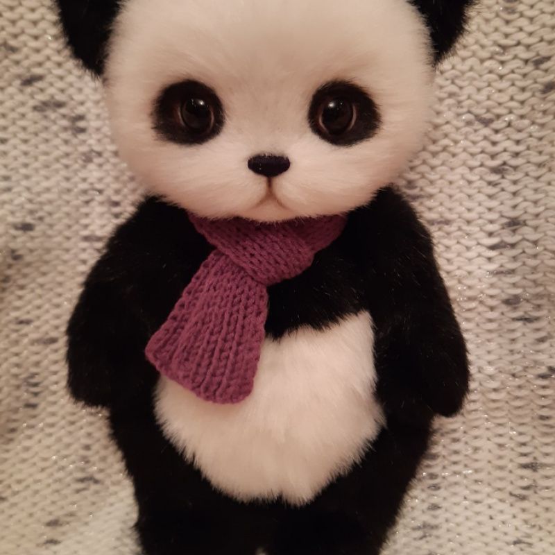 пандочка ручної роботи, зшита зі штучного хутра норки, зростання 26 см, голова і лапки рухливі (на шплінтовом кріпленні), на підошвах вишиті і затоновані пальчики, шарфик пов'язаний з хб пряжі.