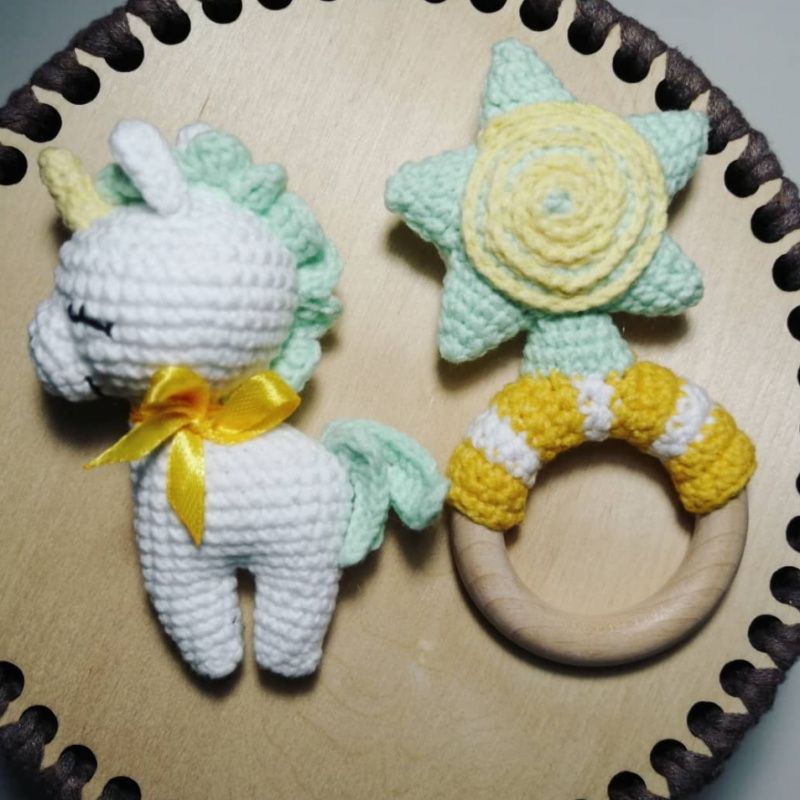 Прекрасний казковий набір для новонародженої принцеси. У набір входить в'язана іграшка Единорожки і гризун - брязкальце у вигляді зірочки. Гризун складається з дерев'яного кільця (дерево бук - якість відмінна, гладко відшліфовано, нічим не вкрите, спеціально для малюків) і в'язаній зірочки, всередині якої знаходиться наповнювач холлофайбер і спеціальна шайба брязкальце (звучить приємно, не голосно). Такий набір неодмінно порадує дитини і скрасить його дозвілля.
