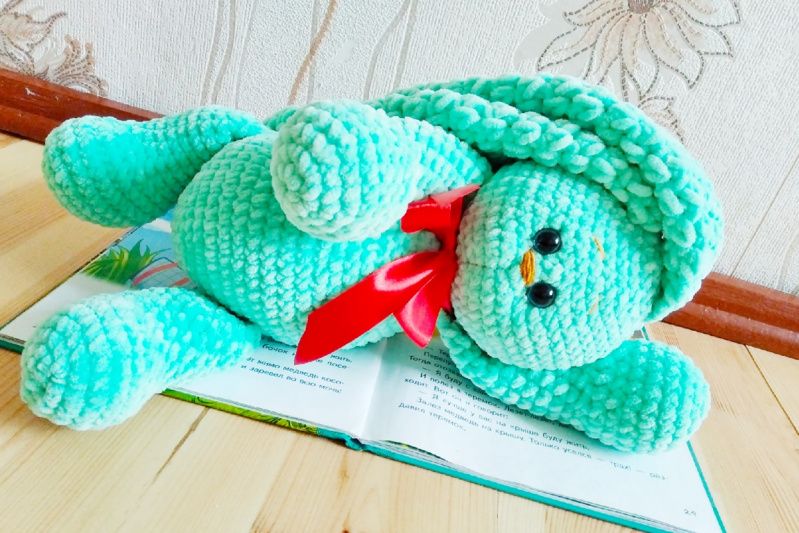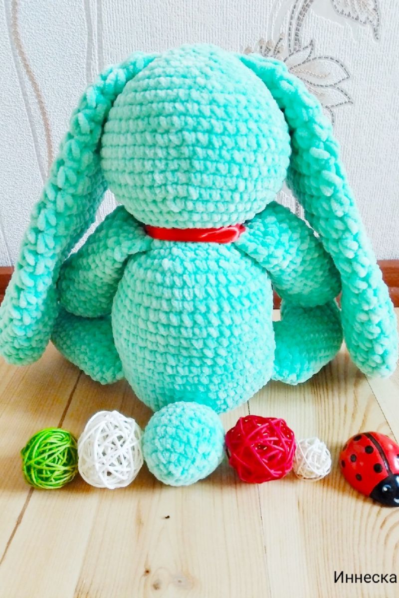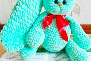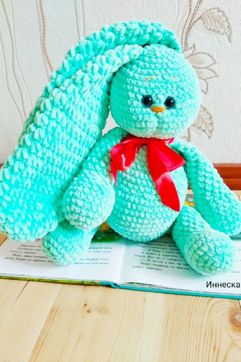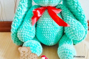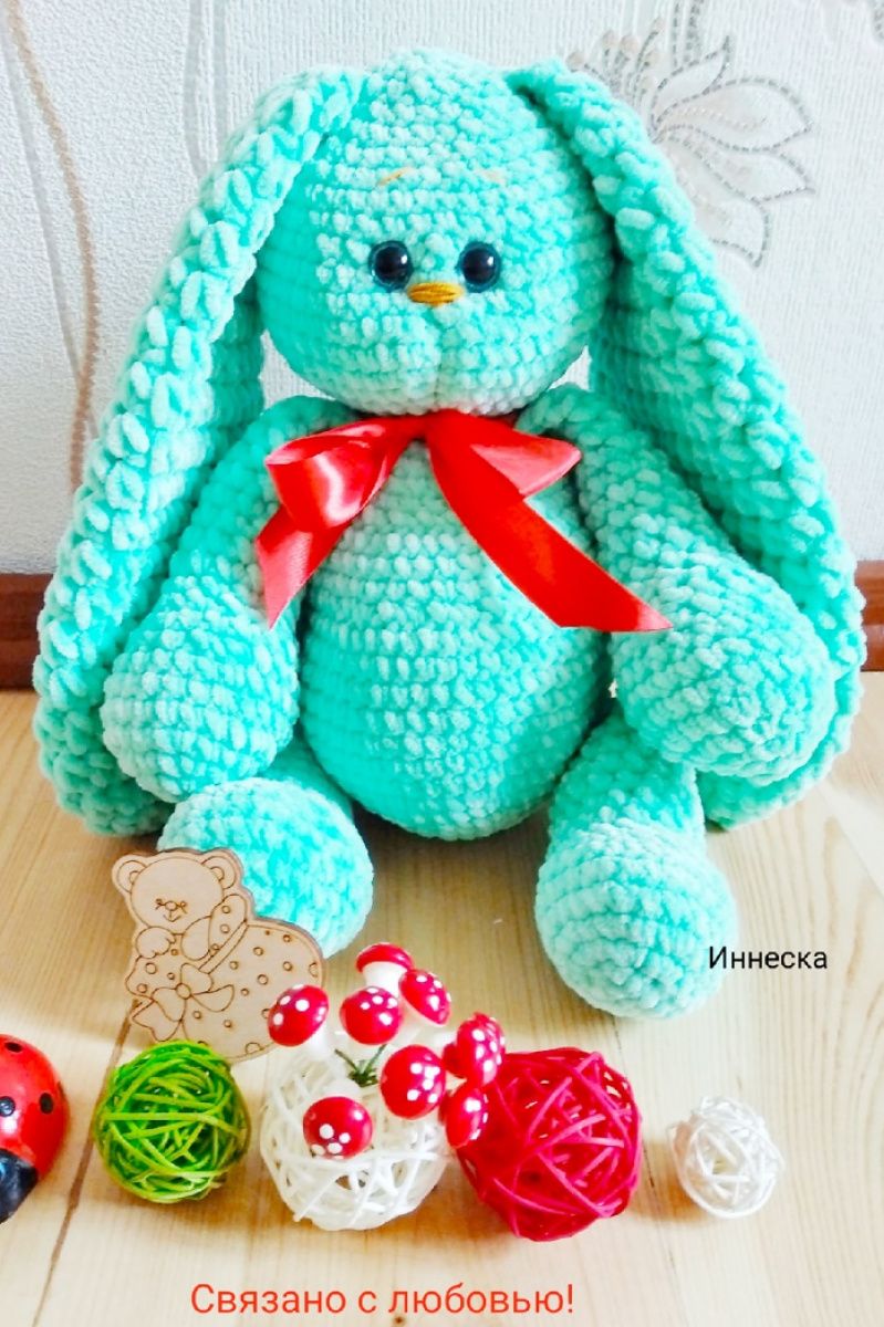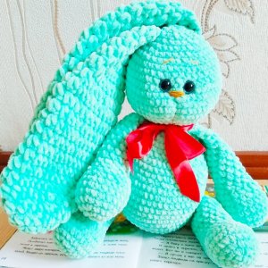У продажу є в'язаний плюшевий заєць м'ятного кольору. Ручна робота. Розмір: зростання без урахування вух-38см, вуха-33см. Пов'язаний з плюшевою пряжі Himalaya dolphin baby, наповнювач-холофайбер. Очі блакитні на безпечному кріпленні. Це супер ніжна іграшка сподобається не тільки дітям, а й дорослим. Пов'язано з любов'ю від Іннескі!)