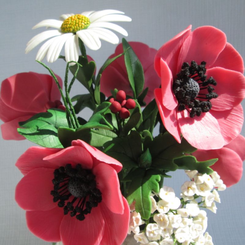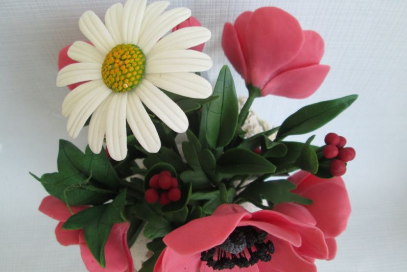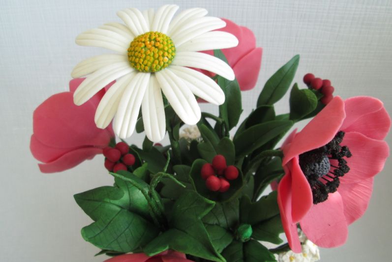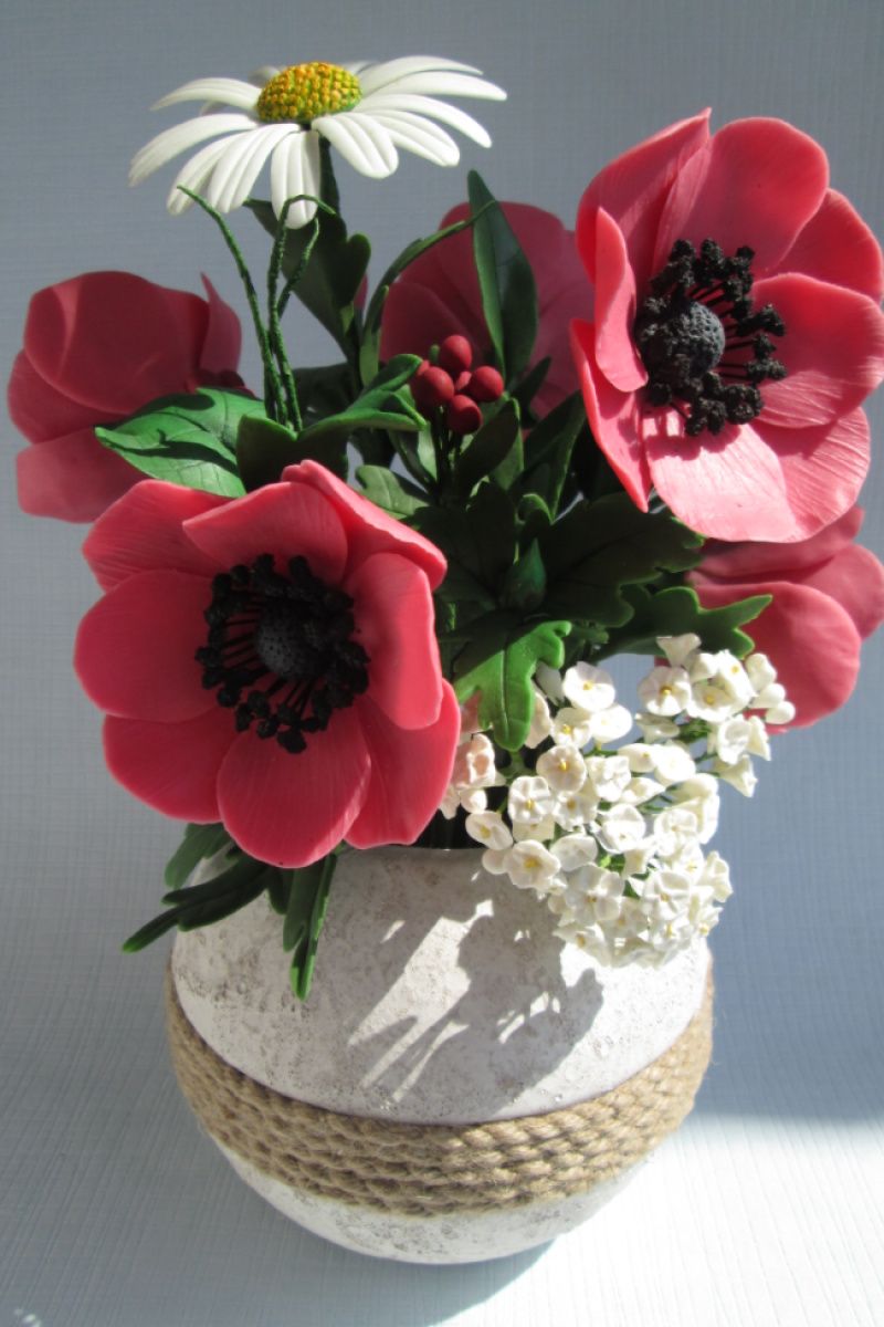 Інтер'єрна композиція «Букет анемона» з холодного фарфор. Ручна робота. Букет для тих, хто мріє здивувати і викликати захоплення своїм подарунком. У букеті 5 анемона з двома бутонами, 6 гілочок гіпсофіли, садова ромашка, 6 гілочок з ягодами, зелень. Квіти, бутони, ягоди і листя виконані в натуральну величину. Всі елементи квітів, аж до тичинок. виконані вручну і повторюють фактуру живого квітки. Ця квіткова композиція здатна стати прикрасою будь-якого інтер'єру. яскравим акцентом в будинку, офісі. магазині, кафе, готелі, студії. Вона буде радувати своєю красою довгі роки і не завдасть клопоту по догляду. Квіти закріплені в керамічному кашпо.