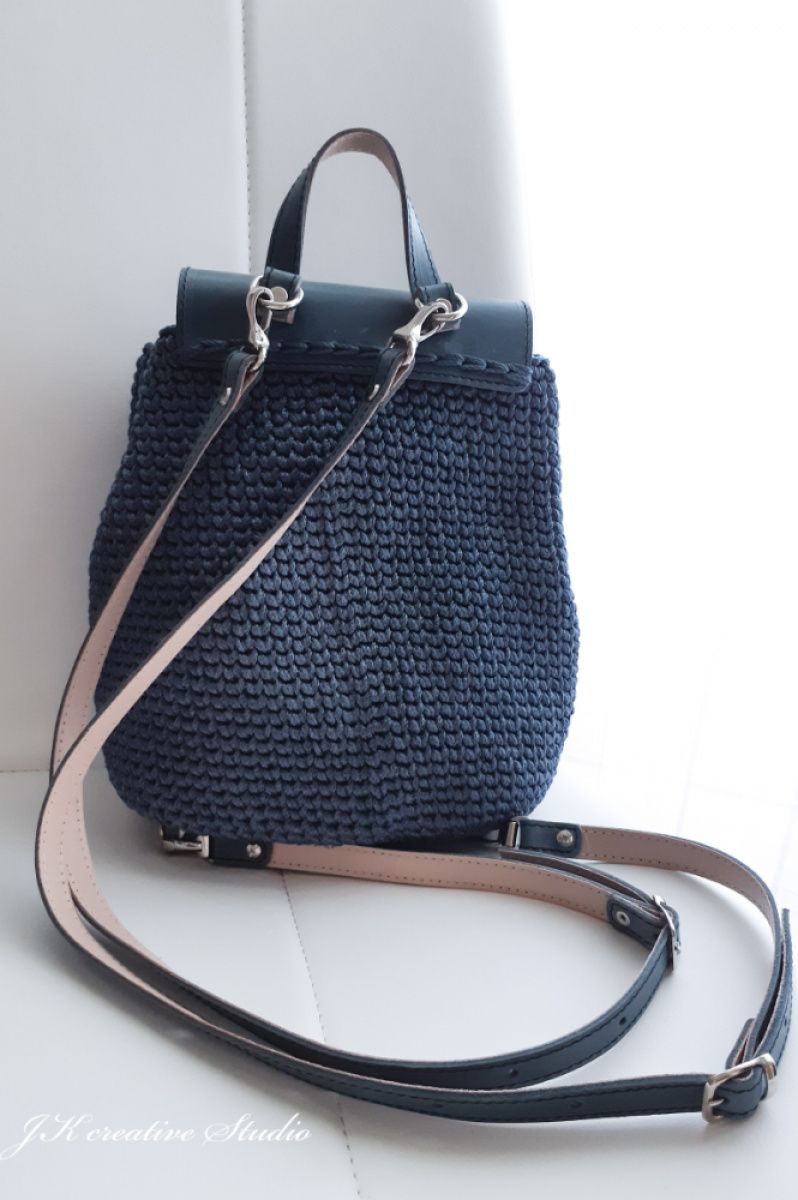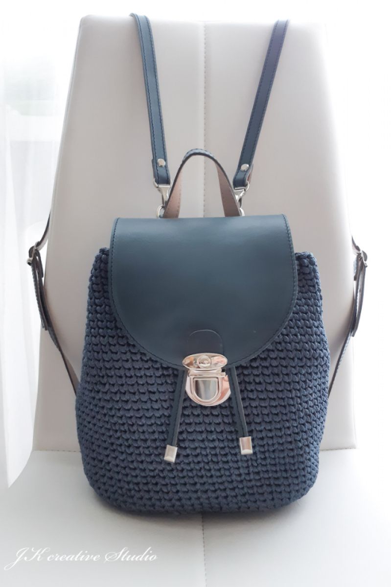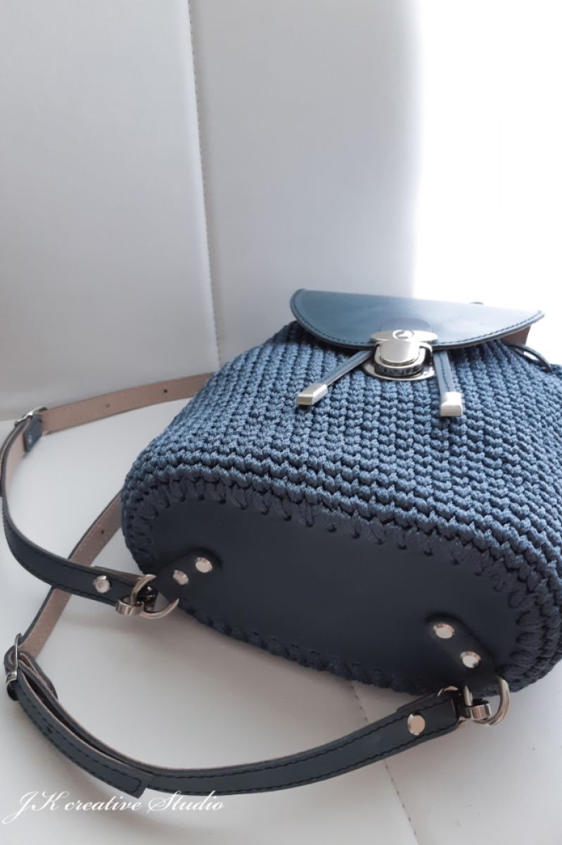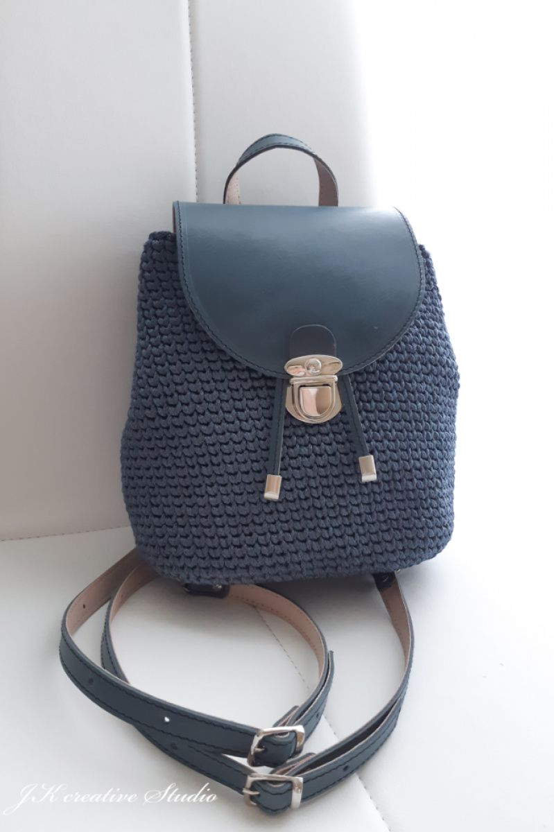 Рюкзачки ручної роботи з класичним візерунком з міцного шнура в кольорі "Джинс" і легкі в догляді. Ремені, клапан і дно з натуральної шкіри. Всередині підкладка з кишенькою, бавовна. Розмір 35х27х14см. Також, можна замовити і в іншому кольорі! Вироби ручної роботи стали трендовими! Особливо якщо модель і колір відповідають модним тенденціям сезону!