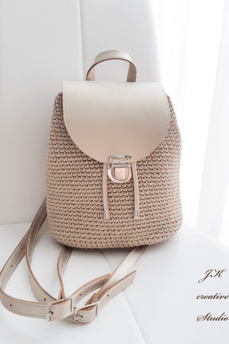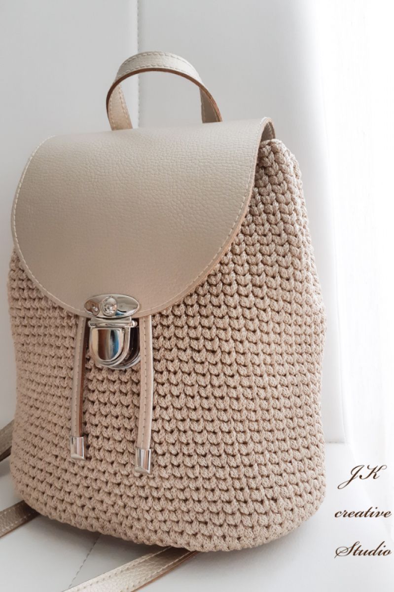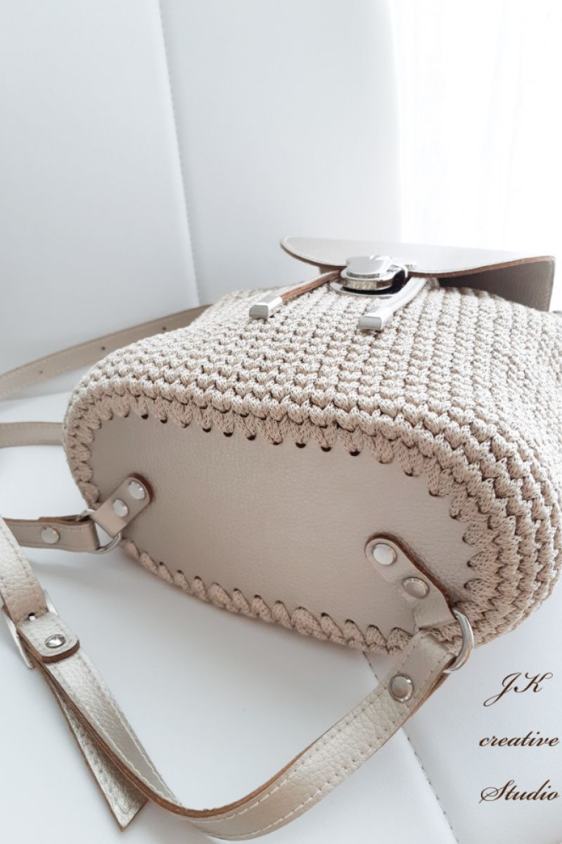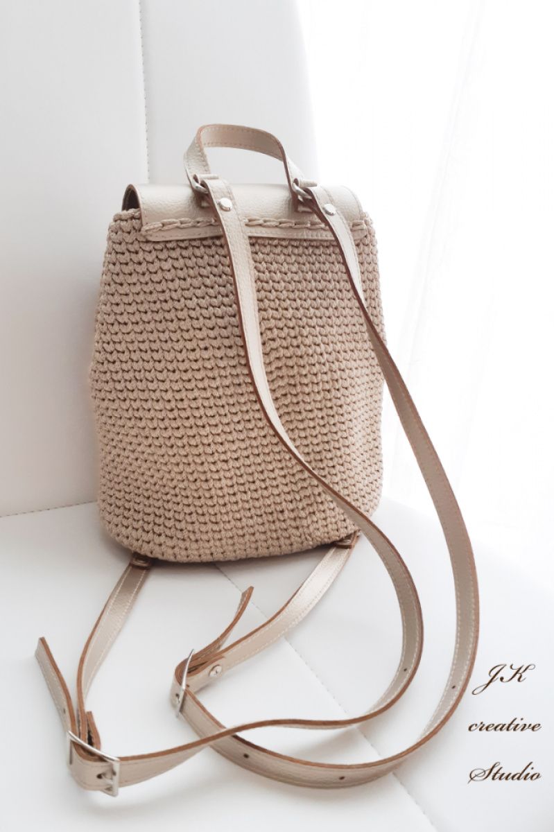 Рюкзачки ручної роботи з класичним візерунком з міцного шнура і легкі в догляді. Ремені, клапан і дно з еко-шкіри з "золотистим" покриттям. Всередині підкладка з кишенькою, бавовна. Розмір 35х28х14см. Також, можна замовити і в іншому кольорі! Вироби ручної роботи стали трендовими! Особливо якщо модель і колір відповідають модним тенденціям сезону!