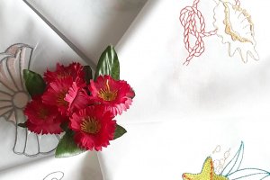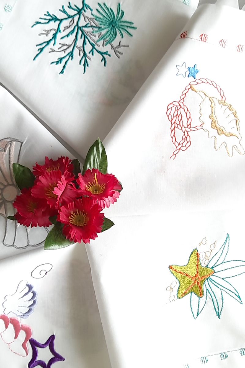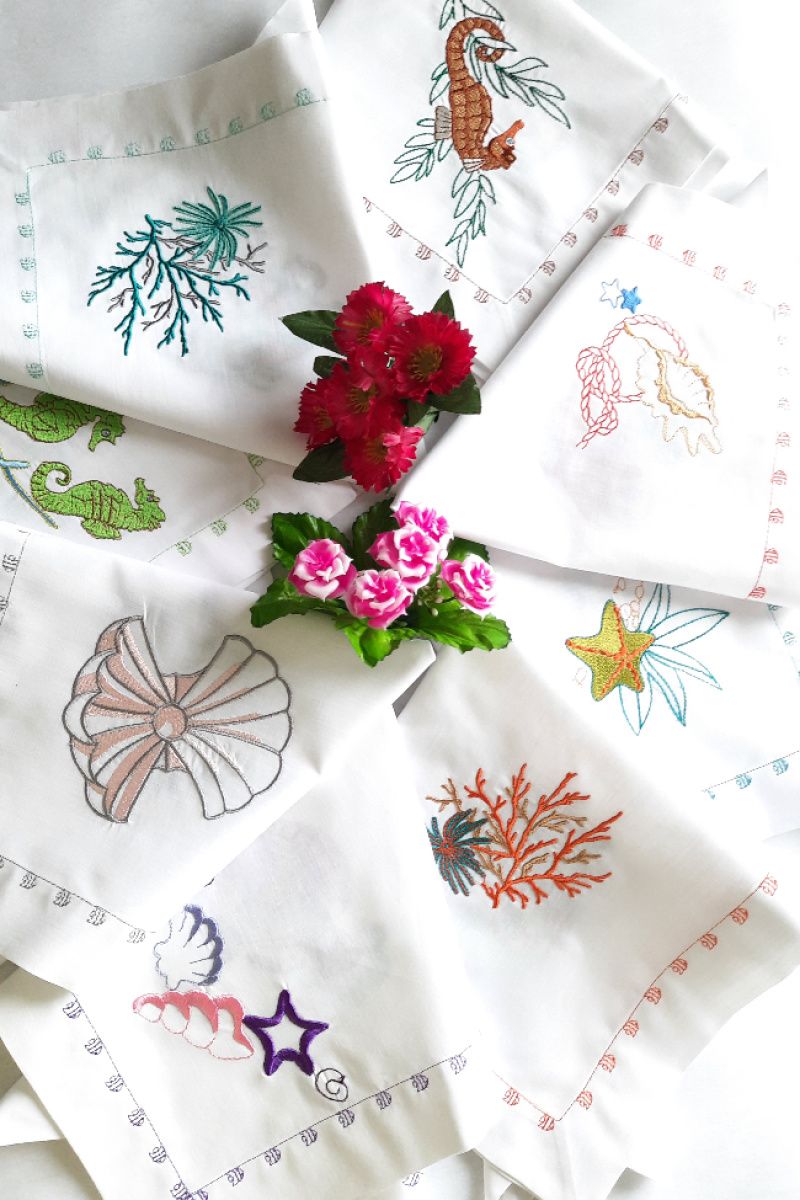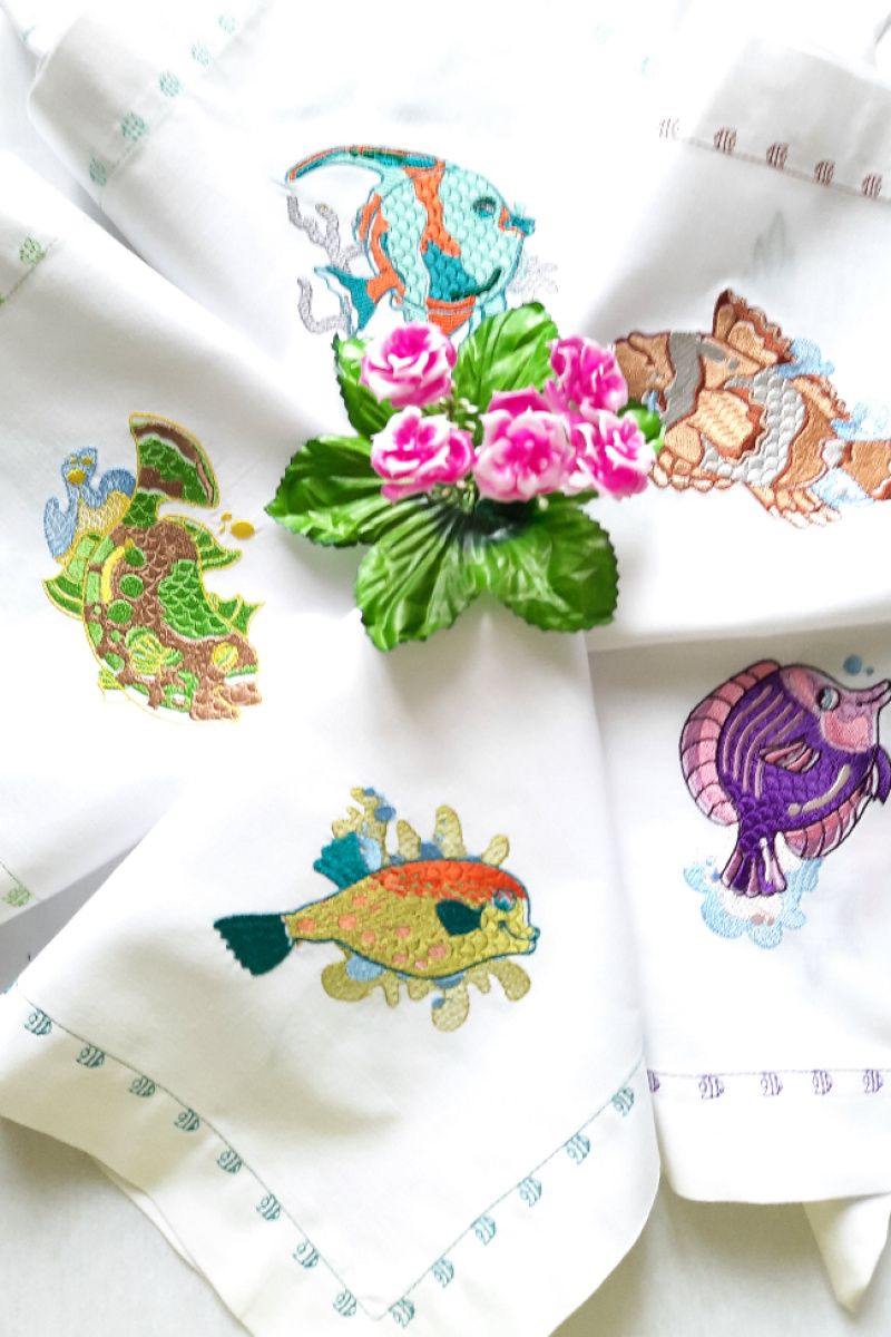 Серветки для сервірування столу з дизайнерськими рибками в одному куточку морськими мешканцями в протилежному. По периметру бортик розшитий маленькими рибками. Вишивка машинна. Ціна вказана за 6 шт на вибір.
