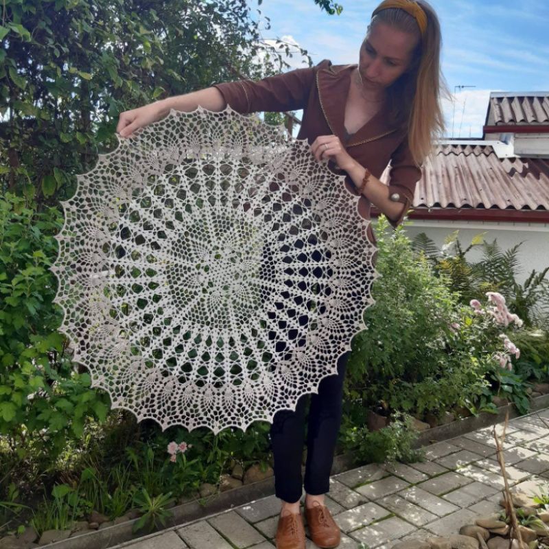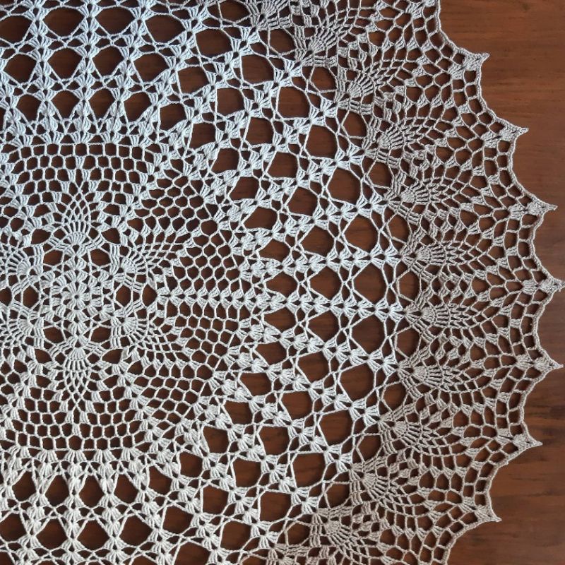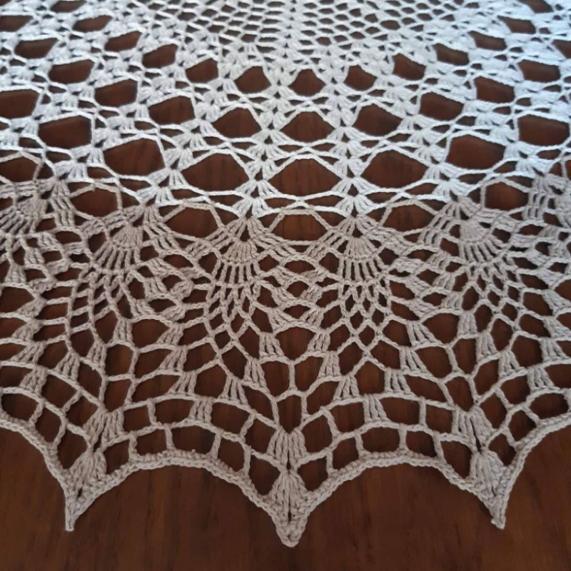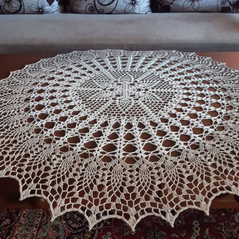 Ніжномолочна скатертина із кавовим краєм діаметром 87 см. Виплетена вручну із натуральної пряжі (бавовна/льон). Ідеальна для столика діаметром 1 м.