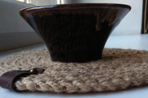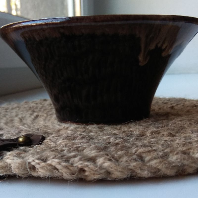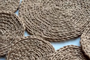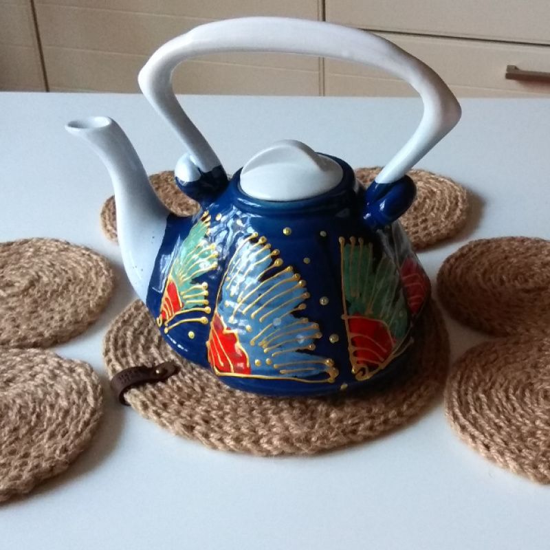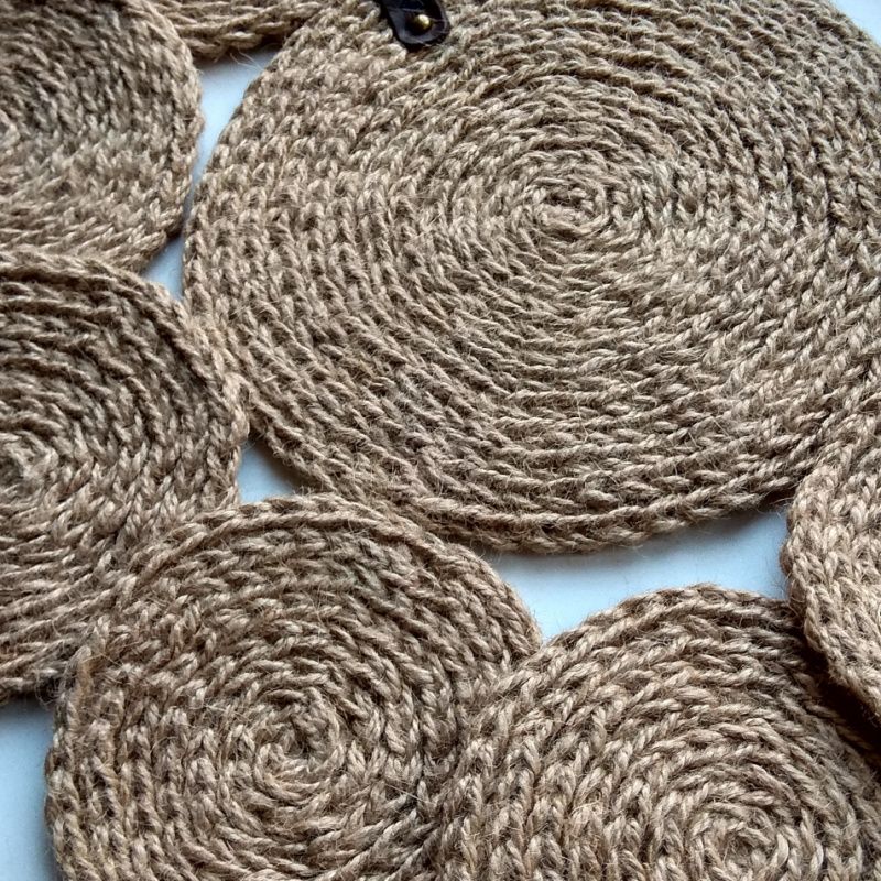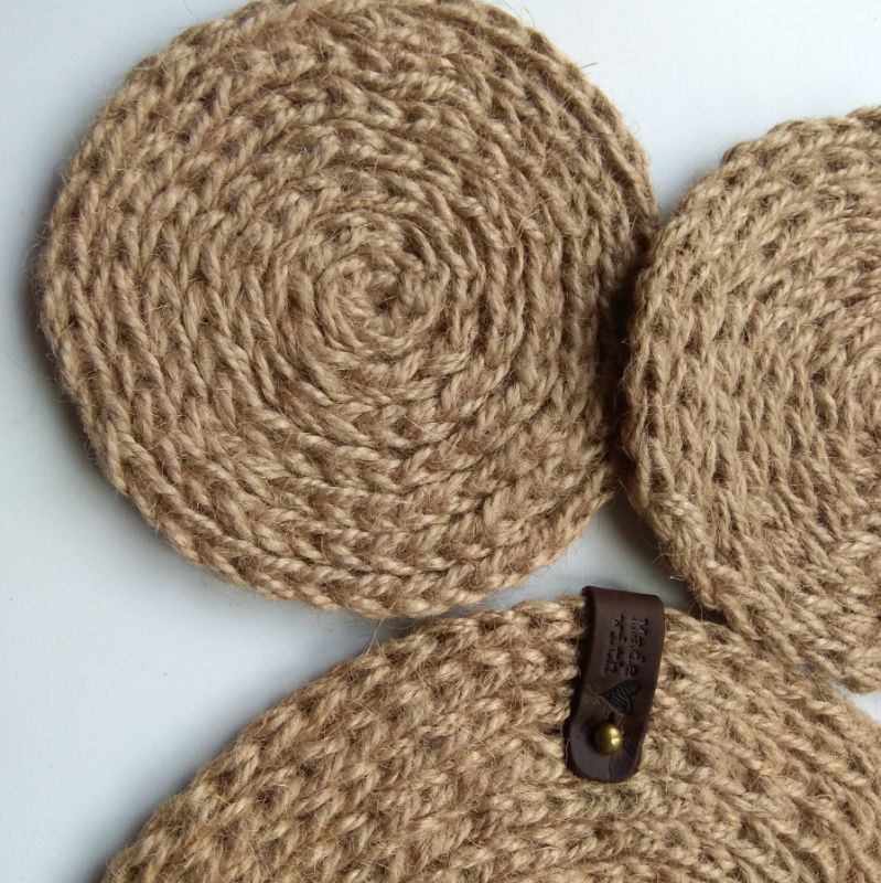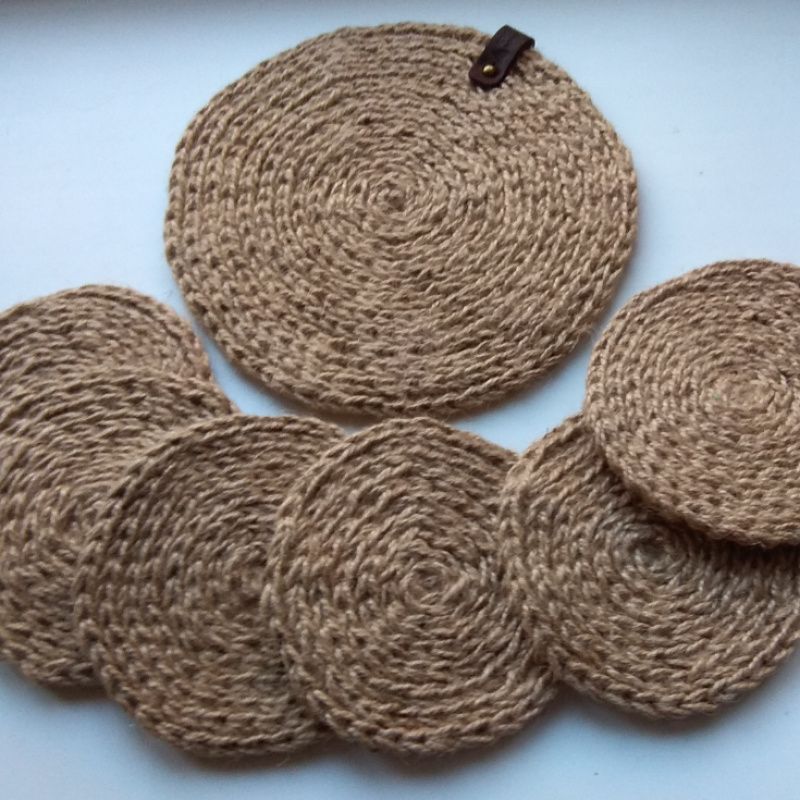 Набір круглих підставок під чашки і чайник, пов'язаних гачком з джуту (натурального шпагату, який роблять з волокон однойменного рослини). Набір складається з однієї великої підставки діаметром 21 см і шести маленьких по 13 см. Найбільша перевага виробів з джуту в їх натуральності, екологічності. Вони незамінні при оформленні інтер'єру в скандинавському стилі або ж екостилі. Підставки після вив'язування обов'язково стираються і відпарювати, після чого жорсткий джут стає м'яким і приємним на дотик і прекрасно тримає форму. У догляді прості, так як не вбирають ні жир, ні бруд. При необхідності їх легко почистити, просто протерши м'якою серветкою, стираються також без проблем.
