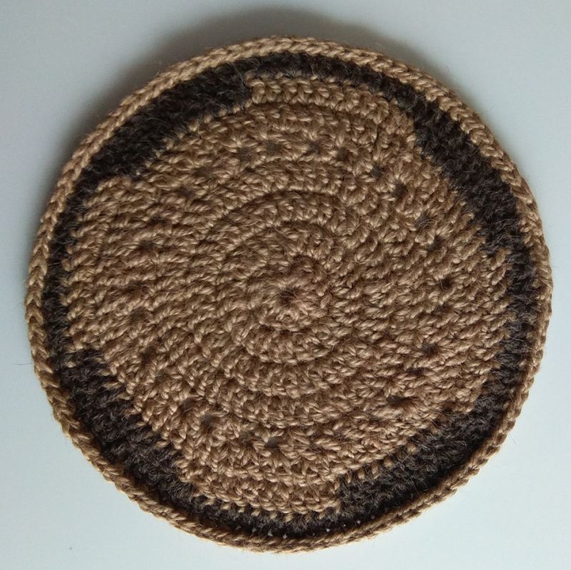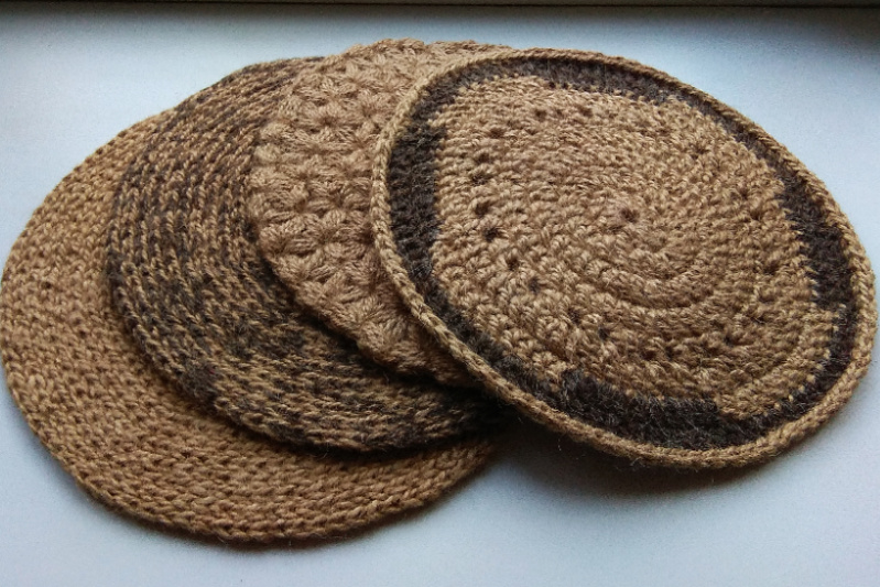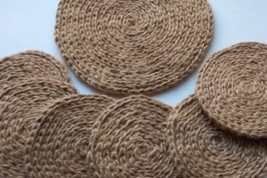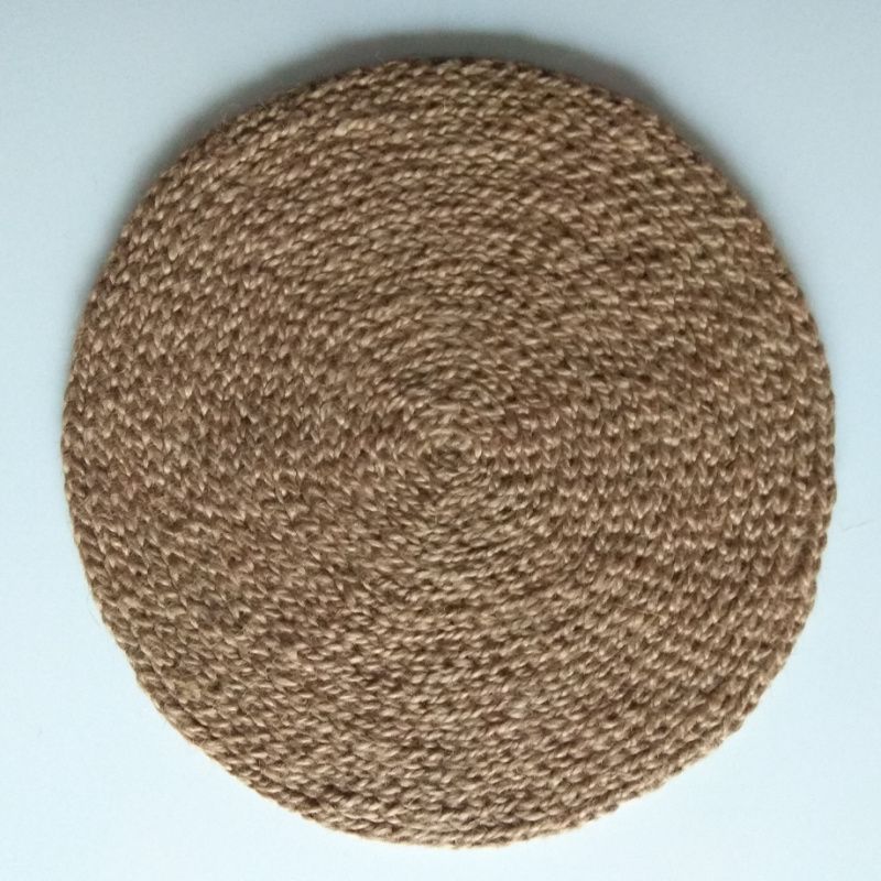 Сервіровочні килимки, зв'язані гачком з джуту. Діаметр 29-30 см. На замовлення. Ціна за 1 шт. Обробка виконана з натуральної овечої вовни, колір - за бажанням замовника. Кожен килимок після вив'язування стирається, висушується, а після цього проходить ще теплову обробку (добре відпарює). Після чого досить жорсткий джут стає м'яким і приємним на дотик, прекрасно тримає форму. В експлуатації ці килимки-серветки дуже прості і зручні. Бруд і жир вони не вбирають, забруднення легко віддаляється вологою ганчіркою, можна з будь-яким миючим засобом, стираються також без проблем. Для любителів екостилю.