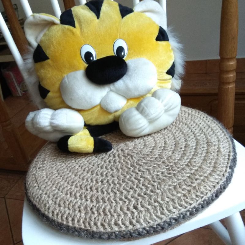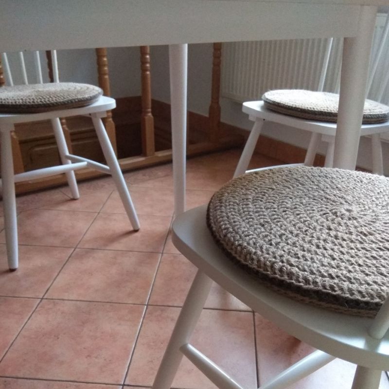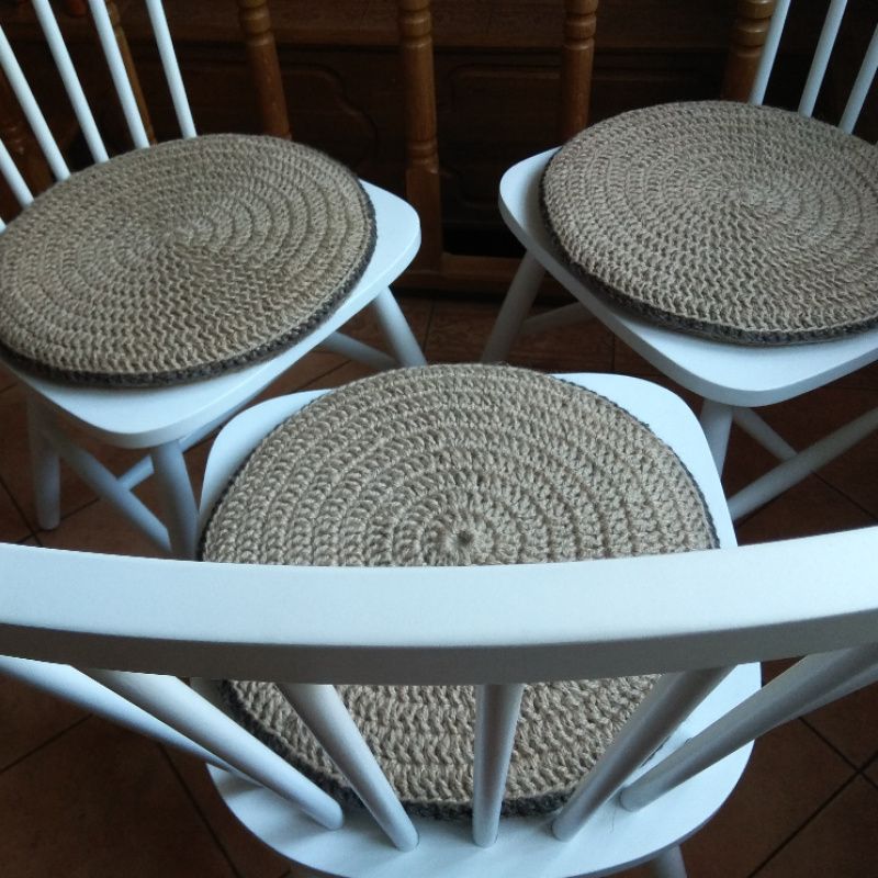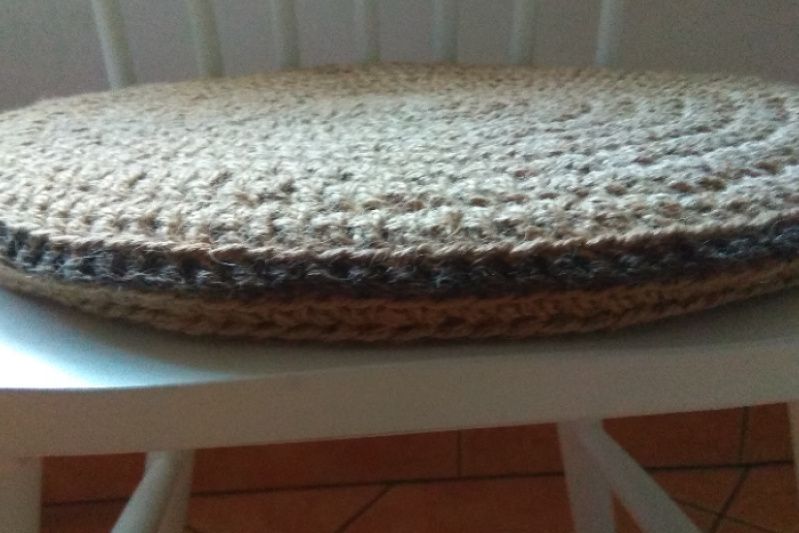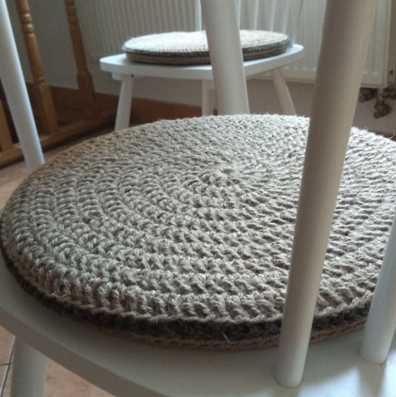 Круглі сидушки на кухонні стільці, зв'язані гачком з джуту (натурального шпагату, який роблять з волокон однойменного рослини). Діаметр 38 см. Товщина 4 см. Зручний і стильний аксесуар для Вашої кухні з натурального, eco-friendly матеріалу, зносостійкого і зручного в експлуатації. Джут майже не вбирає грязь, а при необхідності легко чиститься. Оздоблення з натуральної овечої вовни. М'якості надає поролонова вставка. На замовлення. Розмір і колір обробки можна підібрати спеціально для Вас. Є система оптових цін.