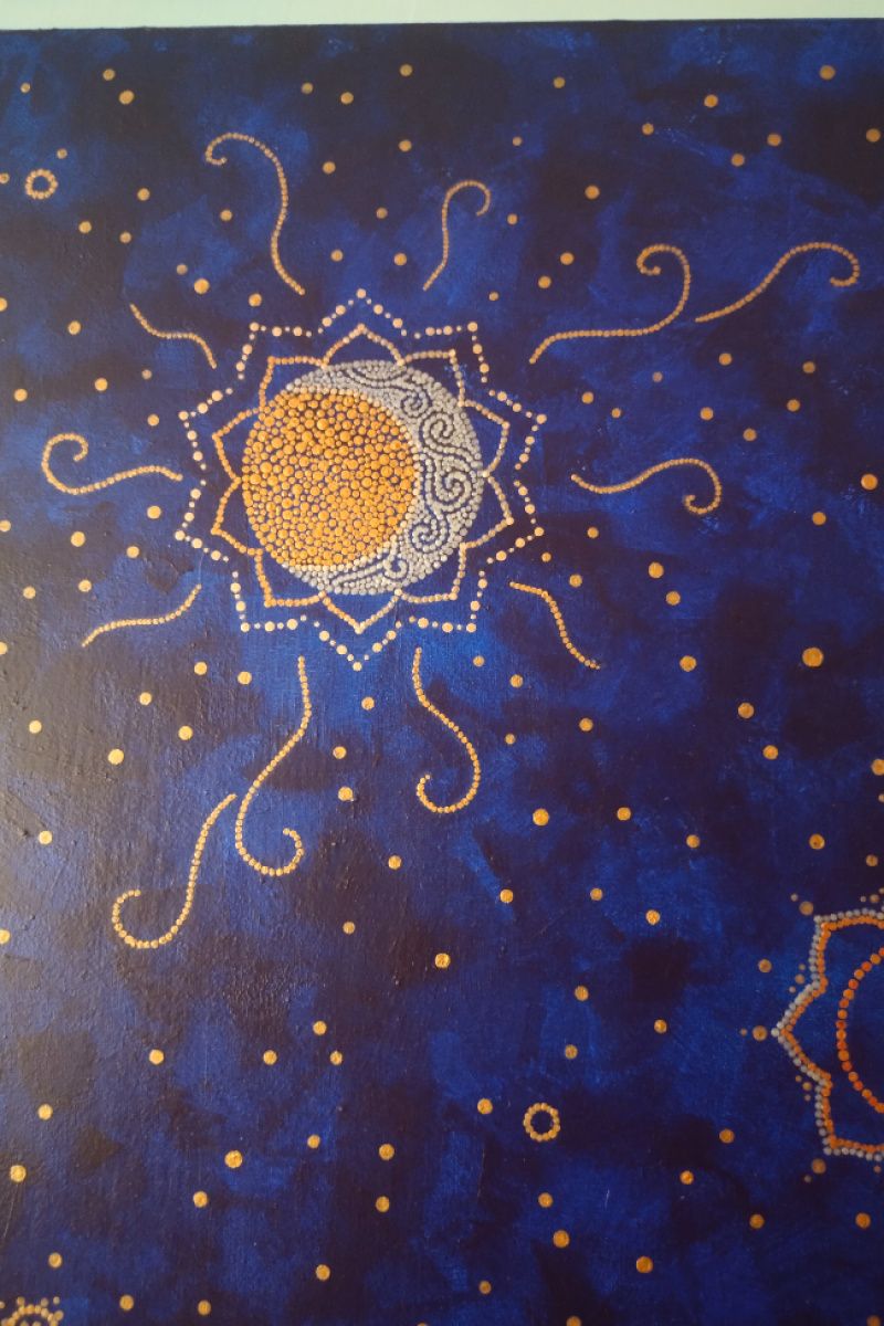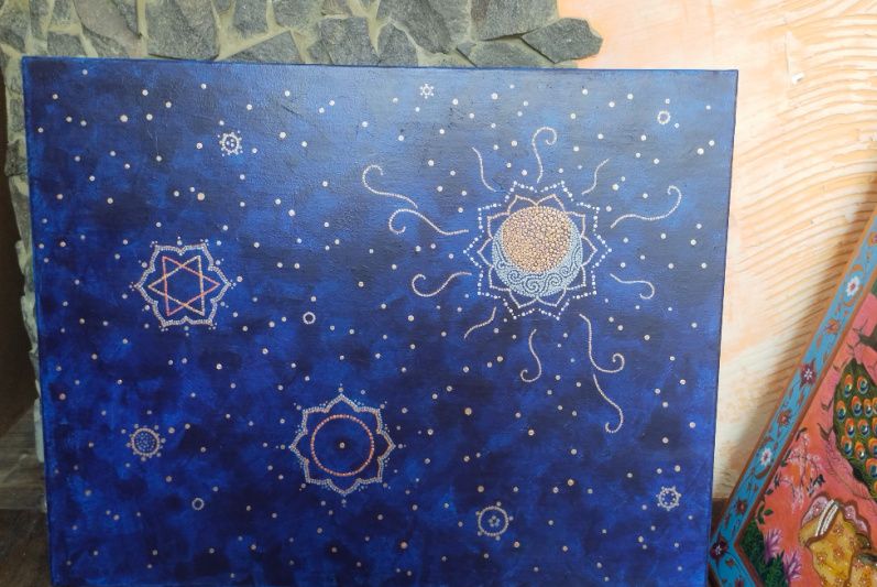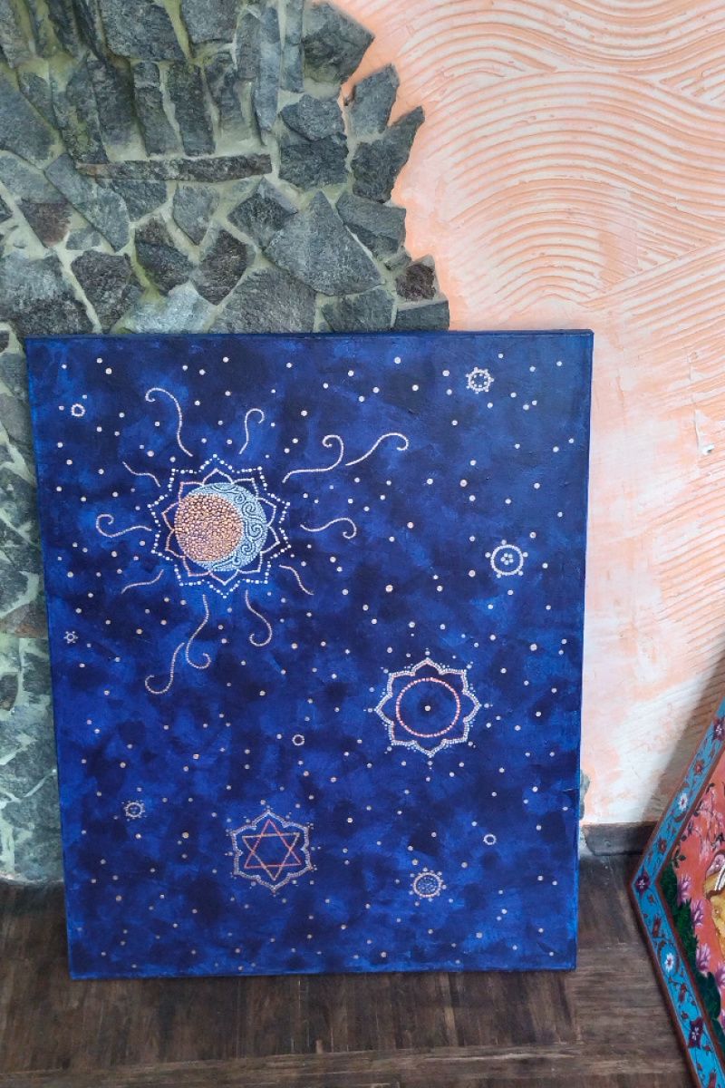 Космічна абстракція, виконана акрилом в точковій техніці, розмір полотна 55 * 70 см. Картина гармонізує простір. Я написала її коли жила на березі моря. Натхненням послужили теплі літні ночі і небо усипане зірками.