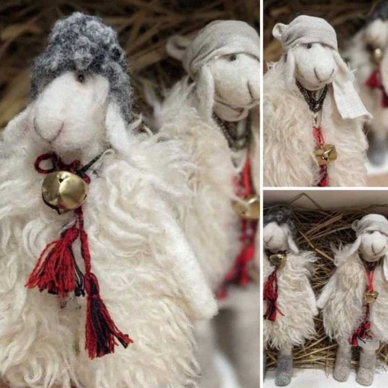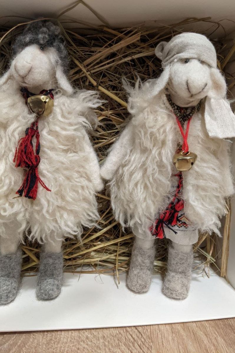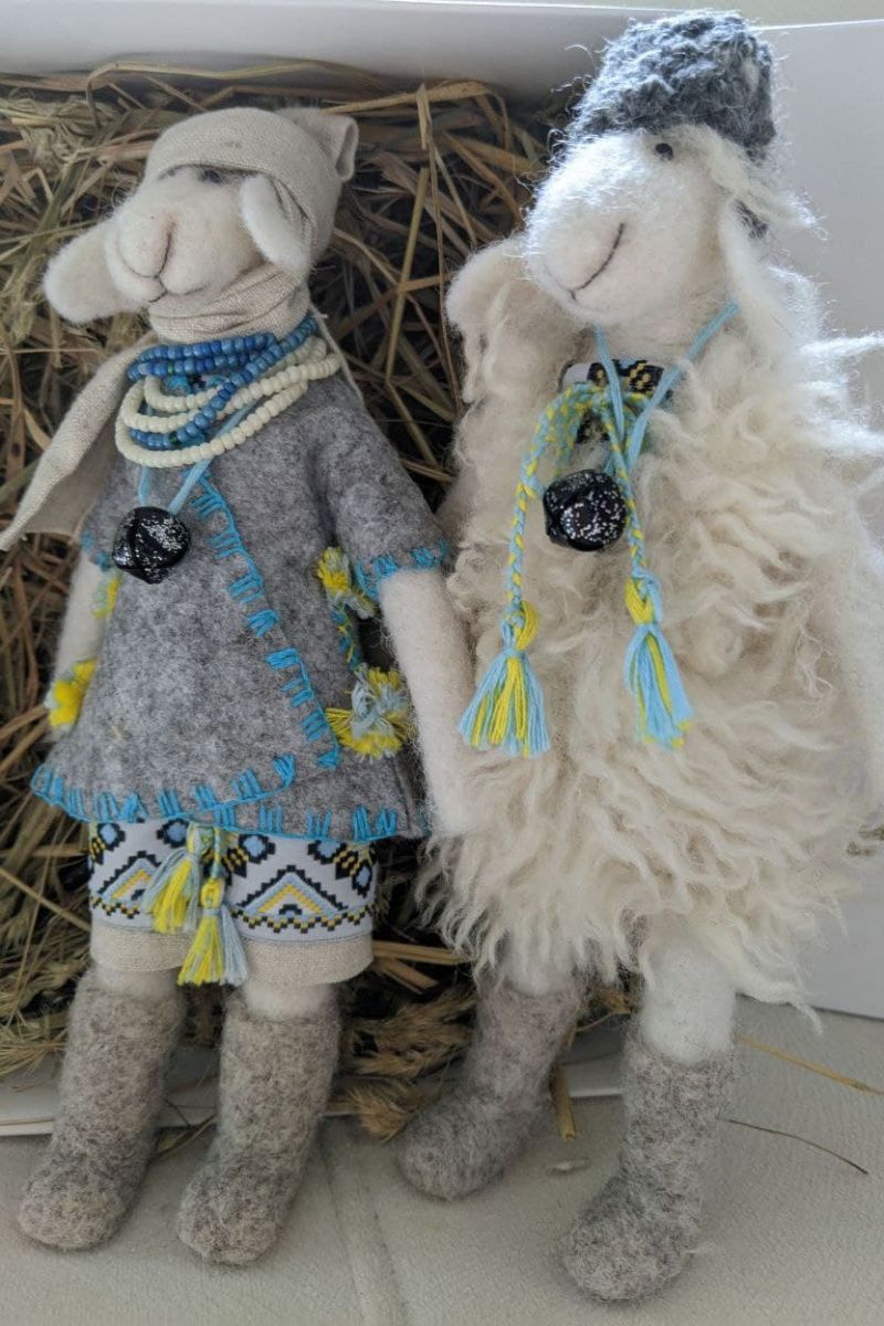 "Подружжя". Овеча вовна, штучне хутро, декор. 17-18 см. На молодиці намітка, архаїчний головний убір, пов'язана одним з найдавніших способів, поверх кибалки (накладка на голову для надання головному убору характерної форми).
