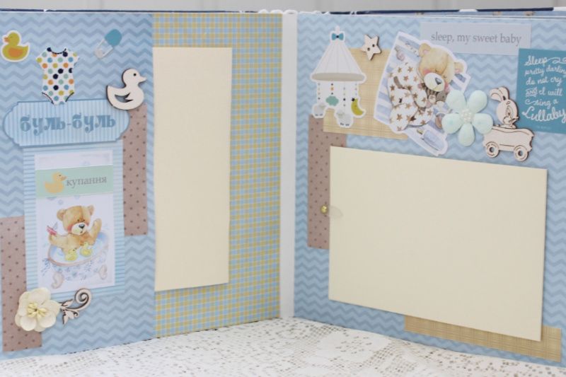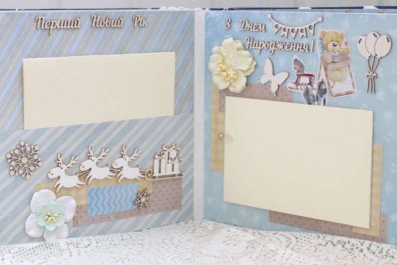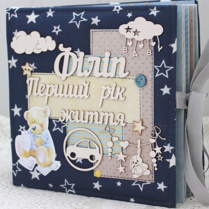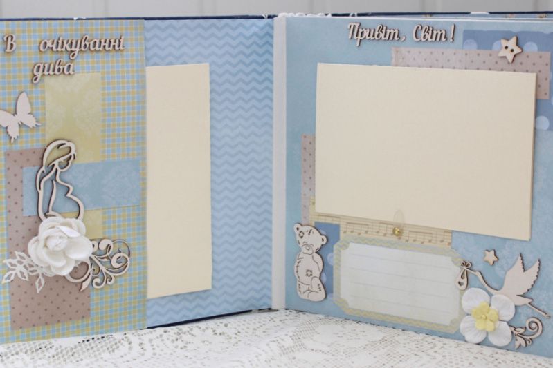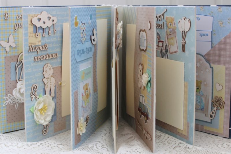 Альбом ручної роботи для новонародженого малюка. Формат альбому 20х20, всередині 12 декорованих тематичних сторінок, розрахований до 50 фотографій. Альбом виконаний за темами: В очікуванні дива, Привіт, Світ !, Яскраві посмішки, Хрестини, Купання, Солодкі сни, Наше літо, Наша радість, Перший Новий Рік, З Днем Народження !, Мамині скарби (конверти для бірочки, локона, зубика) ,Таблиці зростання і досягнень дитини.