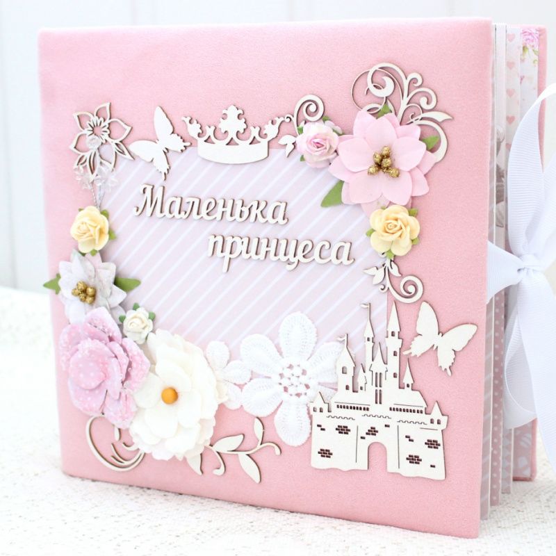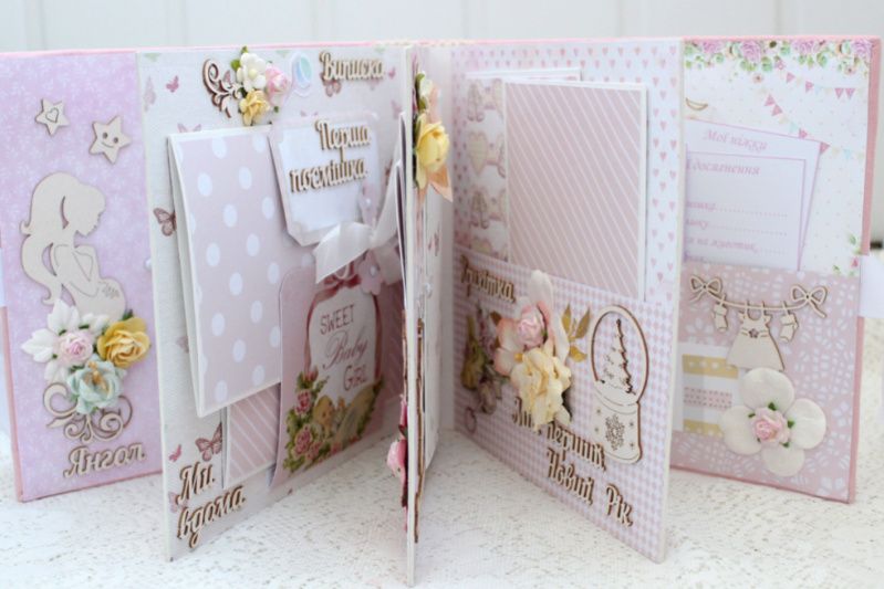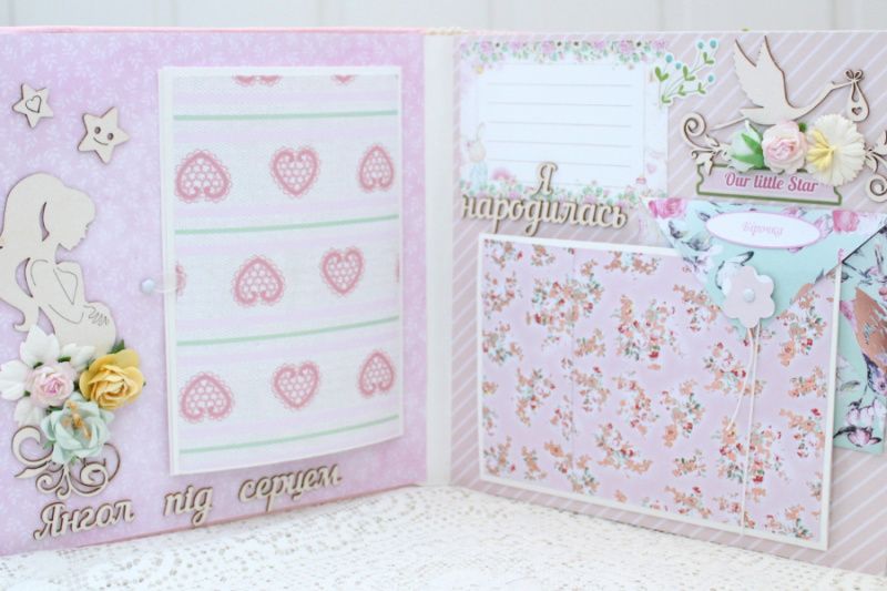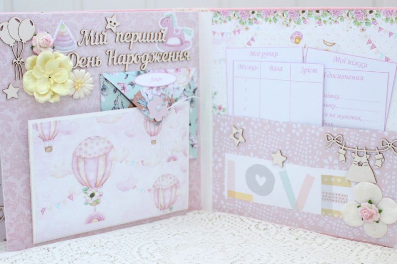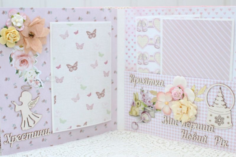 Альбом ручної роботи для дівчинки. Формат альбома 20х20, всередині 8 тематичних сторінок з декором, розрахован до 42 фотографий. Альбом виконан по темам: Янгол під серцем, Я народилась + конверт для бірочки, Виписка, Перша посмішка, Ми вдома, Купання, Солодкі сни, Хрестини, Крихітка, Перший Новий Рік, Мій перший День народження + конверт для локона, Таблиці росту та досягнень дитини.