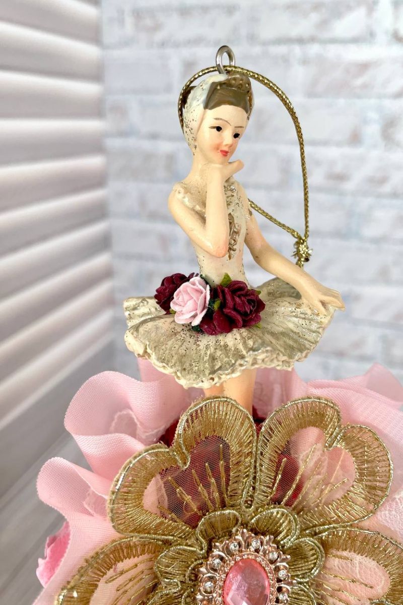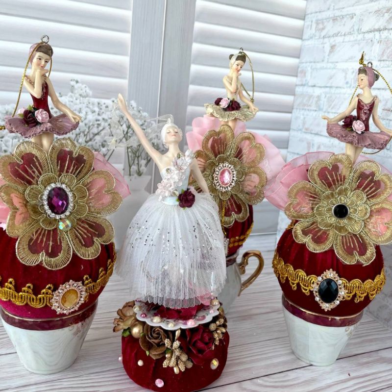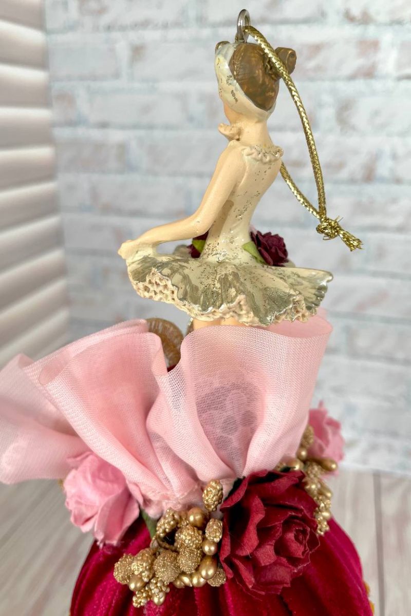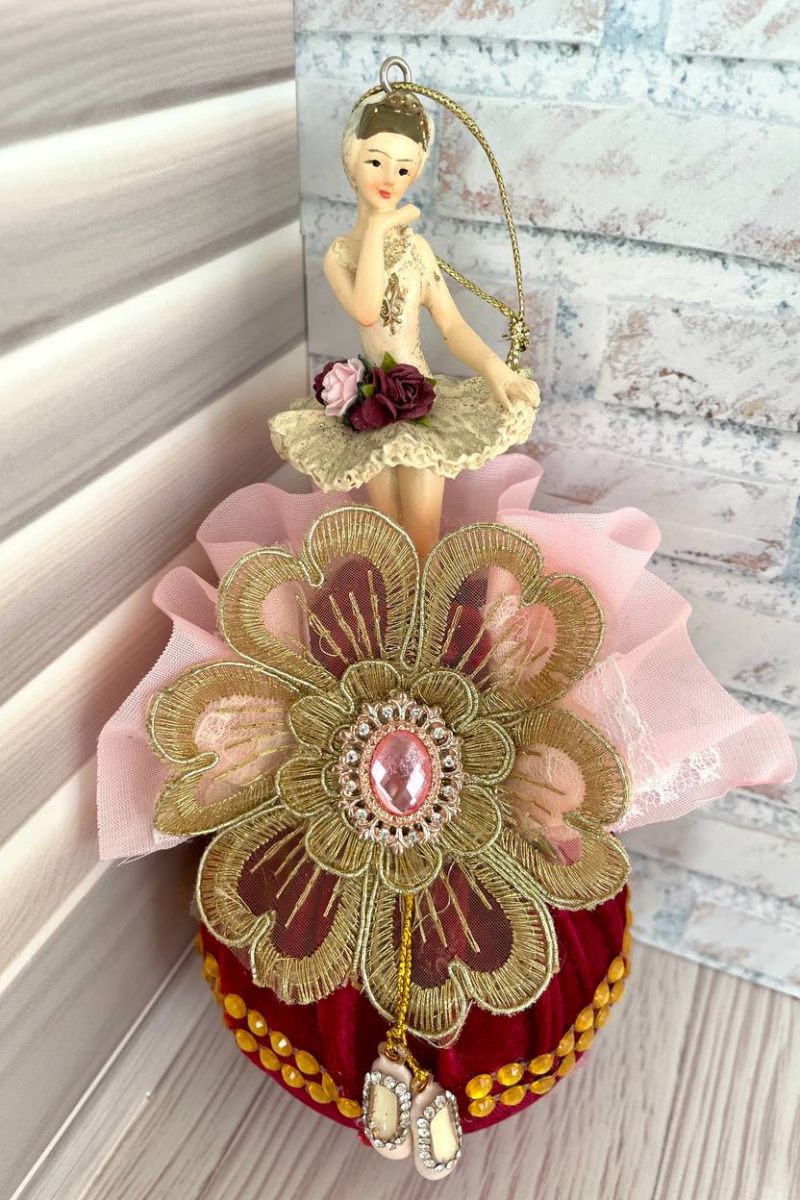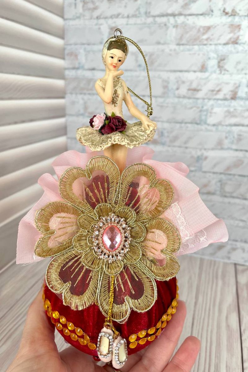 Оригінальна ялинкова іграшка ручної роботи балерина на кулі. Висота іграшки 19 см, діаметр кулі 8 см, матеріал кулі – пластик, матеріал фігури – поліустон. Куля обтягнута оксамитом з мереживним елементом і позаду іграшка декорована об'ємними паперовими квітами та декоративними гілочками. Можливе придбання як 1 шт, так і цілого набору ексклюзивних ялинкових прикрас. Ціна вказана за одну іграшку 'Балерина на кулі'.