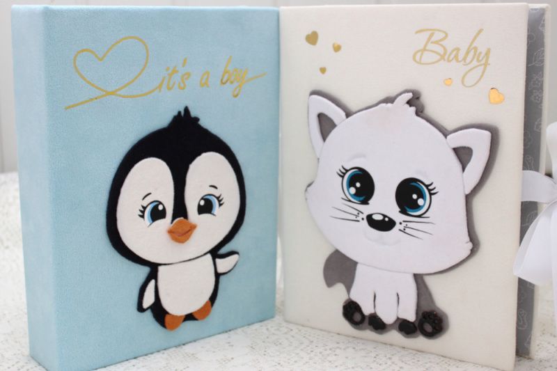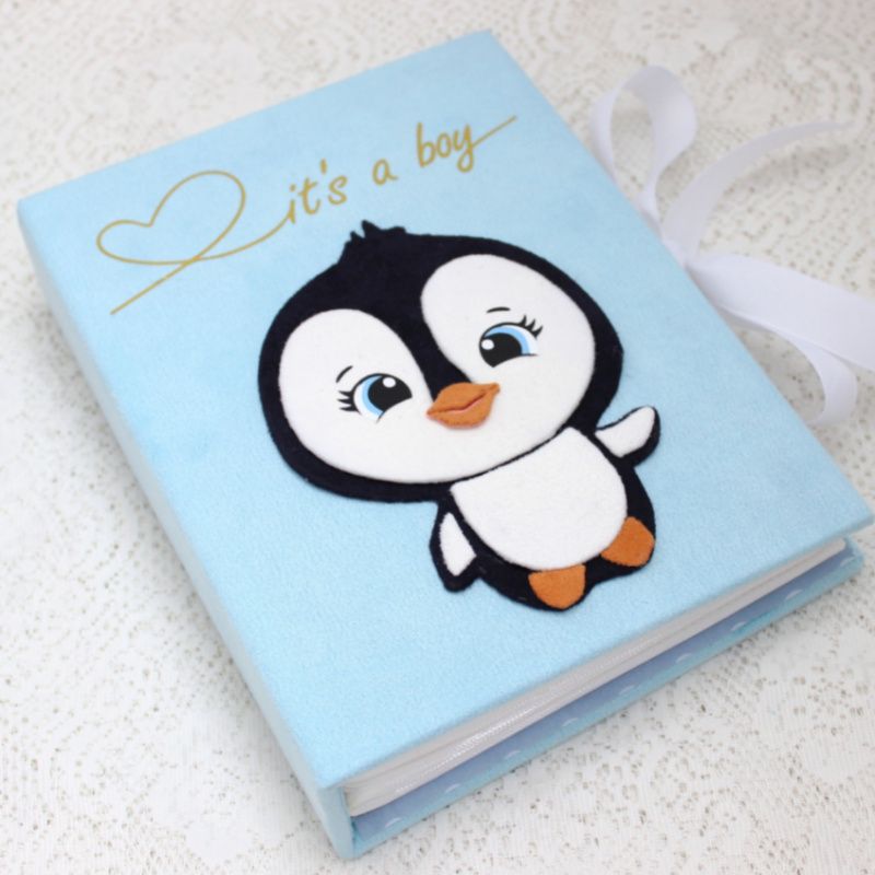 Дитячий фотоальбом ручної роботи для хлопчика. Формат альбому 17х23, розрахований на 200 фотографій 10х15, обкладинка обтягнута замшею. За бажанням можна додати метрику на передньому форзаці 30 грн та конвертики для маминих скарбів (бірочки, локону, зубика) 30 грн. Альбом у наявності.