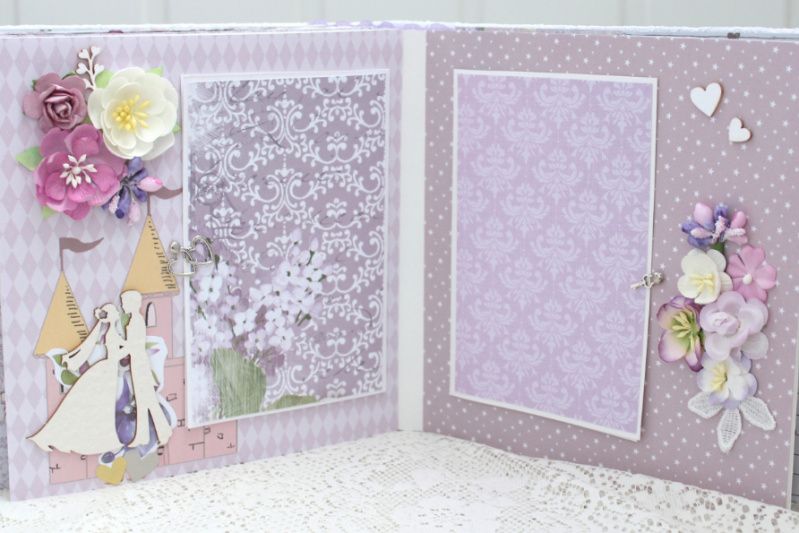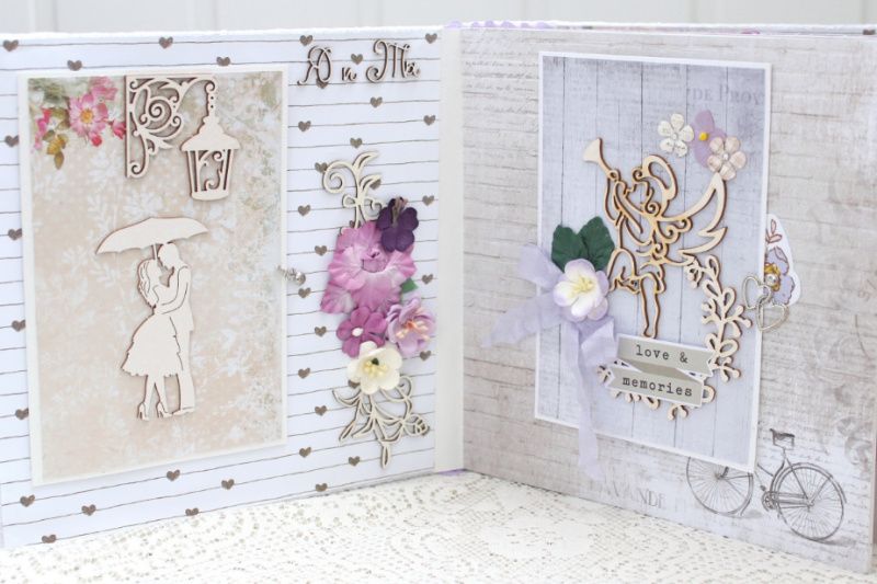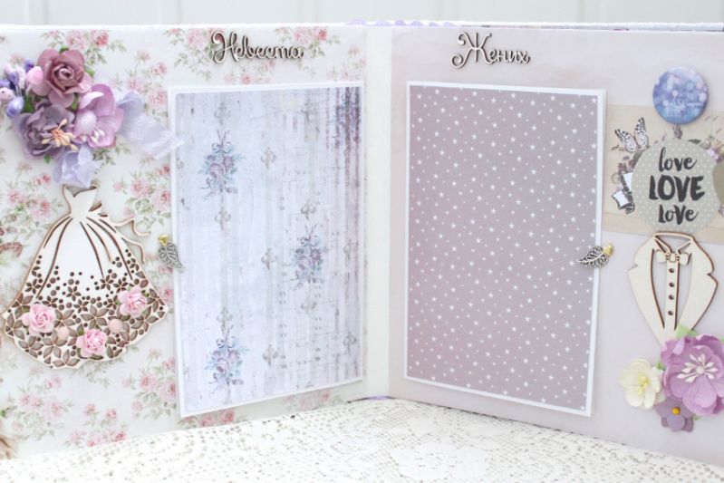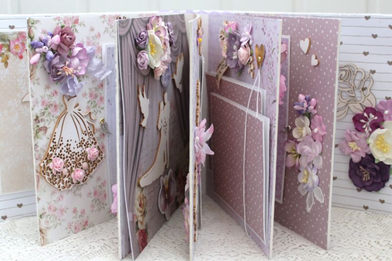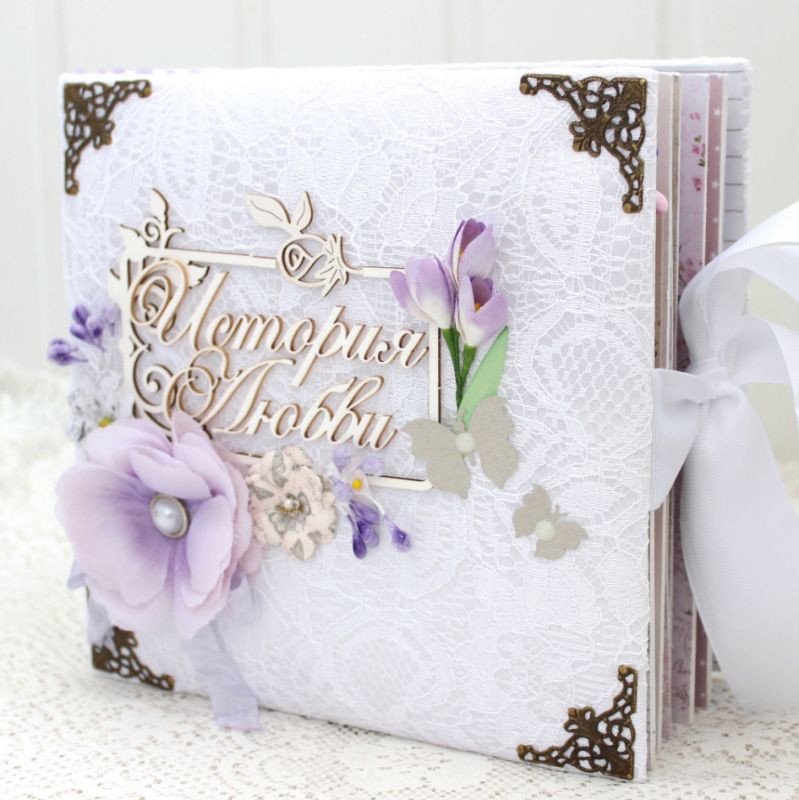 Весільний альбом ручної роботи з безліччю об'ємних квіткових композицій і різних прикрас на кожній сторінці. Формат альбому 20х20, всередині 12 декорованих сторінок, товщина альбому 8 см, розрахований до 50 фотографій.