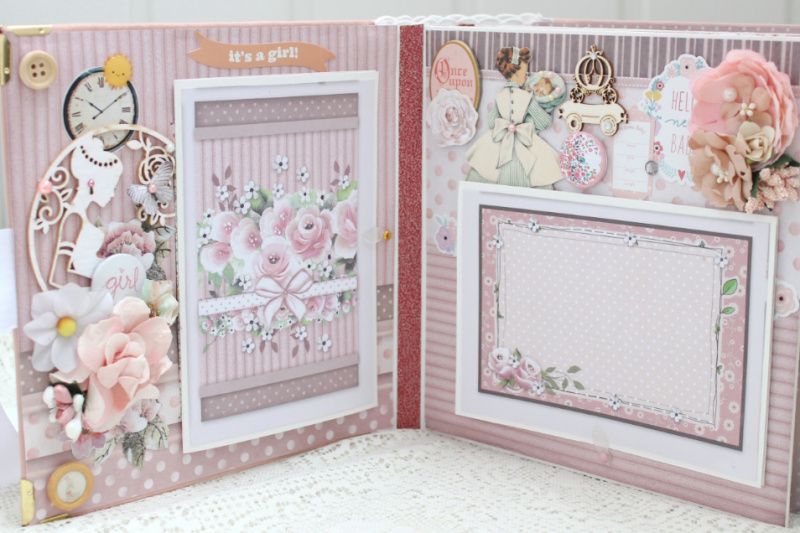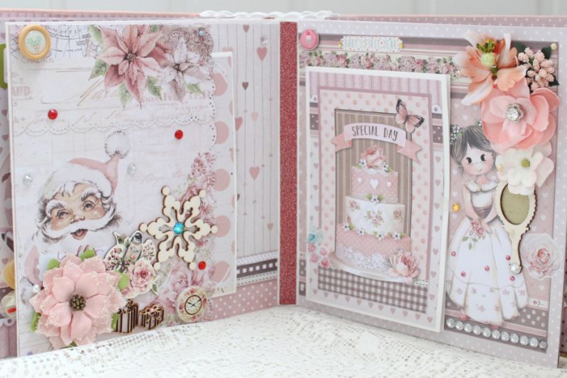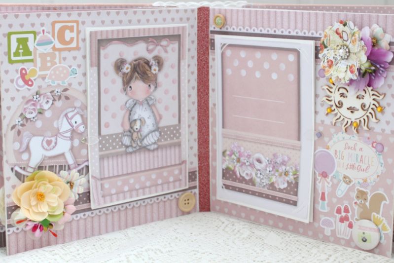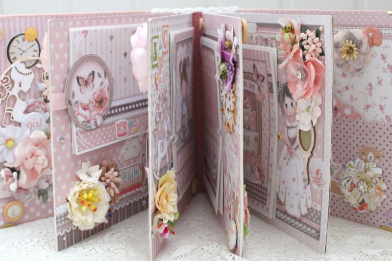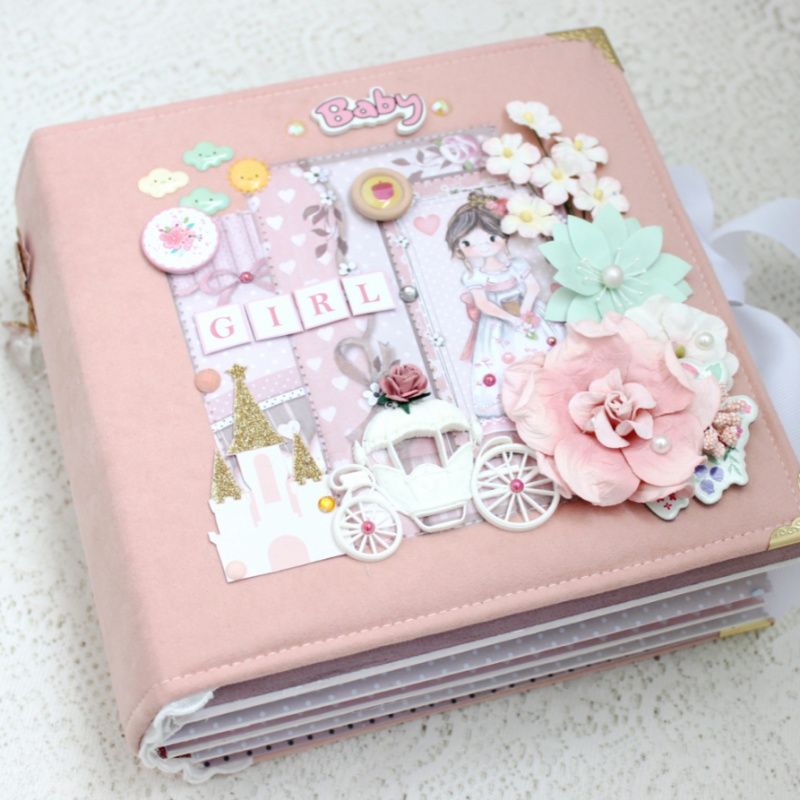 Альбом ручної роботи для дівчинки з безліччю об'ємних квіткових композицій та різноманітних прикрас на кожній сторінці. Формат альбому 20х20 всередині 10 декорованих сторінок, товщина 9 см, розрахований до 50 фотографій.