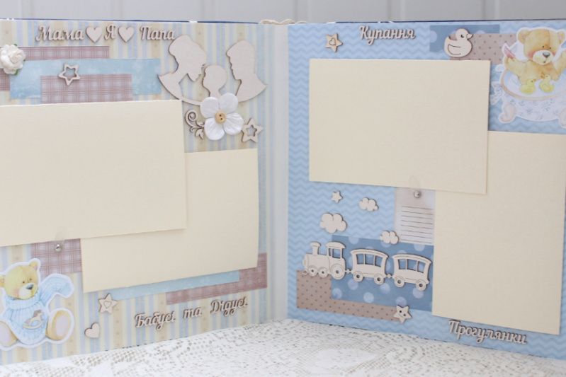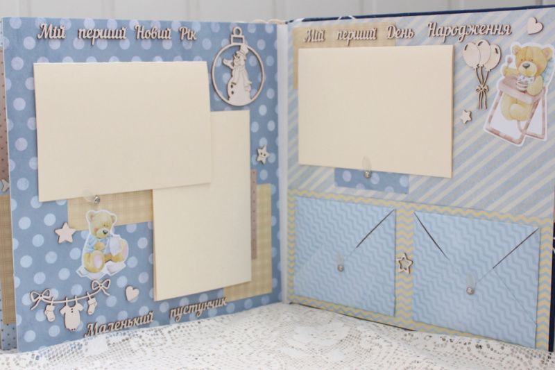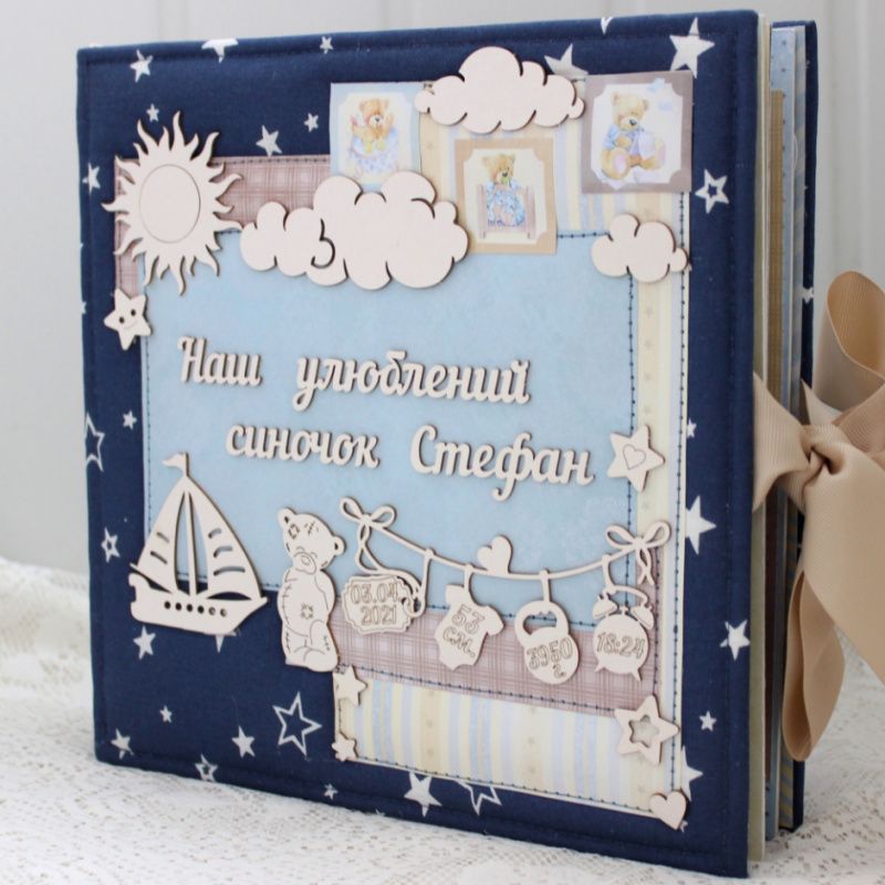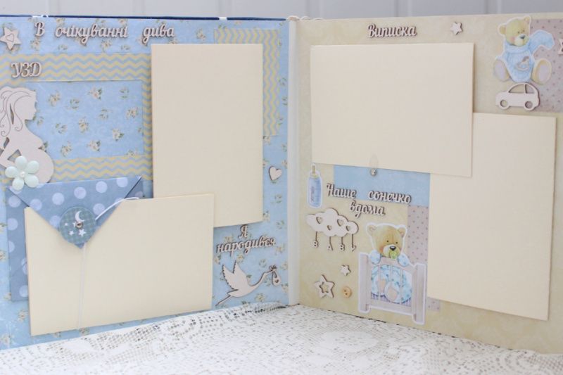 Великий альбом ручної роботи для новонародженого малюка. Формат альбому 25х25, всередині 10 декорованих тематичних сторінок, розрахований альбом до 80 фотографій. Альбом виконаний за темами: В очікуванні дива + УЗД, Я народився, Виписка, Наше сонечко вдома, Я Мама Папа, Бабусі і Дідусі, Купання, Прогулянки, Солодкі сни, Моменти щастя, Хрестини, Малюк-Мандрівник, Фотографії 1-12 місяців, Мій перший Новий Рік, Маленький пустунчик, Мій перший День Народження.