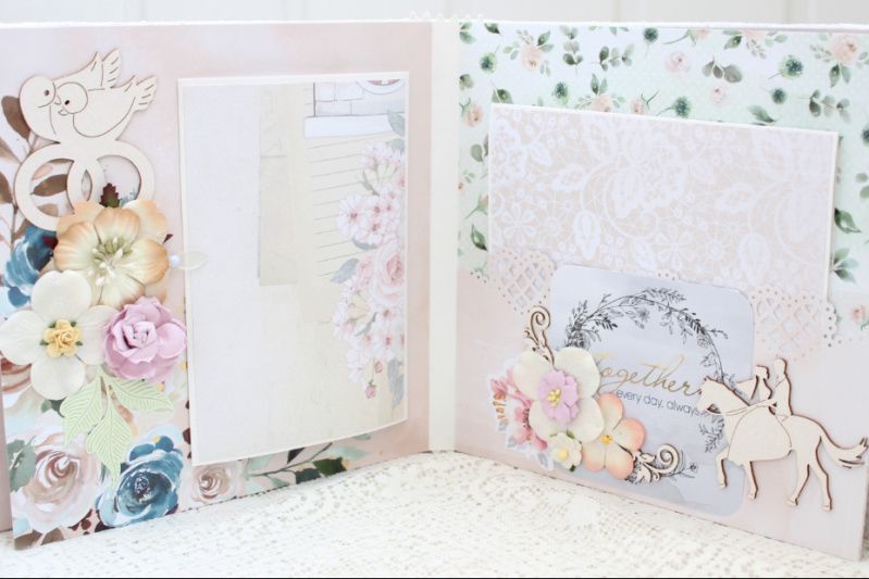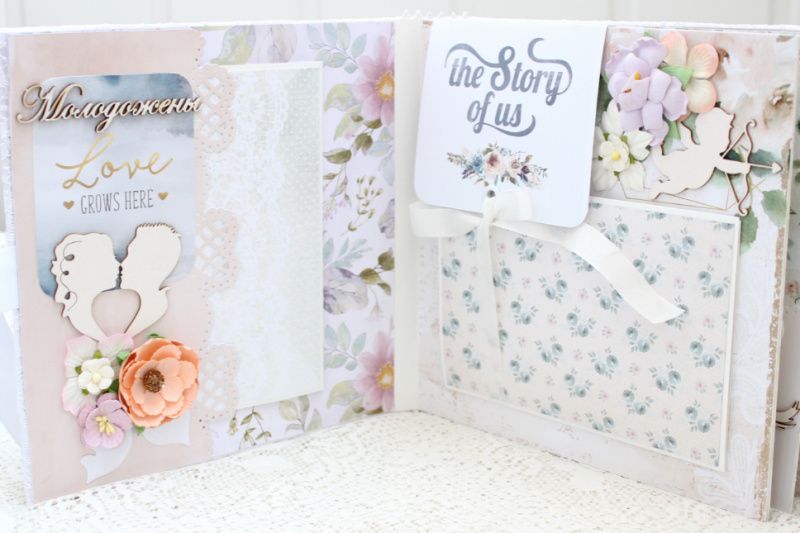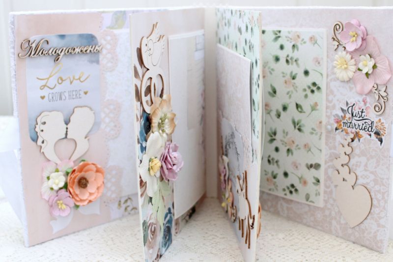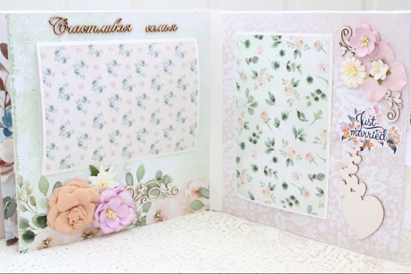 Весільний альбом ручної роботи з безліччю об'ємних квіткових композицій та різноманітних прикрас на кожній сторінці. Формат альбому 20х20 всередині 6 декорованих сторінок розрахований до 25 фотографій.