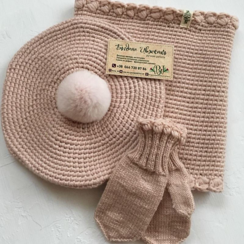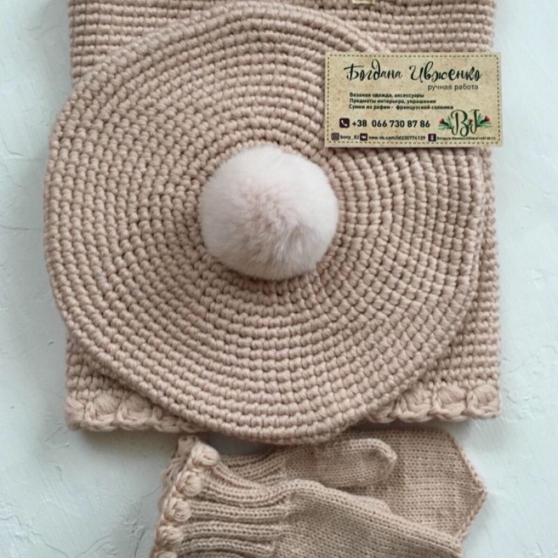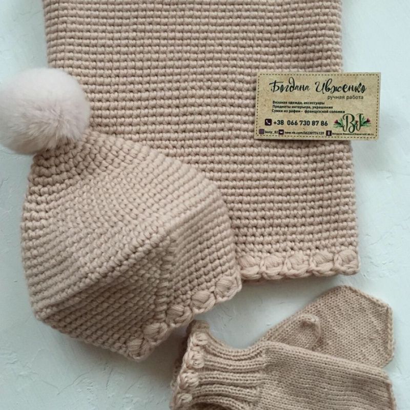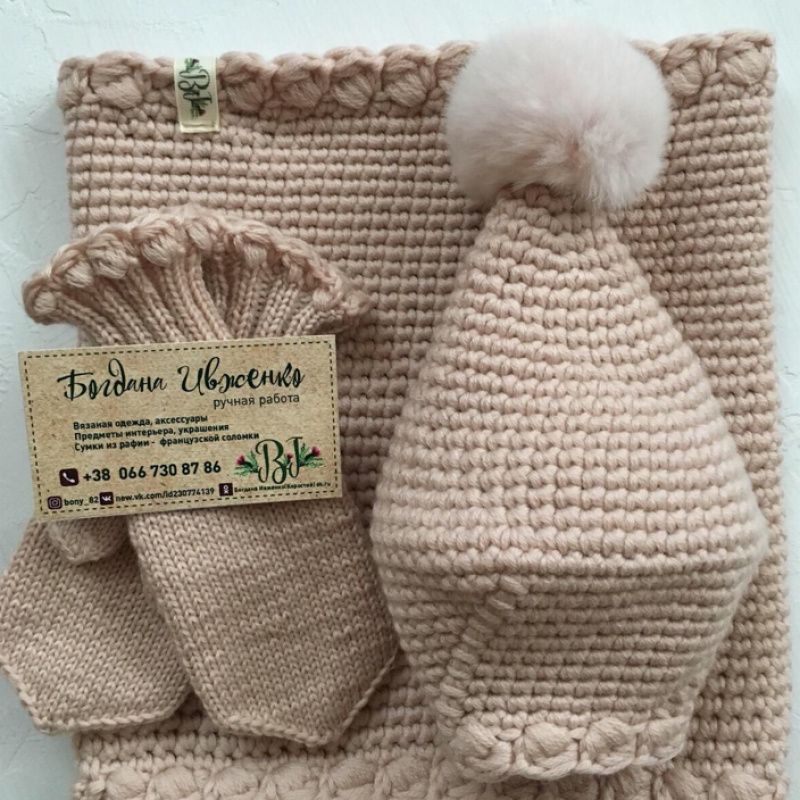 Комплект берет, снуд та рукавички зв’язано із м’якенькоі 100% вовни мериносу виробництва Італія. Можливий повтор у будь-якому кольорі та розмірі