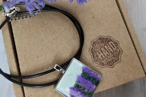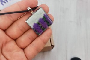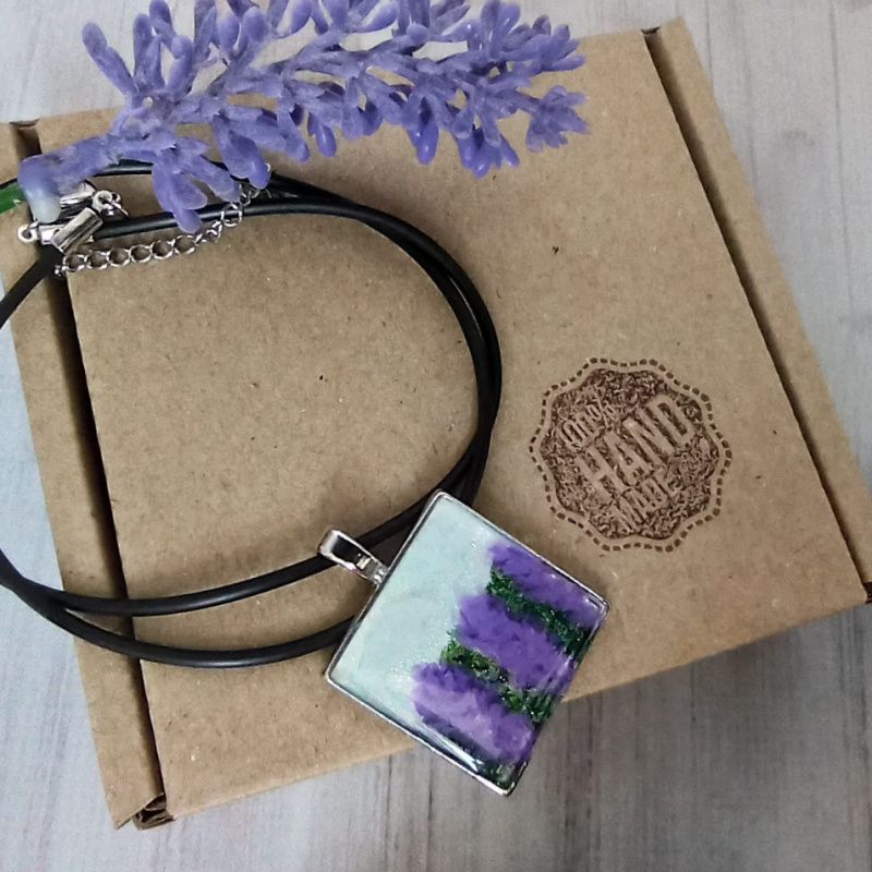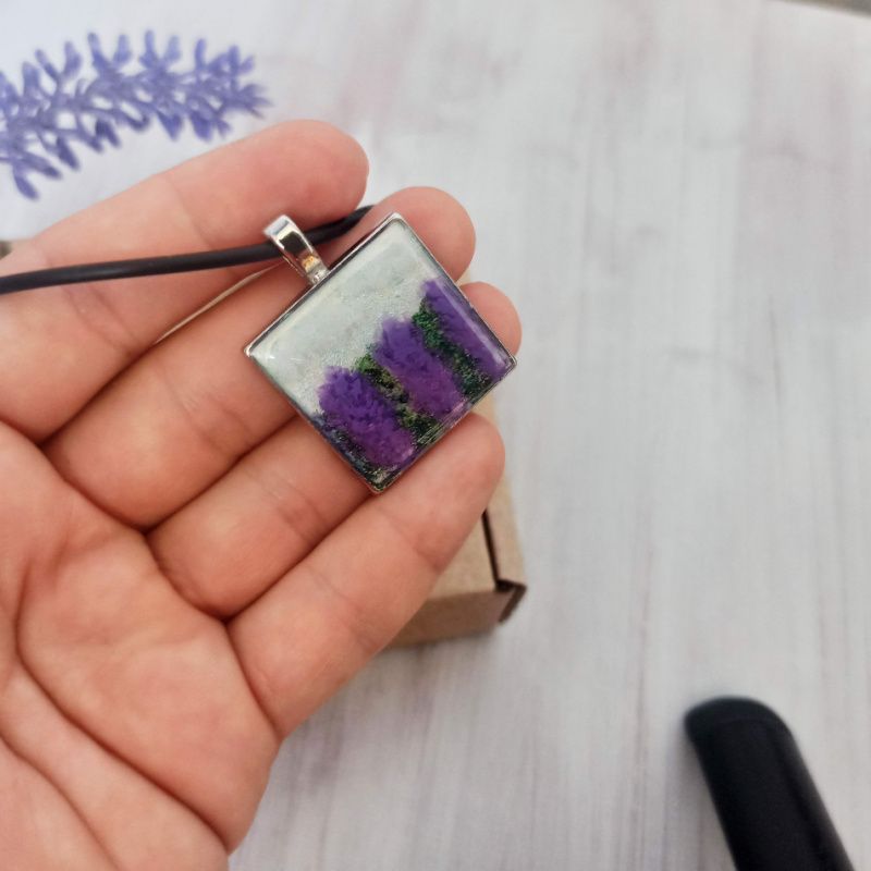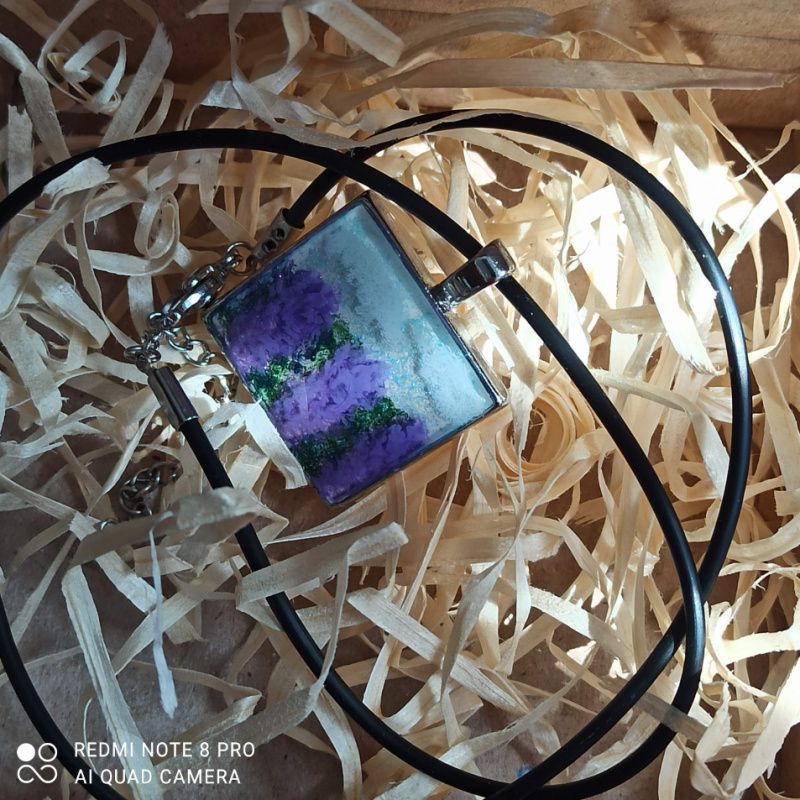 Кулон, із зображенням лавандового поля. Завдяки використанню особливої, авторської техніки заливки епоксидною смолою, картинка маэ 3D ефект. Є ланцюжок подовжувач., Застібка - карабін. Ювелірна епоксидна смола має високу стійкість до подряпин,
