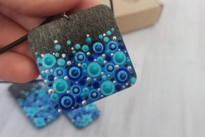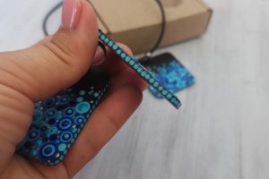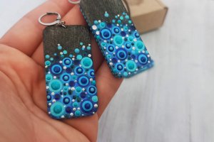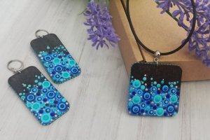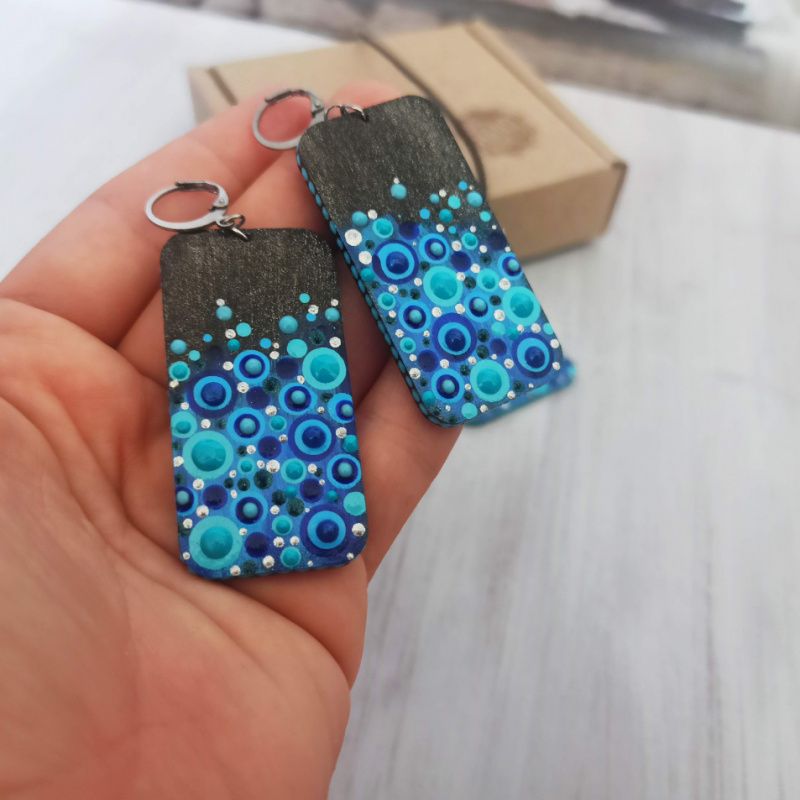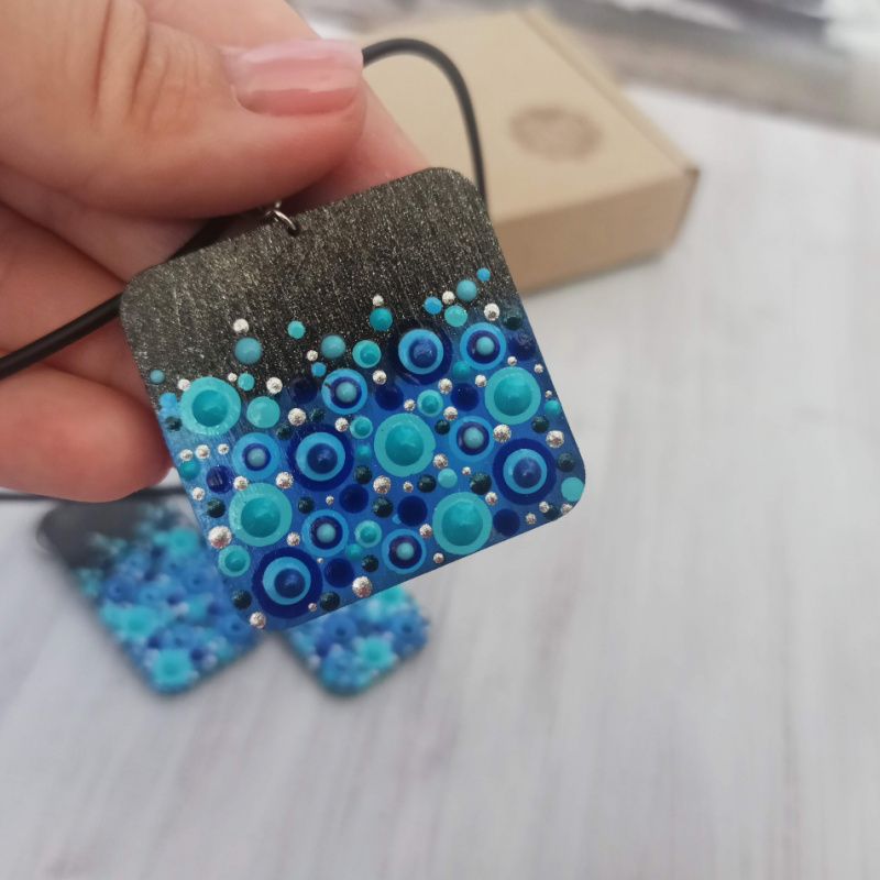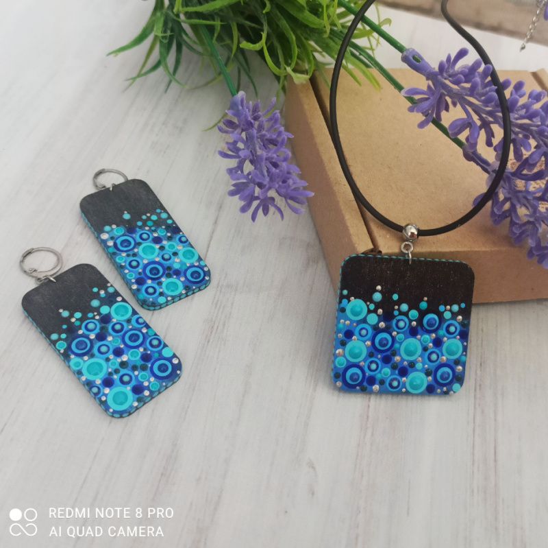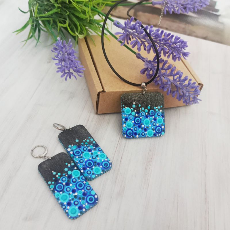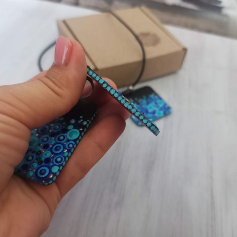 Набір прикрас у синіх тонах. Розписаний в техніці dot art. На сережках надійні застібки із медичного сплаву, що вбереже Ваші вушка від подразнення, На підвісці вся фурнітура також з медичного сплаву, не темніє. Використані виключно гіпоалергенні матеріали. Підвіс кріпиться на силіконовій основі, є ланцюжок-подовжувач, застібка, типу карабін.