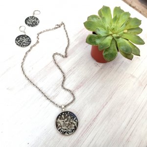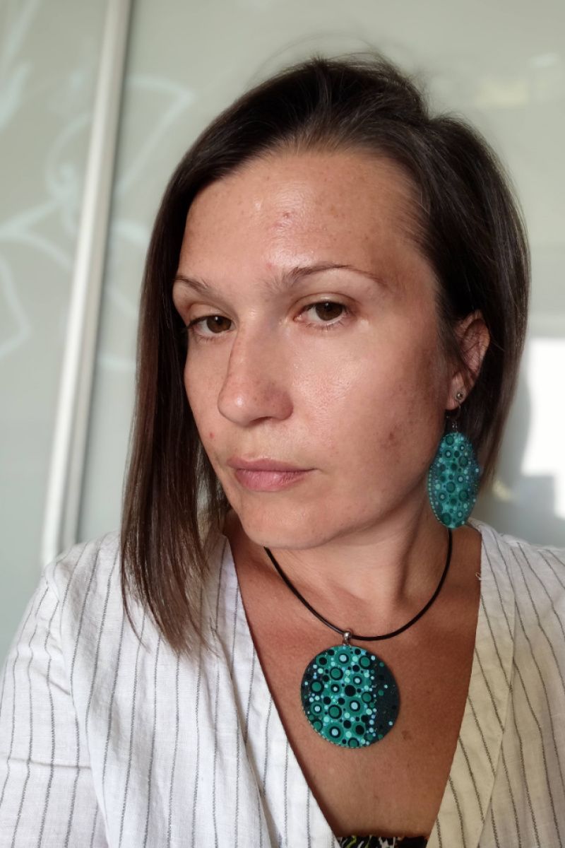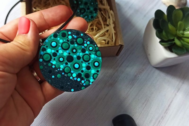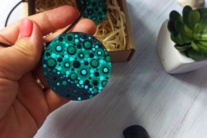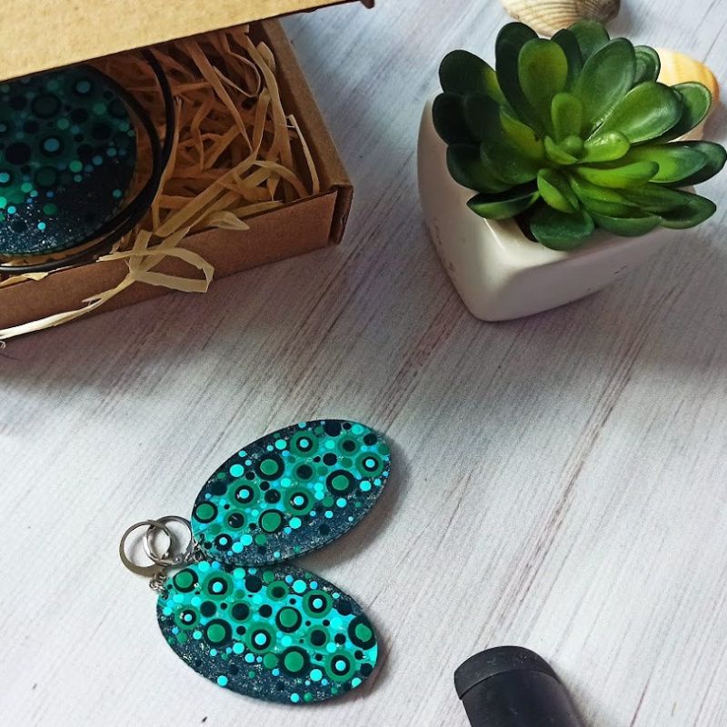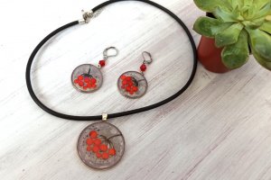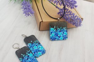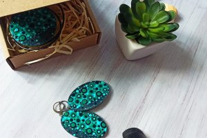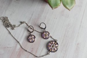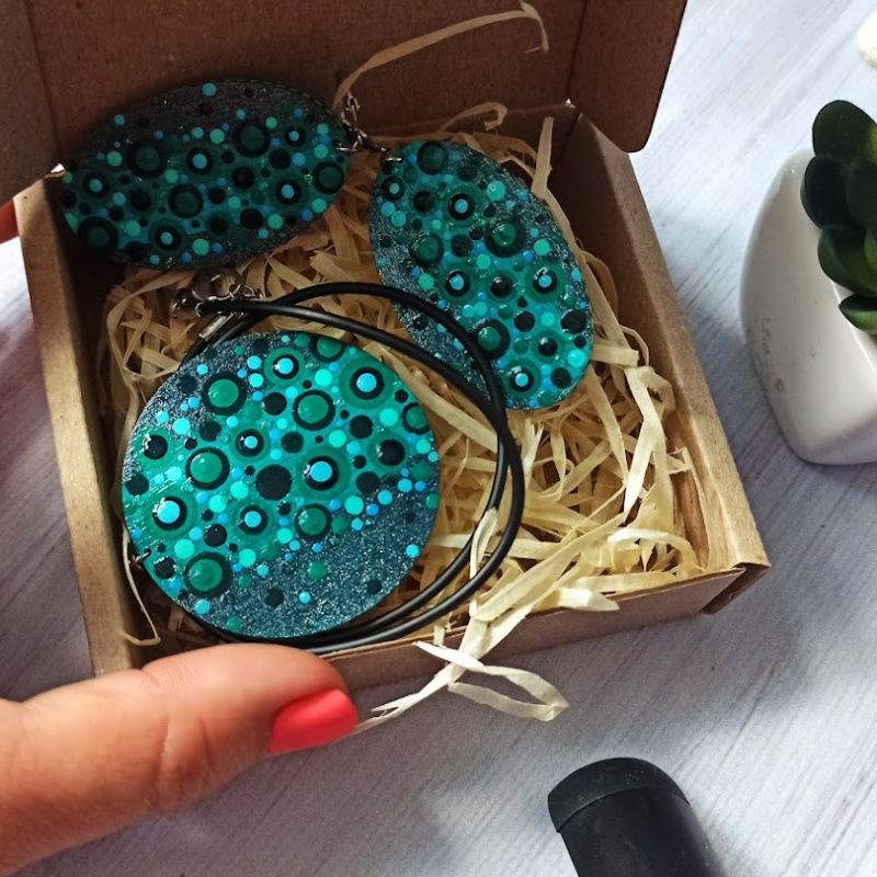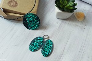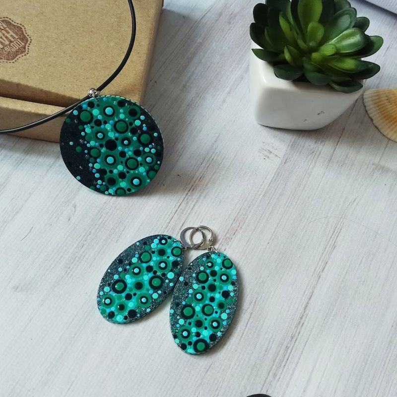Набір прикрас на дерев"яній основі. Розписаний в техніці точкового розпису, акриловими фарбами. Використано особливий прийом, що дає іллюзію об"єму, Розпис захищено трьома шарами акрилового лаку, що дає змогу прикрасам довго зберігати свій вигляд. Використана фурнітура з медичного сплаву. Стійка до потемнінь та забезпечує комфорт Вашим вушкам.