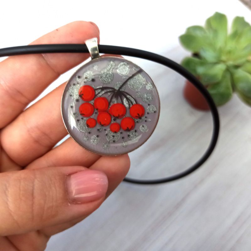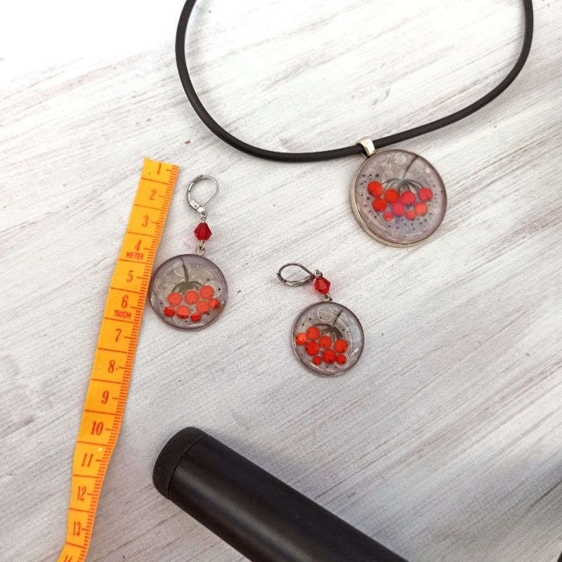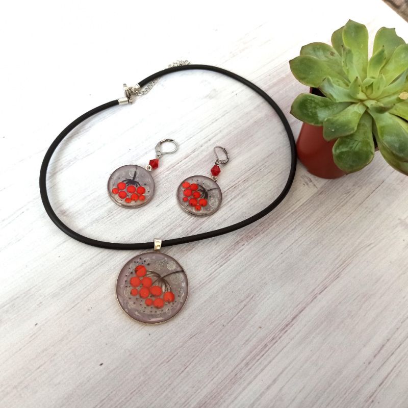 Набір прикрас із зобрраженням гілочки горобини. Використана особлива техніка заливки смоли, що надає розпису ефект 3D. Кулок закріплено на силіконовому шнурі, застібка карабін, із медичного сплаву, як і застібки на сережках, що забезпечить комфорт Вашим вушкам. Діаметр кулону 4см, сережок 2,5 см.