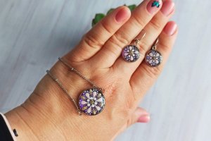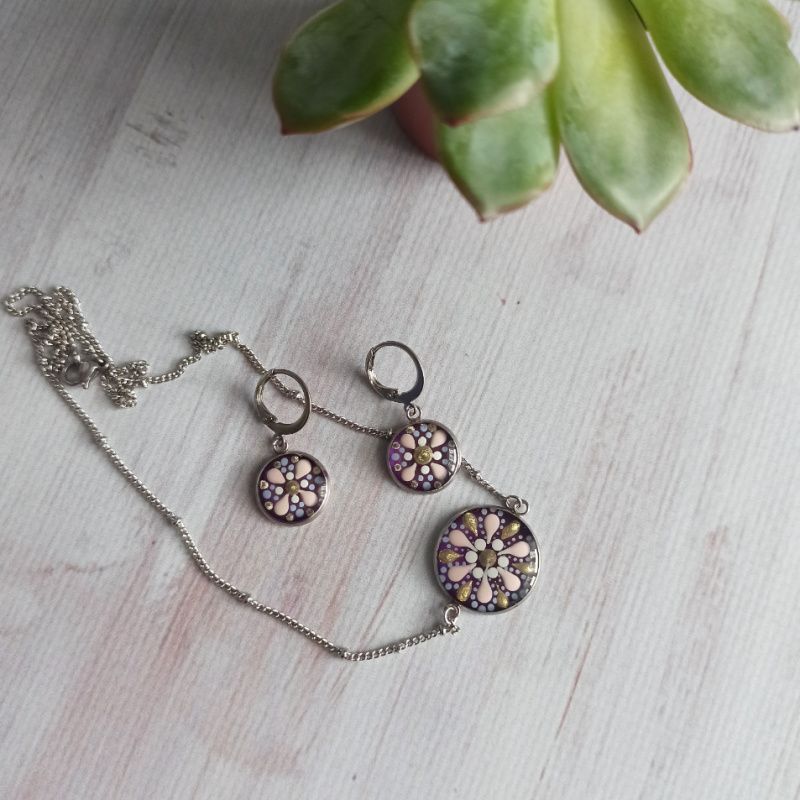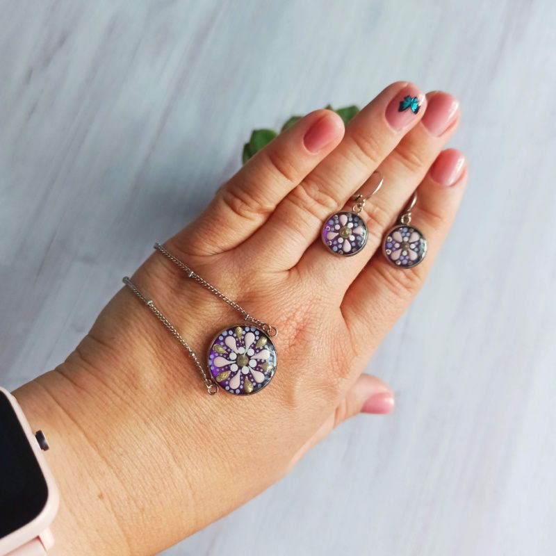 Набор украшений, подвеска и серьги изготовлены в авторской технике. Розписаны и залиты эпоксидной смолой. Фурнитура полностью из медицинского сплава, не темнеет и не вызывает раздражений кожи. Использована эпоксидная смола высокого качества, имеет плотную поверхность. стойкую к царапинам. Удобные, надежные застежки на сережках