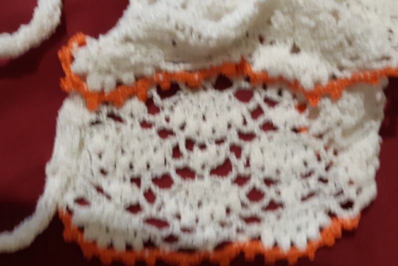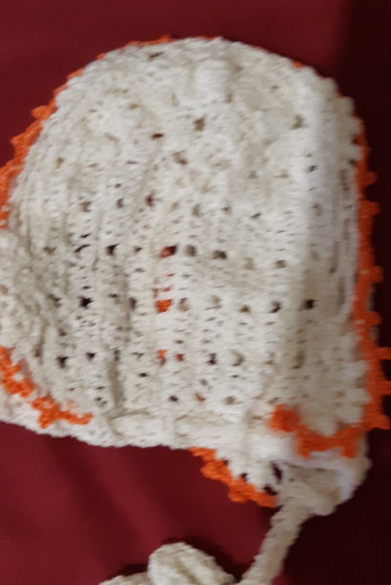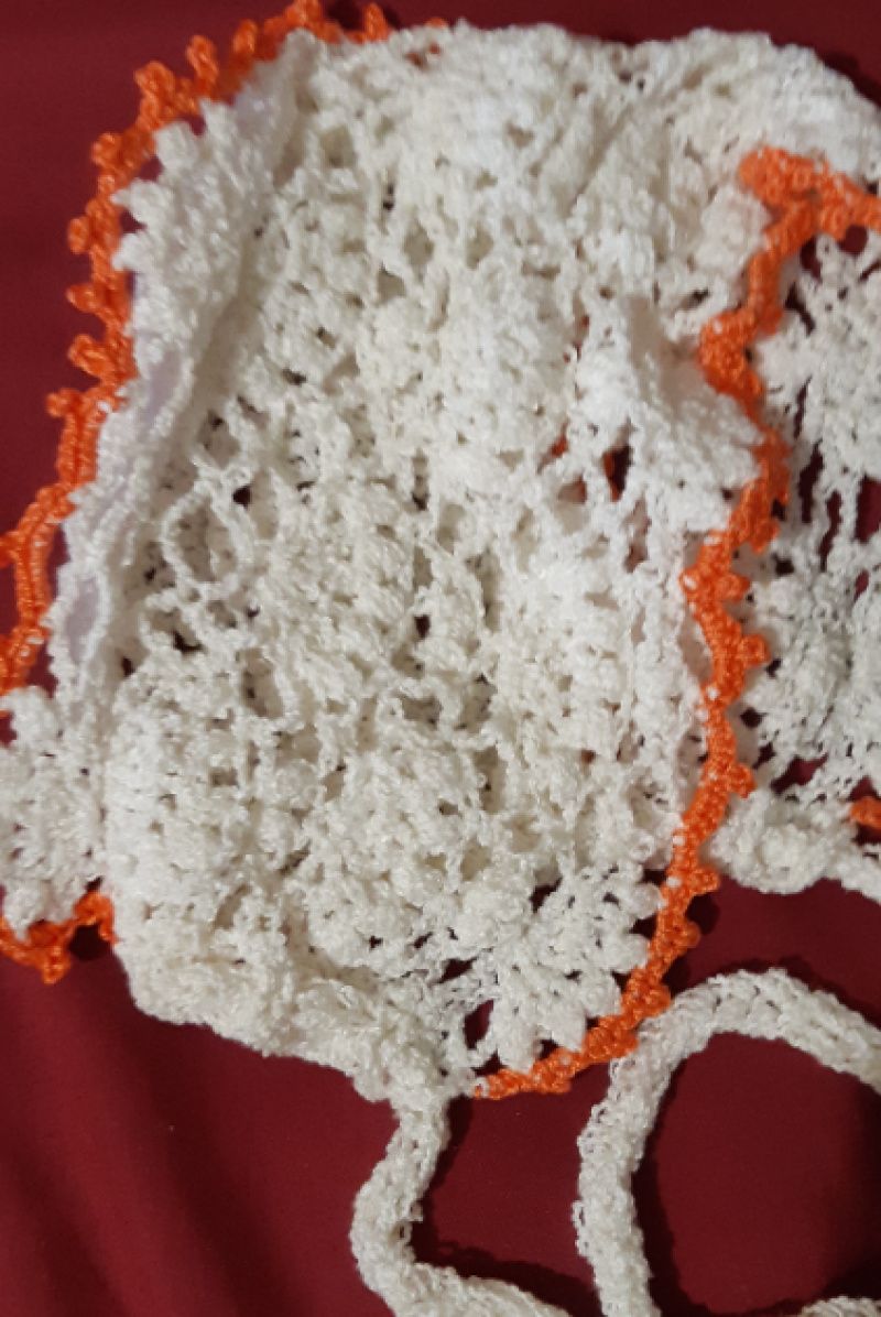 Чепчик для хрещення новонароджених дітей. Пряжа бавовна. Білий чепчик з оранжевою окантовкою. Універсальний.