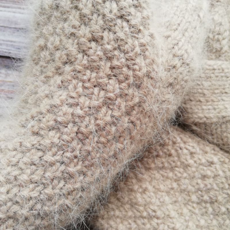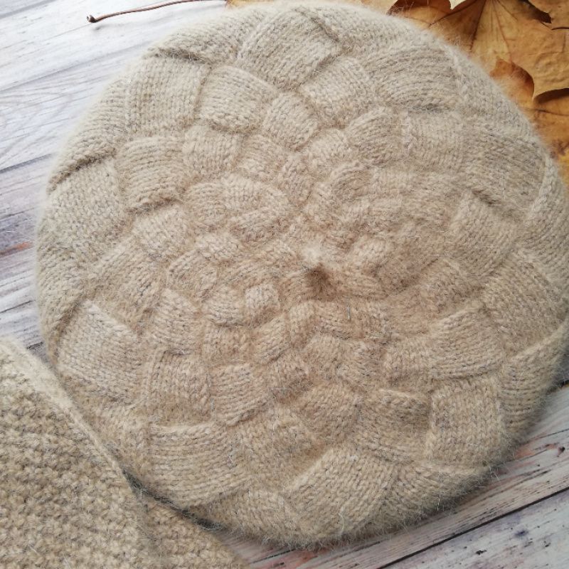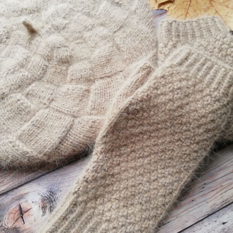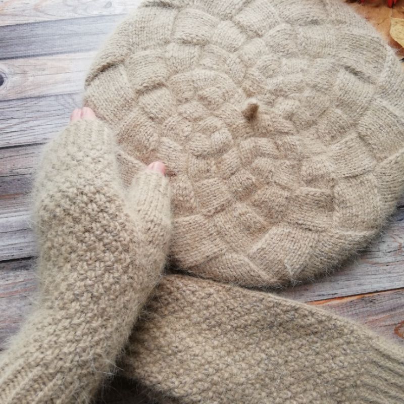 Комплект з берета і мітенок пов'язаний з пуху норки. Бере пов'язаний в техніці ентрелак, відмінно тримає форму, більше схожий на шапочку-берет, розмір 56-58, діаметр 28 - 29. Мітенки на обхват долоні 18-20 см, довжина 23 см Колір ніжний бежевий Догляд - ручне прання в прохолодній воді з рідкісним милом, віджимання в рушник, надати форму у вологому стані. Комплект пройшов обробку
