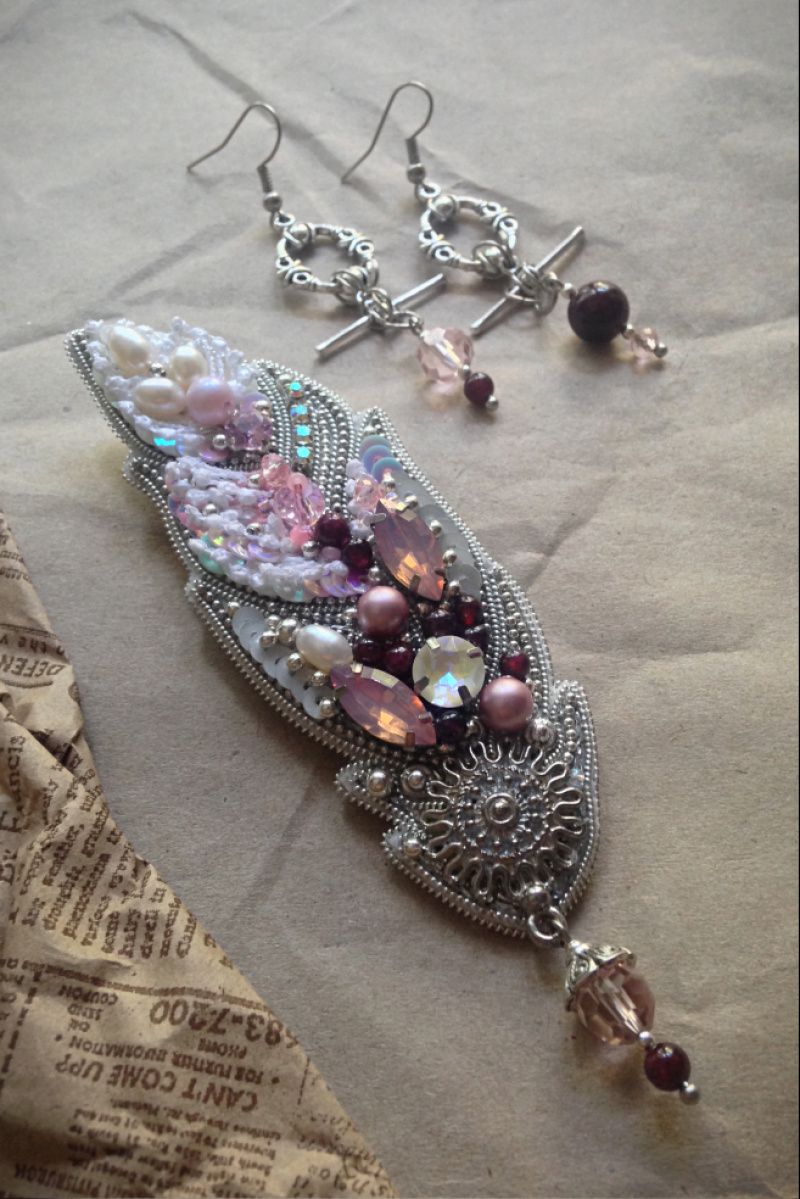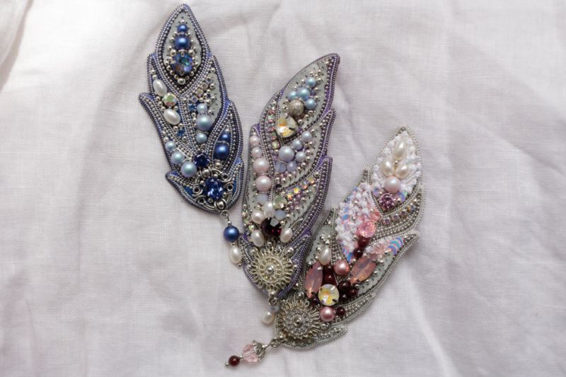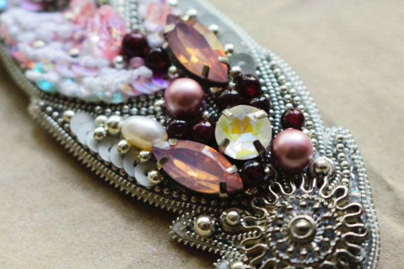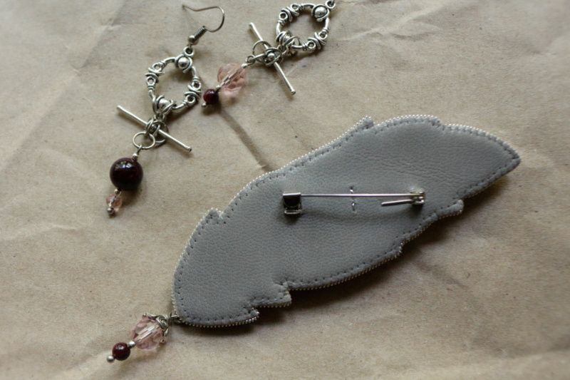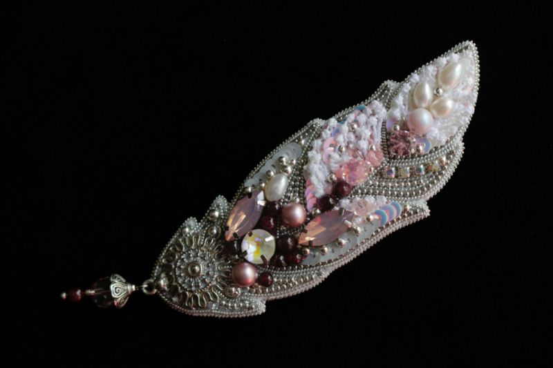 Брошка у формі пір′їни, прикрашена намистинами гранату, перлинами Swaroski, річковими перлами, кристалами з різних матеріалів (скло, цирконій, акрил) і різноманітними компонентами. Зворотний бік - натуральна шкіра.