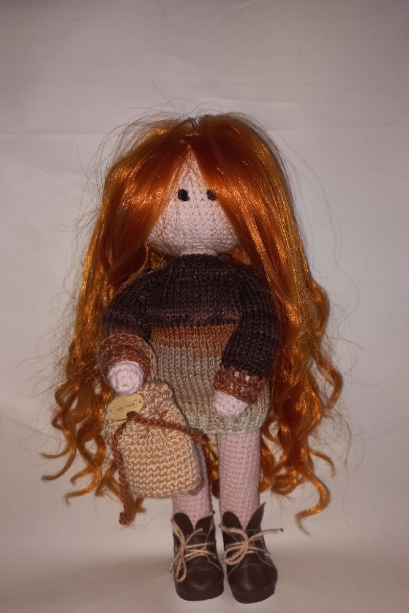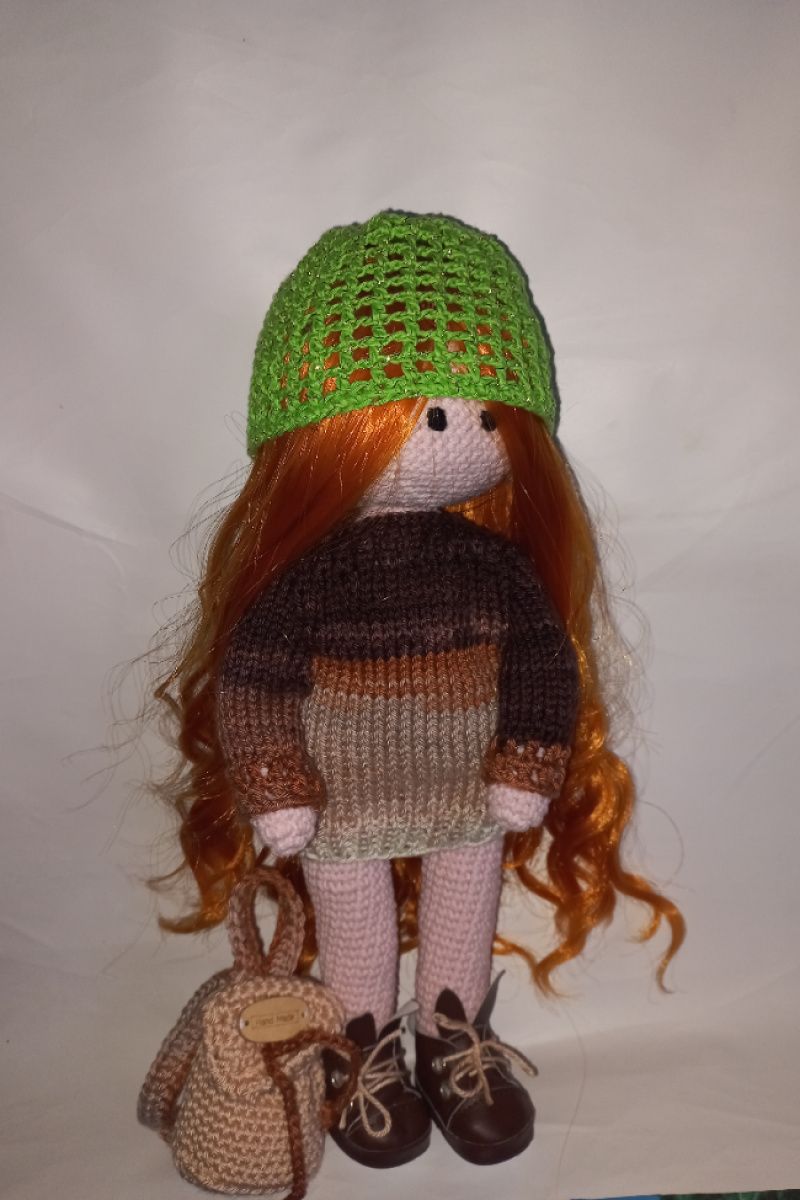 Лялька амігурумі пов'язана гачком, волосся можна зачісувати, ручки згинаються, в руках рюкзак, голова повертається, на ніжках черевики.