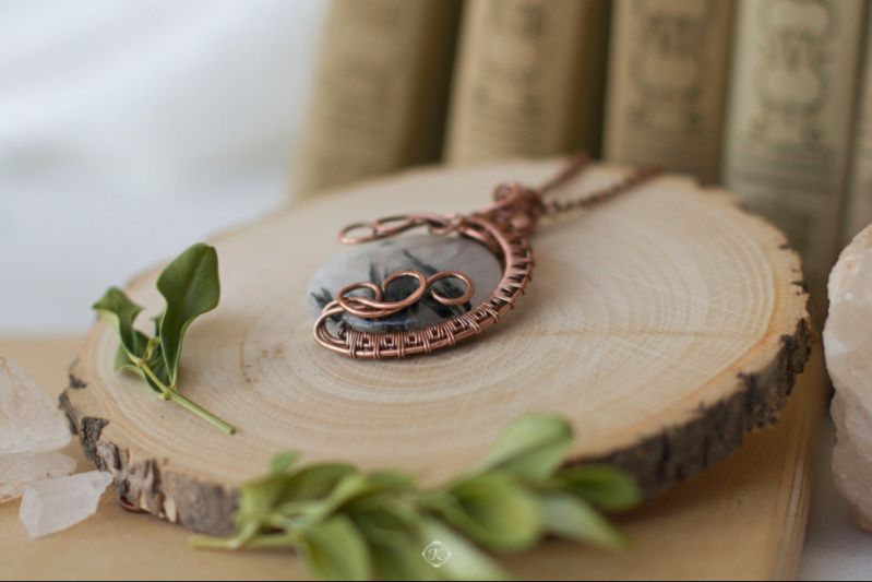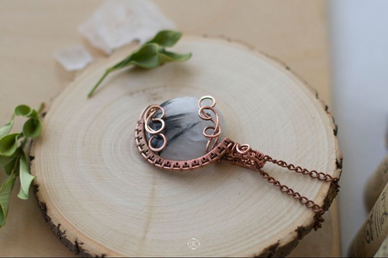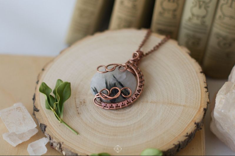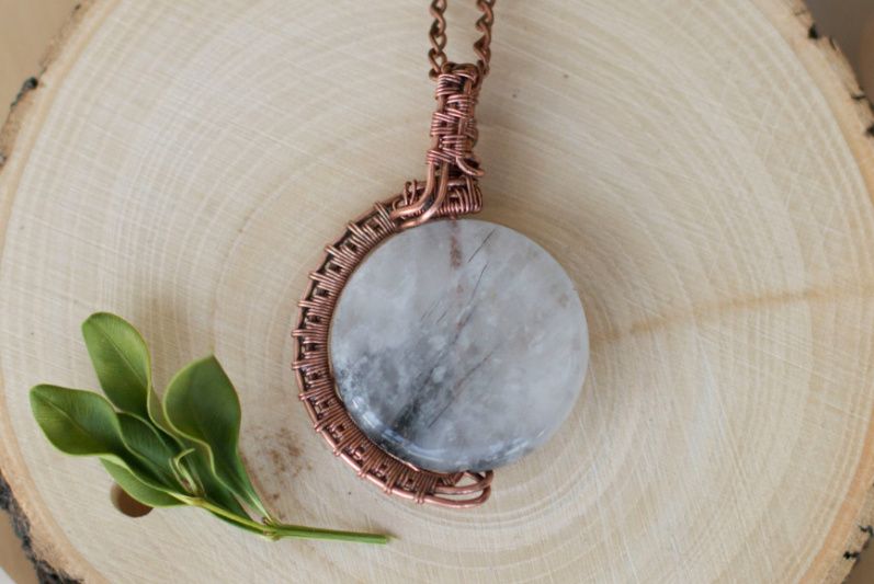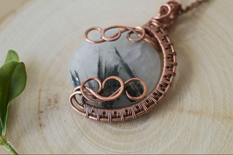 Підвіска оберіг з каменем кварцу і вкрапленнями чорного турмаліну, оповитий в мідь, зачаровує немов місяць. Вона проявляється в умінні згладжувати, заспокоювати, піклується, насичувати все навколо покоїв і умиротворенням. Зверніть увагу на акуратні краю завитків. Я приділяю особливу увагу деталям і ніколи не залишаю просто обрізані краї. Також, родзинкою моделі бути повністю відкрита задня частина каменю. По-перше, при такому плетиві камінь найближче знаходиться до власника, що підсилює його властивості. А по-друге - повністю мінімізується ймовірність зачеплення краю дроту за одяг. Я можу виготовити схожу підвіску але з іншим каменем. обов'язково уточнюйте наявність або можливість замовлення каменю перед замовленням! Виготовлено з мідного дроту в техніці wire wrap. Розмір всього прикраси (з петелькою) 45х30 мм / каменю 25х25 мм Прикраси відправляю протягом 1-2 днів після замовлення. У комплекті йде ланцюжок будь-якої вподобаної Вам довжини.